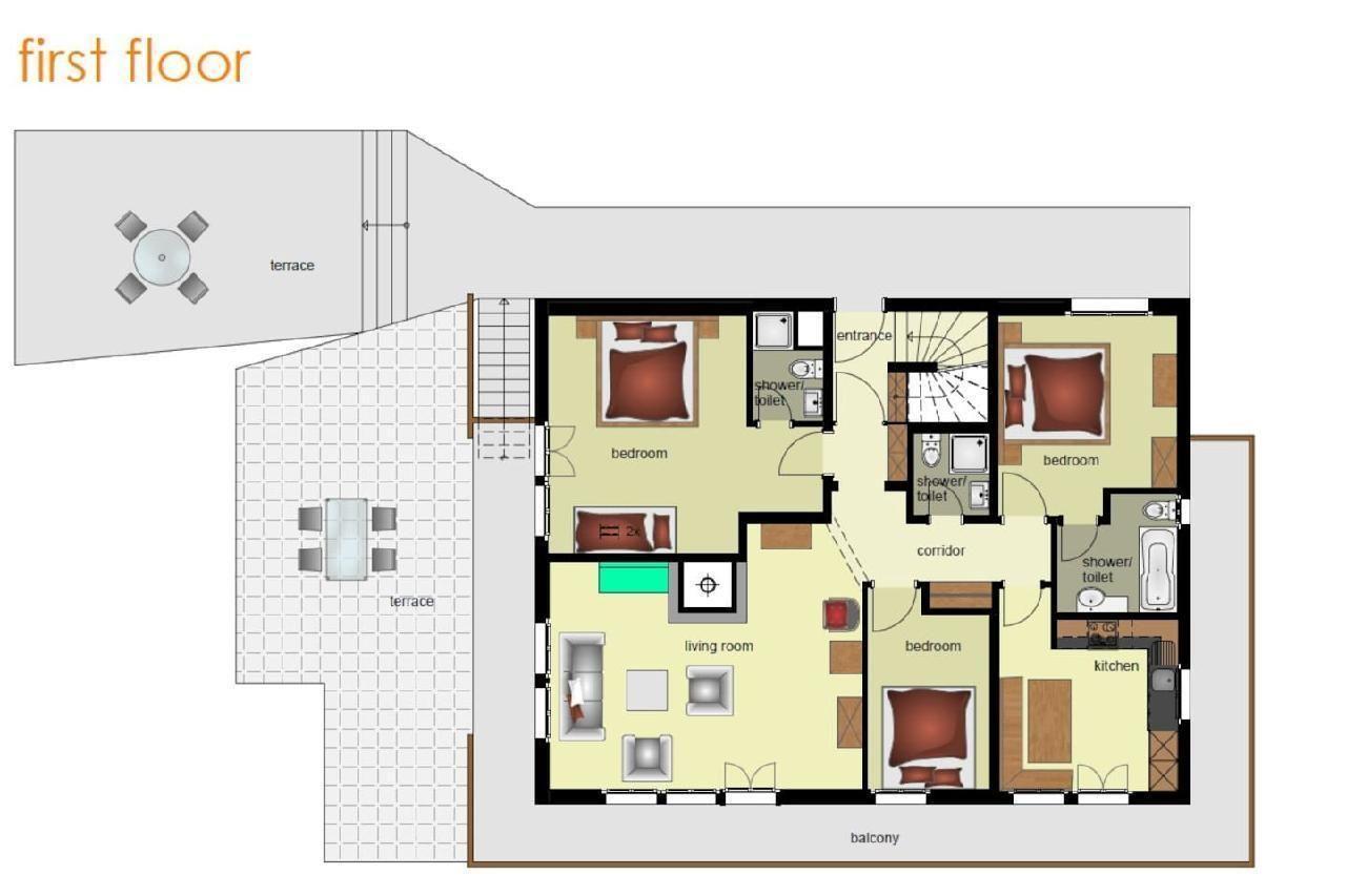 Raumaufteilung: 1 Doppelzimmer mit Badezimmer ensuite. 1 grosses Zimmer mit Doppelbett, Etagenbett und Badezimmer ensuite. 1 Doppelzimmer und separates Badezimmer. 1 Wohnzimmer mit Cheminée. 1 Küche mit Esstisch. Grosse Sonnenterrasse. Balkon. Garten mit Rasenfläche.