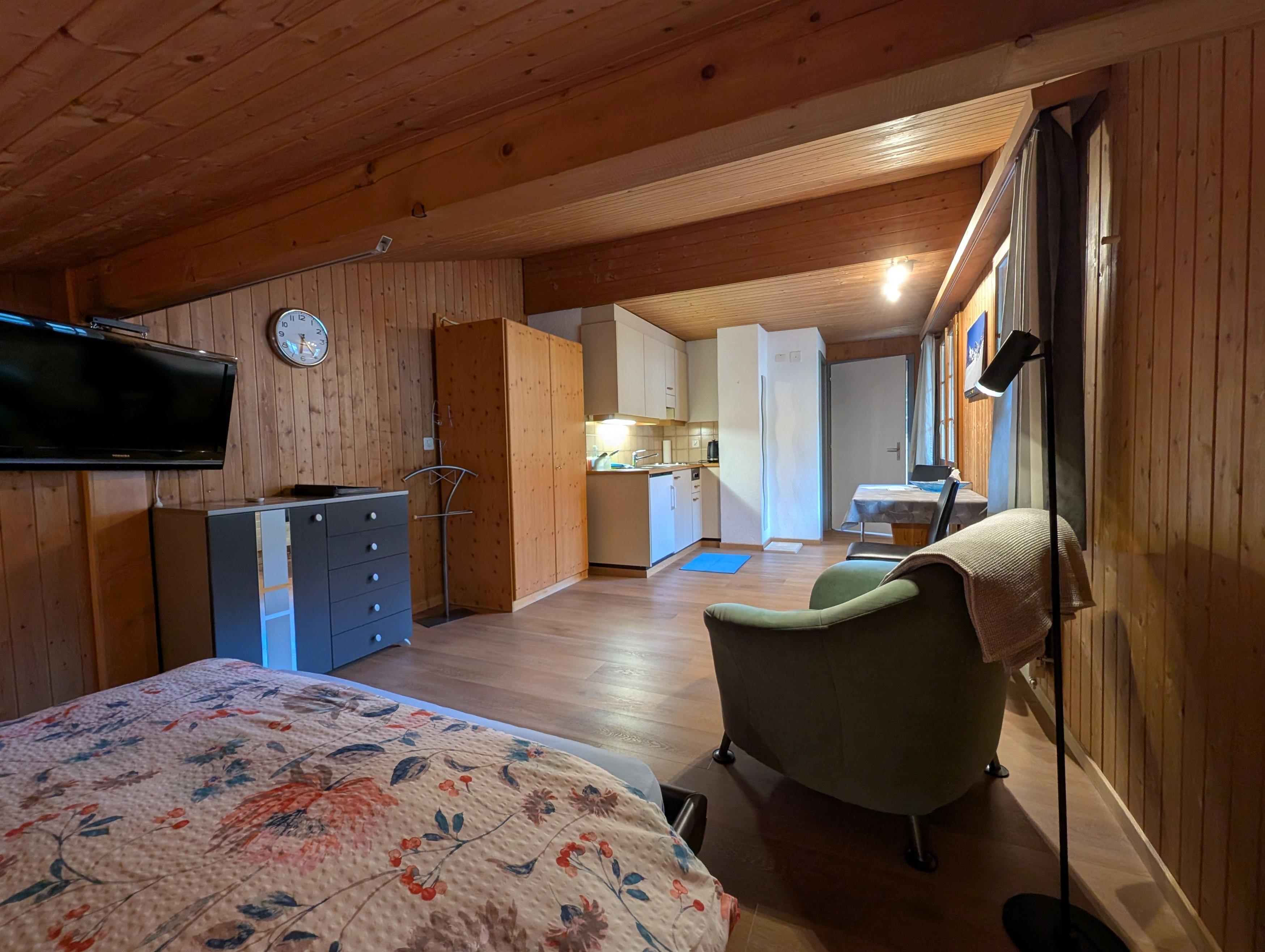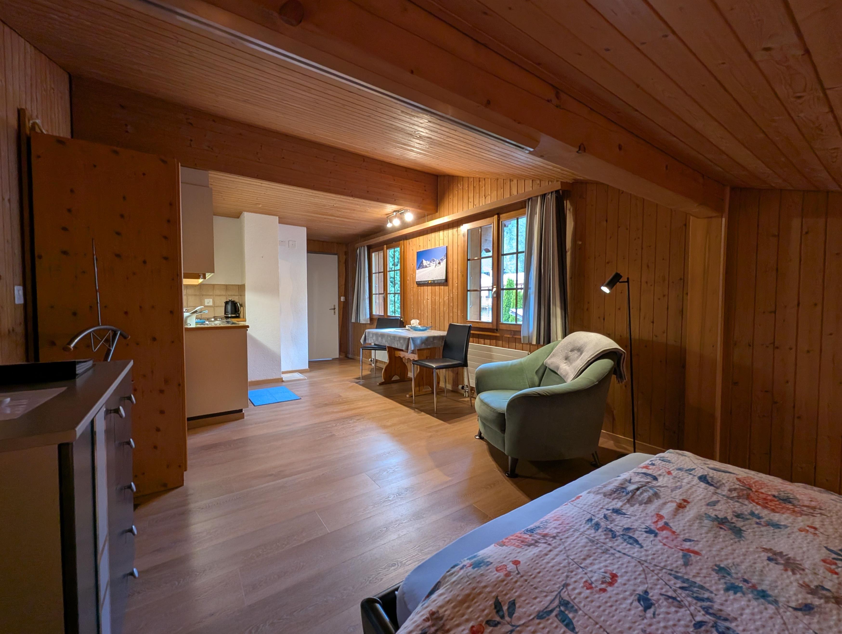 Entdecken Sie die ideale Ferienwohnung für Alleinreisende in Grindelwald, einem Juwel im Kanton Bern. Die charmante 1-Zimmerwohnung befindet sich auf der 2. Etage eines freistehenden Hauses und wurde konzipiert, um Ihren Aufenthalt so angenehm wie möglich zu gestalten. Hier verschmelzen Gemütlichkeit und Funktion zu einem harmonischen Wohnkonzept, das sowohl zum Entspannen als auch zum Erkunden der beeindruckenden Umgebung einlädt.