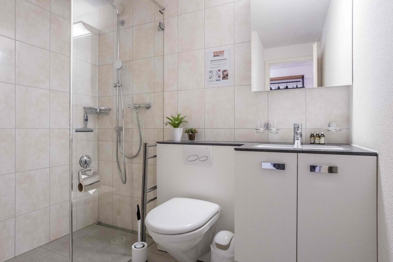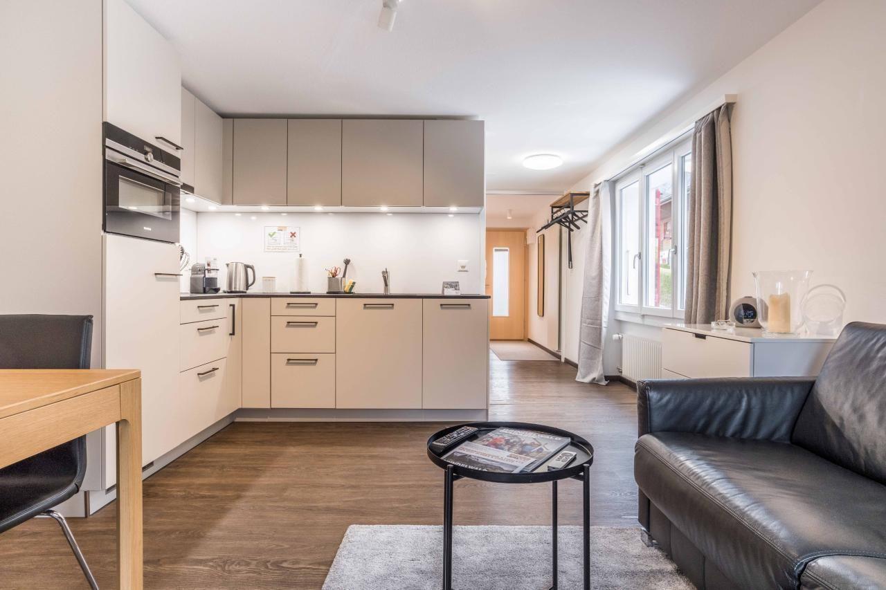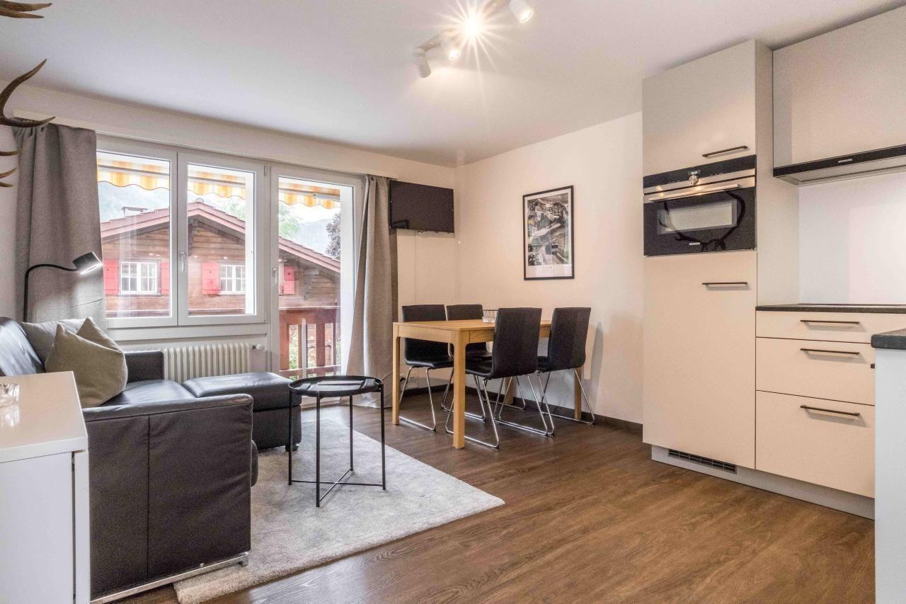 Das gemütliche Studio im Erdgeschoss verfügt über ein Schlafzimmer mit Doppelbett und einem Badezimmer mit Dusche/WC. Die gut ausgestattete Küche öffnet sich gegen einen gemütlichen Wohn- und Essbereich. Auf dem Balkon geniessen Sie die Aussicht auf die Bergwelt von Grindelwald.
