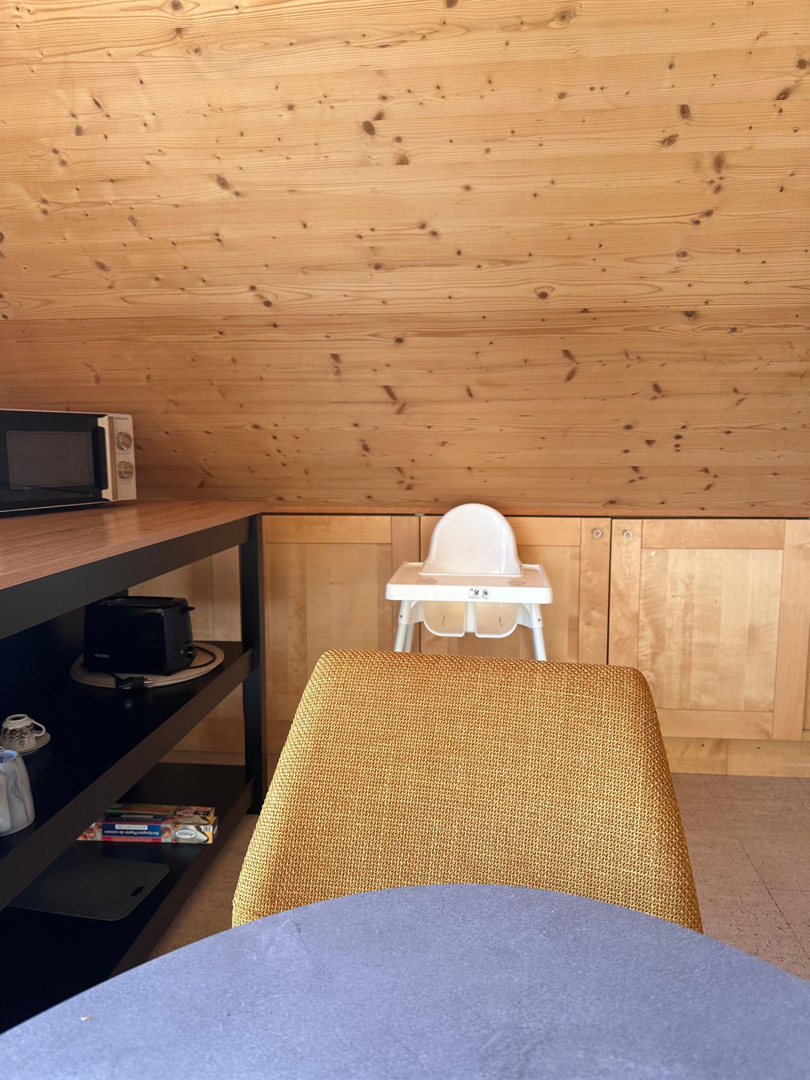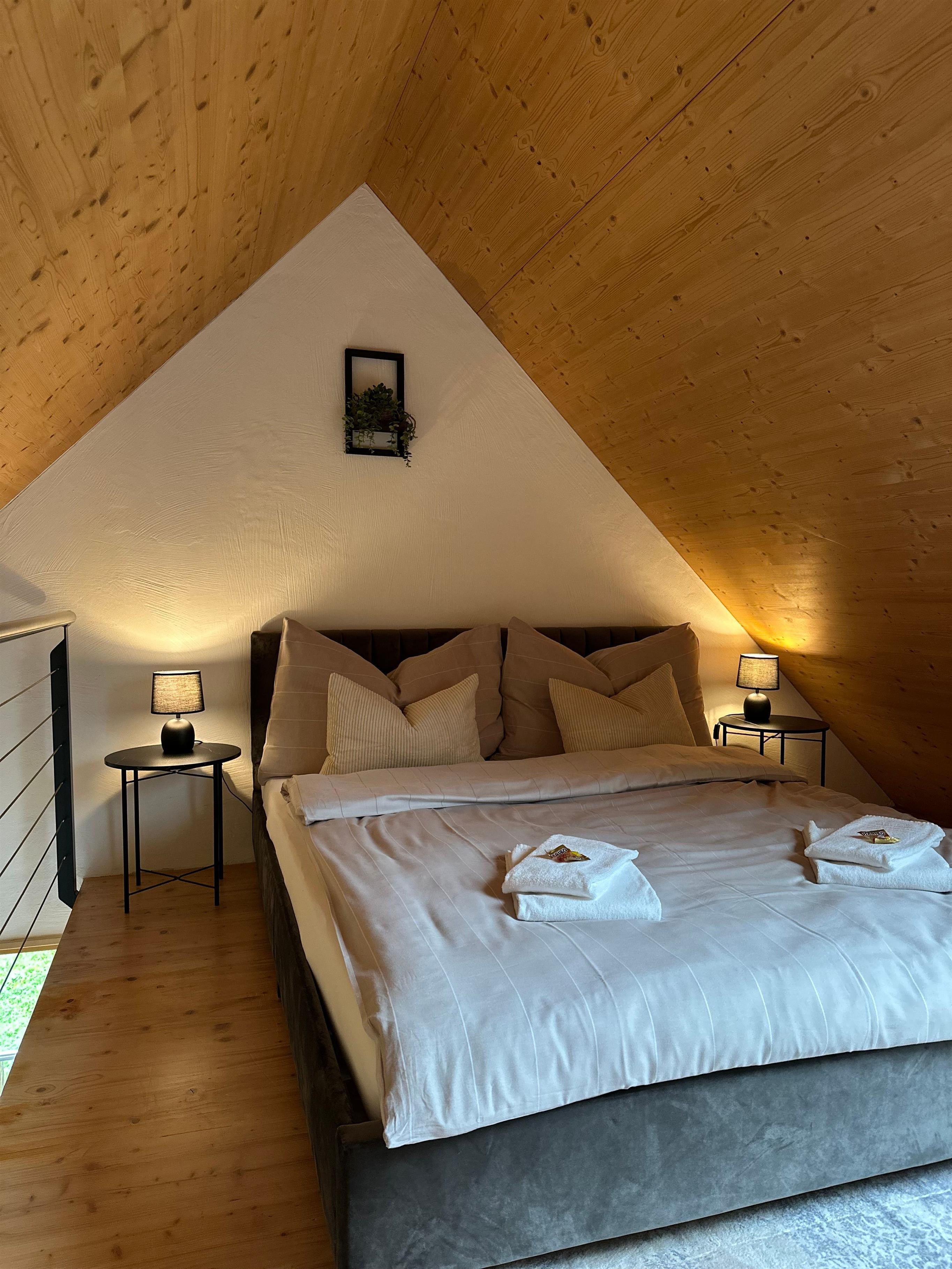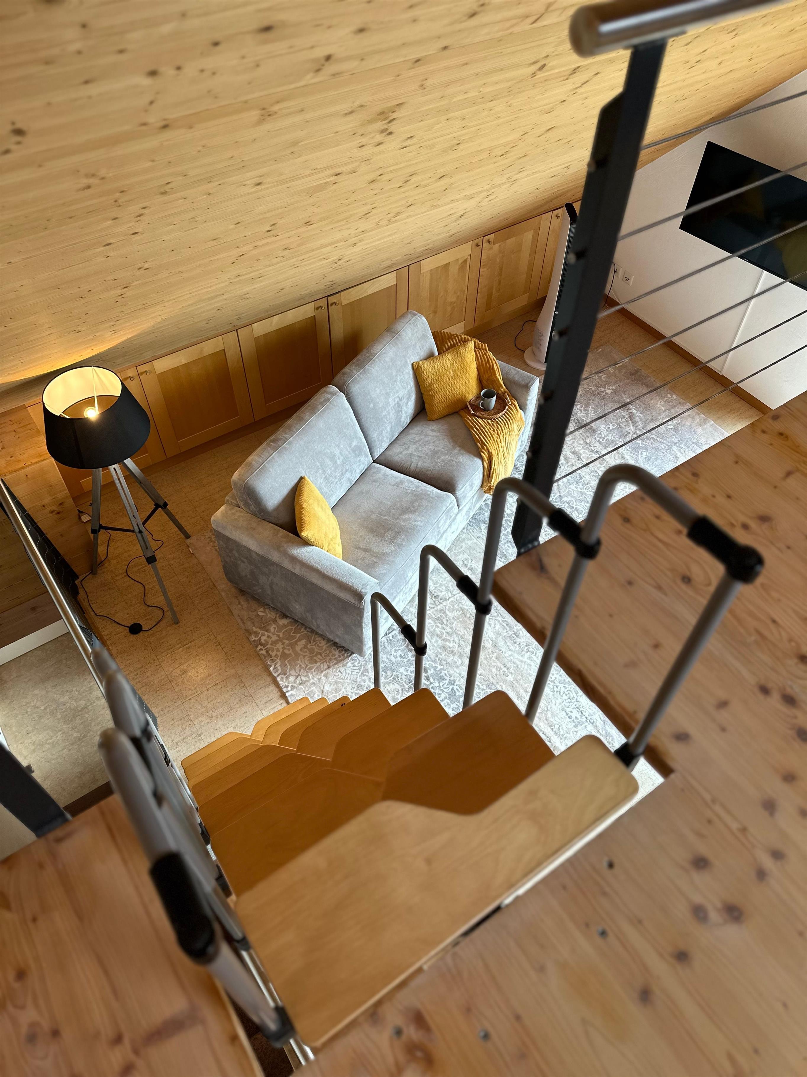 Im Inneren erwarten Sie auf drei Etagen verteilt gemütliche und einladende Räumlichkeiten. Beginnen Sie im unteren Bereich, wo sich ein behagliches Zimmer mit Doppelbett befindet. Eine Etage höher gelangen Sie in den Wohn- und Essbereich, der neben einer Schlafmöglichkeit für zwei weitere Personen auf einem komfortablen Schlafsofa auch einen Esstisch für sechs Personen bietet. Die Küche ist voll ausgestattet und lässt keine Wünsche offen für die Zubereitung köstlicher Mahlzeiten. Über dem Wohnzimmer befindet sich die Galerie, auch hier mit einem komfortablen Doppelbett ausgestattet.