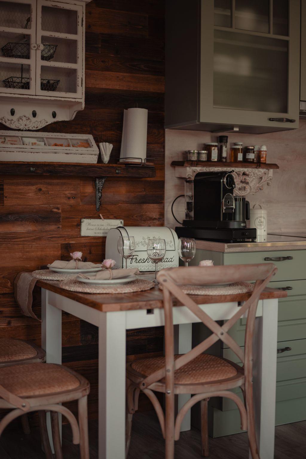 Die voll ausgestattete Küche mit Backofen, Cerankochfeld, Mikrowelle, Geschirrspüler und grossem Kühlschrank (inkl. Gefrierfach) lässt keine Wünsche offen. Grundzutaten wie Gewürze, Öl, Mehl und Zucker stehen bereit.