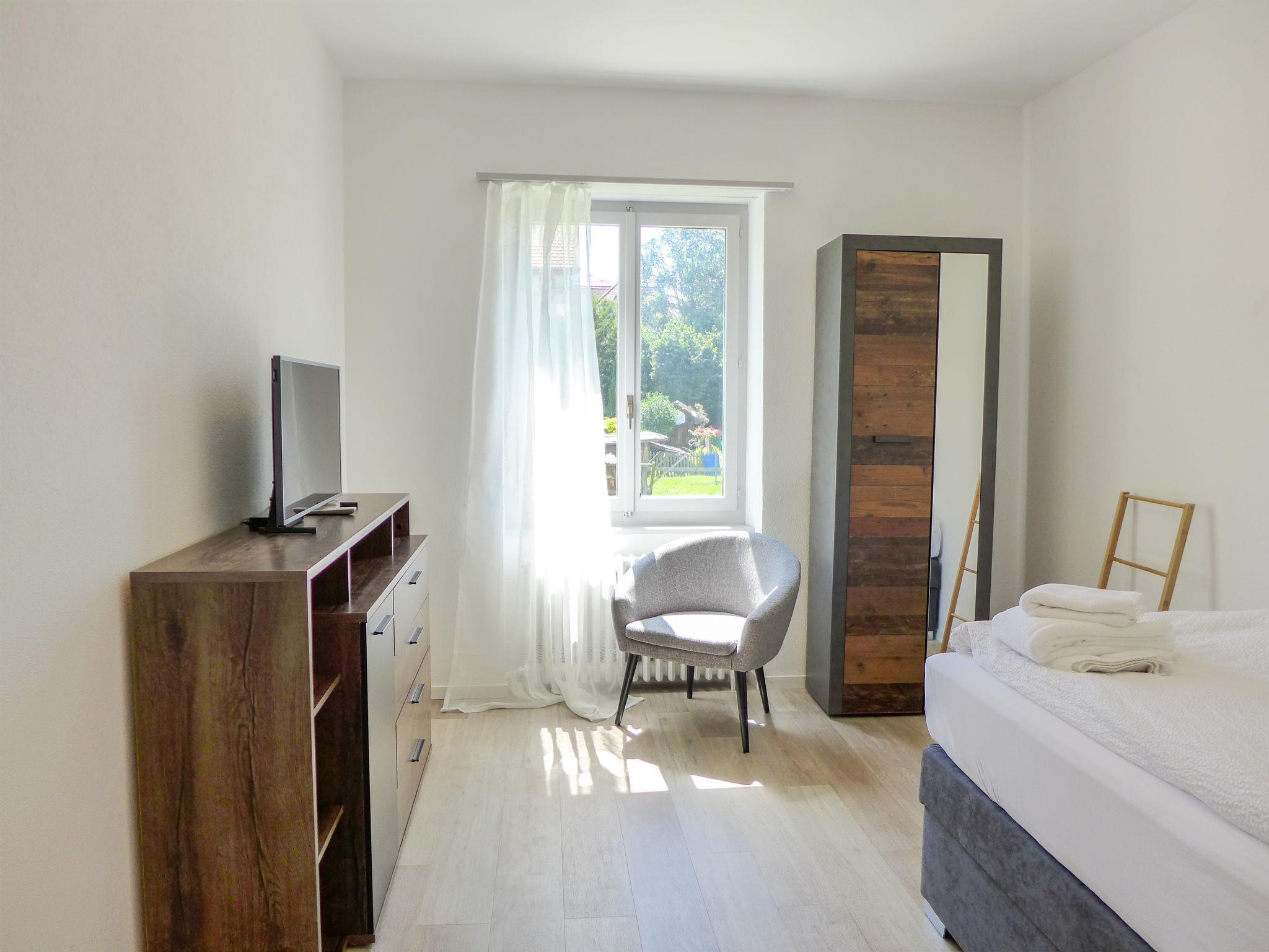 "Henry's 100", 4-Zimmer-Wohnung 100 m2, im erhöhten Erdgeschoss. Geräumig und hell, vollständig renoviert im Jahre 2022, sehr komfortabel und modern eingerichtet: grosses Wohn-/Schlafzimmer mit 1 Doppelbett (180 cm, Länge 200 cm), Kabel-TV. 1 Zimmer mit 1 Doppelbett (160 cm, Länge 200 cm), Kabel-TV. 2 Zimmer, jedes Zimmer mit 1 Bett (120 cm, Länge 200 cm), Kabel-TV. Wohnküche (Geschirrspüler, 4 Induktionskochplatten, Toaster, Wasserkocher, Mikrowelle, elektrische Kaffeemaschine, Kapseln für die Kaffeemaschine (Dolce Gusto) extra) mit Esstisch. Ausgang zum Garten. 2 Duschen/WC. Parkettboden. Eingeschränkte Sicht auf die Berge und die Ortschaft. Zur Verfügung: Haartrockner. Internet (Wireless LAN, gratis). Parkplatz (1 Auto). Bitte beachten: Nichtraucher-Haus. Feuerlöscher.