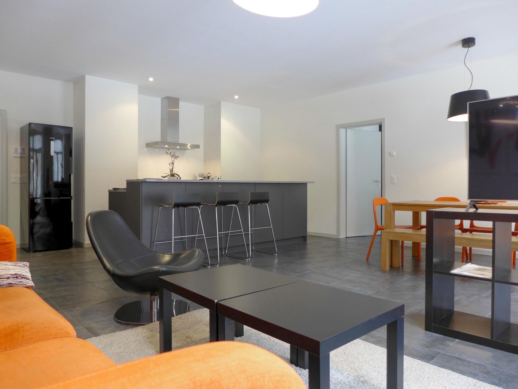 "Modern", 3-Zimmer-Wohnung 90 m2 im 2. Stock. Geräumig und hell, komfortabel und modern eingerichtet: offenes Wohn-/Esszimmer 43 m2 mit Kabel-TV, Digital-TV, Flachbildschirm, Radio und CD. Ausgang zum Balkon. 1 Zimmer 17 m2 mit 1 franz. Bett (160 cm, Länge 200 cm), Dusche/WC und Doppelwaschbecken. Ausgang zum Balkon. 1 Zimmer 15 m2 mit 2 Betten (90 cm, Länge 200 cm), TV (Flachbildschirm). Offene Küche (Backofen, Geschirrspüler, 4 Glaskeramikplatten, Tiefkühler, elektrische Kaffeemaschine, Kochinsel, Kombinationsmikrowelle, Fondue Set (Käse)) mit Bar. Dusche/WC. Fussbodenheizung. 2 kleine Balkone. Balkonmöbel. Sehr schöne Sicht auf die Berge, die Landschaft, die Ortschaft und Höhematte. Zur Verfügung: Waschmaschine, Wäschetrockner, Babybett bis 3 Jahre, Haartrockner. Internet (Wireless LAN, gratis). Parkplatz (1 Auto). Bitte beachten: Nichtraucher-Unterkunft.