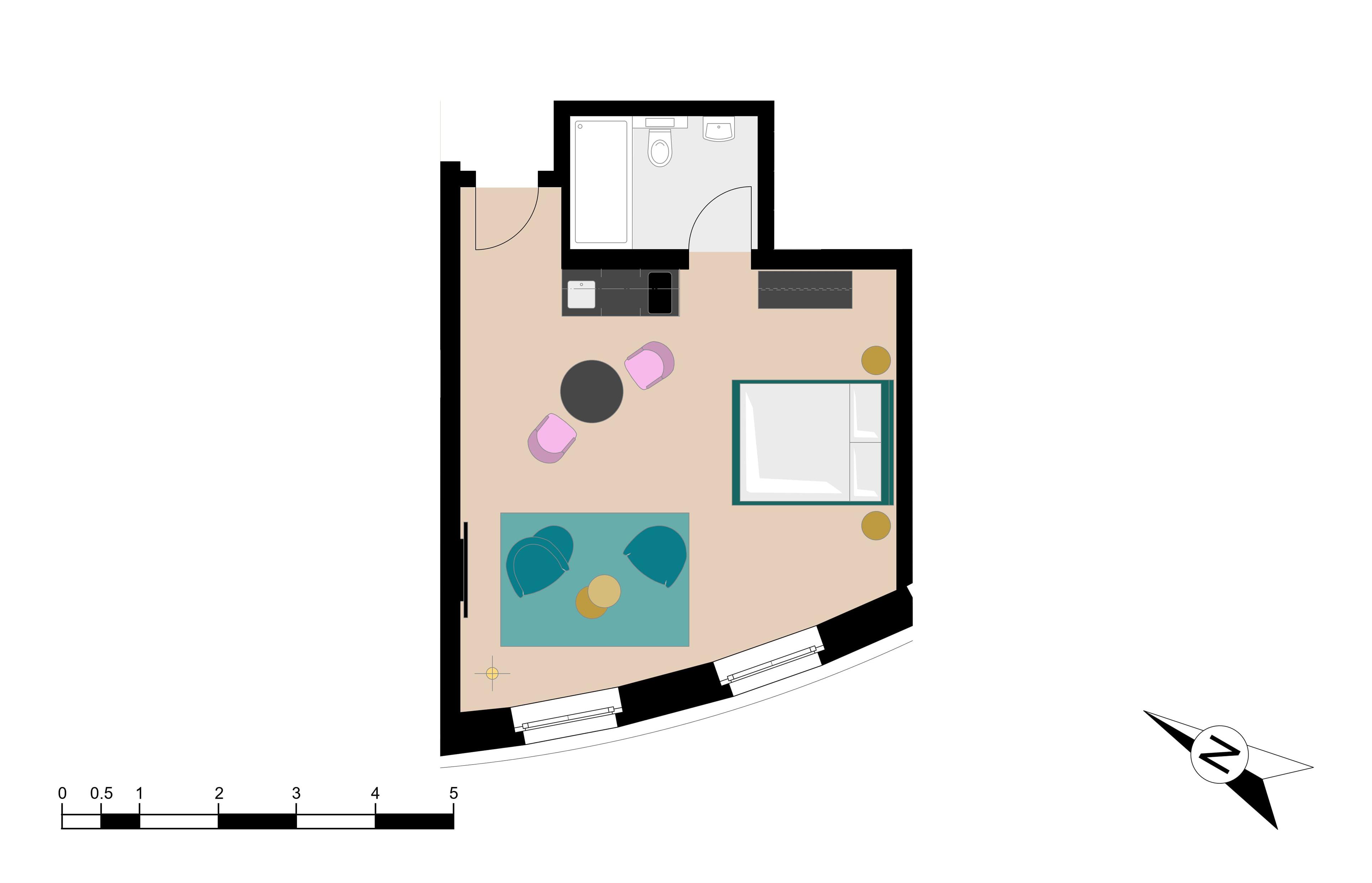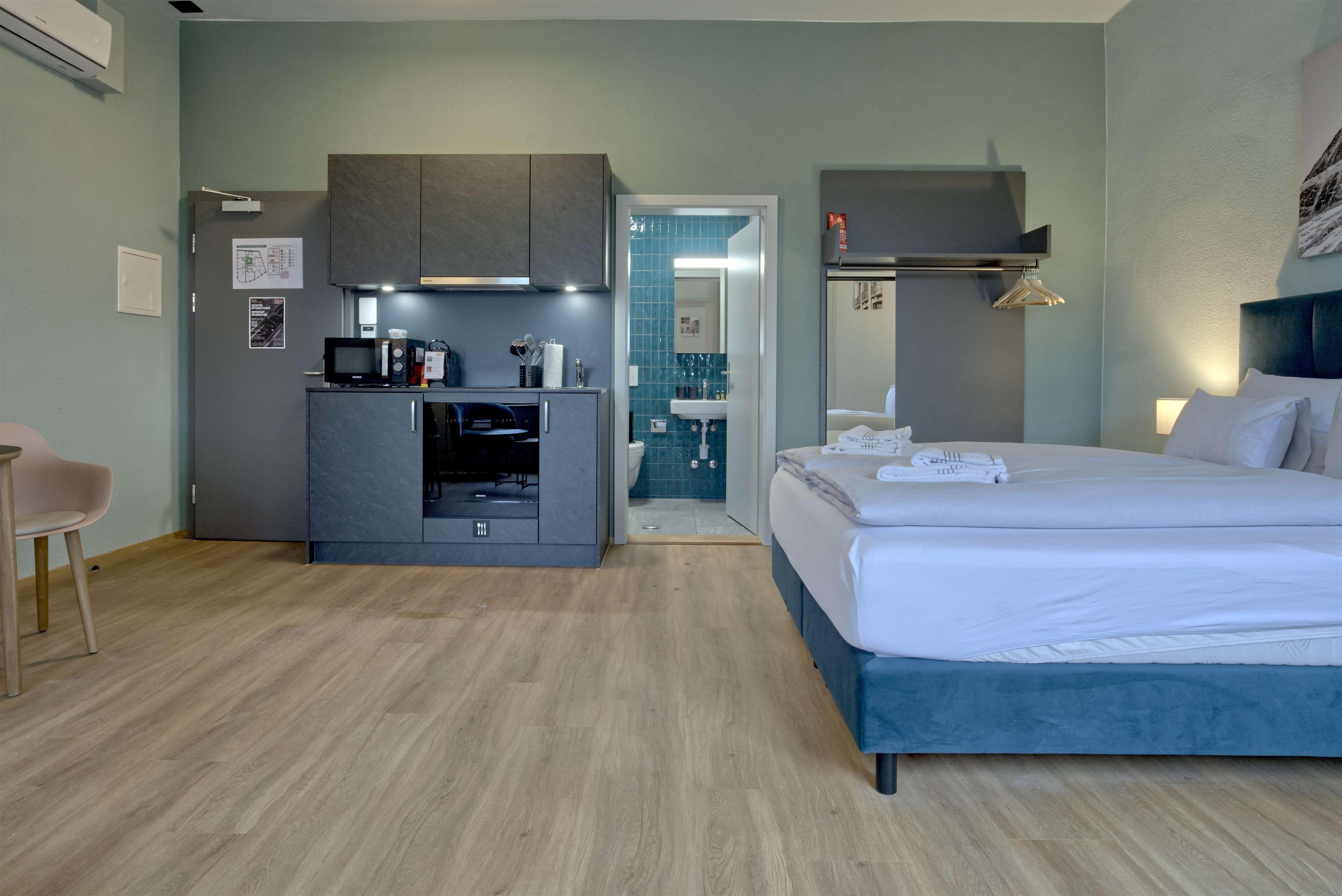 Das offene und grosszügig gestaltete Studio vereint den Schlafbereich mit dem Wohn- und Essbereich in einer harmonischen und gemütlichen Atmosphäre. Der Schlafbereich bietet ein bequemes Doppelbett (160cm x 200cm), das zu erholsamen Nächten einlädt. Der angrenzende Wohnbereich ist einladend und bietet Platz für eine kleine Sitzecke sowie einen Esstisch – ideal für entspannte Stunden. Die moderne Küche mit Kochmöglichkeit, Mikrowelle, Geschirrspüler und Nespresso Kaffeemaschine ist komplett ausgestattet und lässt keine Wünsche offen. Die Unterkunft bietet kostenlose, mitbenutzte Wäschemöglichkeiten.