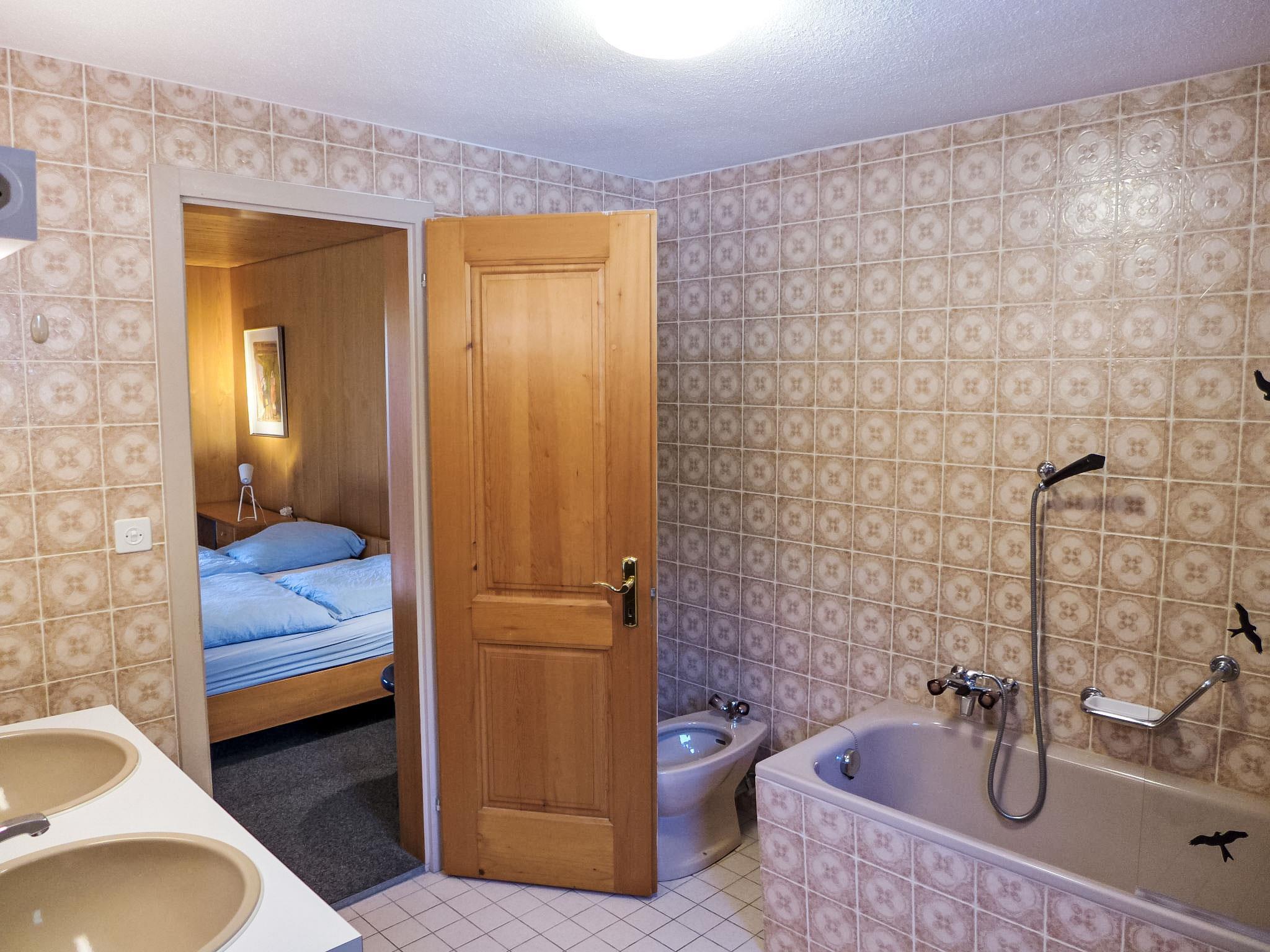 4-Zimmer-Chalet 120 m2 auf 2 Stockwerken, Südwestlage. Geräumig und hell, sehr komfortabel und geschmackvoll eingerichtet: grosses Wohn-/Esszimmer mit Panoramafenster mit offenem Kamin, Essecke, Sat-TV und Radio. Ausgang zum Balkon. 1 grosses Zimmer mit 1 Doppelbett (2 x 90 cm, Länge 200 cm), Bad, Bidet und sep. WC. Grosse Küche (Backofen, Geschirrspüler, 4 Glaskeramikplatten, Mikrowelle, elektrische Kaffeemaschine, Fondue Set (Käse)) mit Durchreiche. Unteres Geschoss: 2 Zimmer, jedes Zimmer mit 2 Betten (90 cm, Länge 200 cm). Dusche/WC. Grosser Balkon, Südlage. Balkonmöbel. Herrliche Panoramasicht auf die Berge, das Tal und die Ortschaft. Zur Verfügung: Waschmaschine, Babybett bis 3 Jahre. Internet (WLAN, gratis). Bitte beachten: geeignet für Familien. Nichtraucher-Unterkunft.