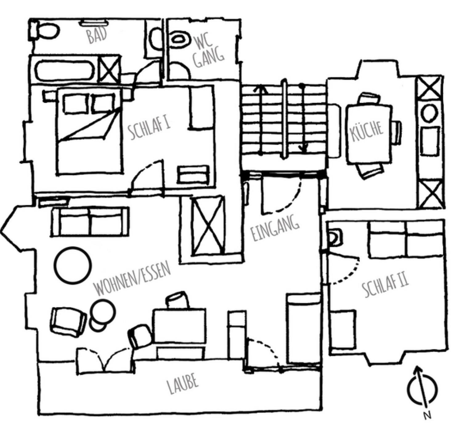 Im Inneren erwartet Sie ein warmes und einladendes Zuhause: Die Wohnung befindet sich im ersten Stock und verfügt über einen eigenen Hauszugang. Sie bietet ein Schlafzimmer mit einem Doppelbett (160x200 cm) und direktem Zugang zu einem Badezimmer mit Dusche und Badewanne. Ein weiteres Schlafzimmer ist mit zwei Einzelbetten (je 90x200 cm) und einem Lavabo ausgestattet. Im gemütlichen Wohn-/Essbereich lädt das Cheminée zu entspannten Stunden ein, während die separate, voll ausgestattete Küche mit Esstisch alle Möglichkeiten zum Kochen bietet.