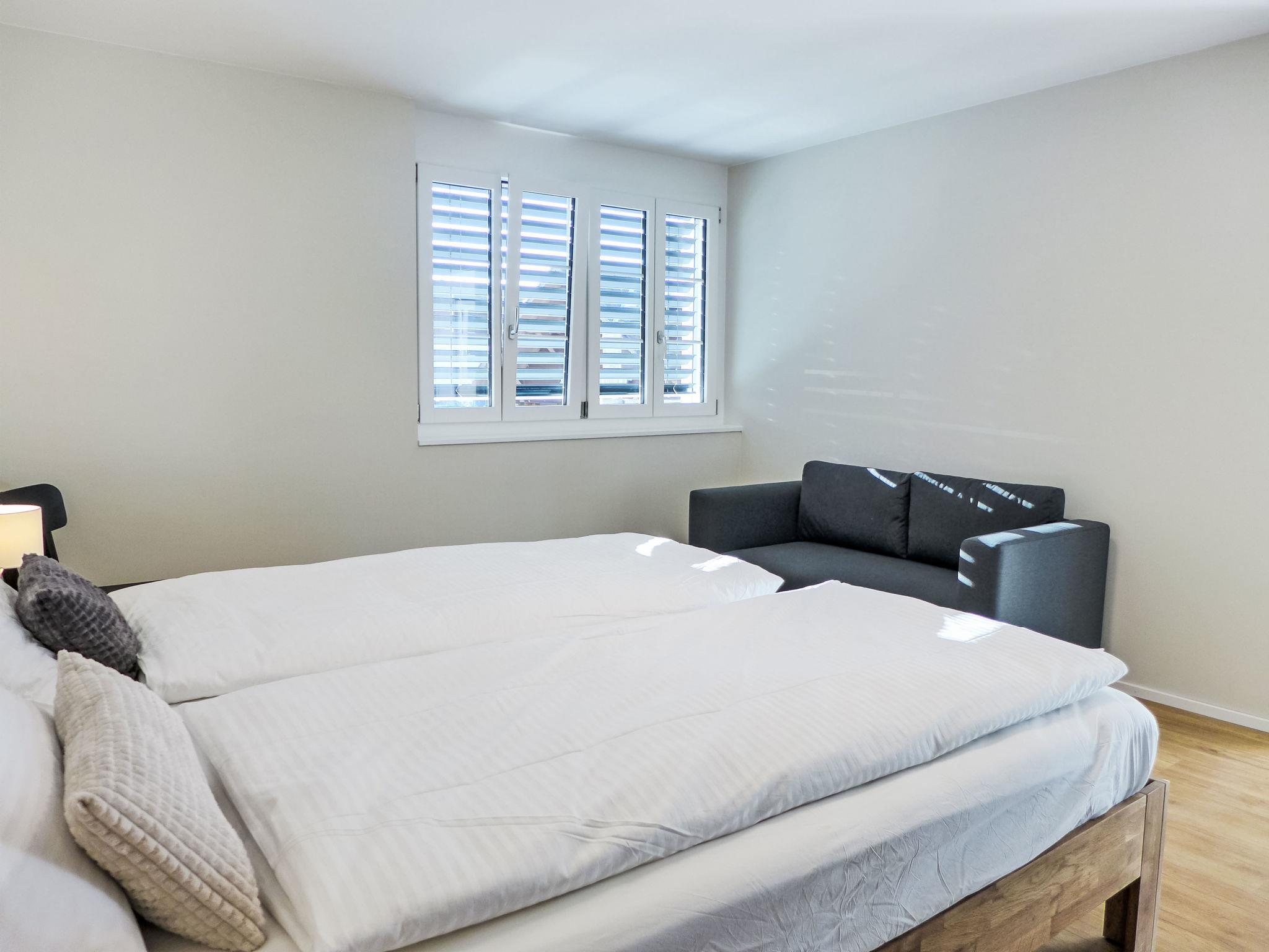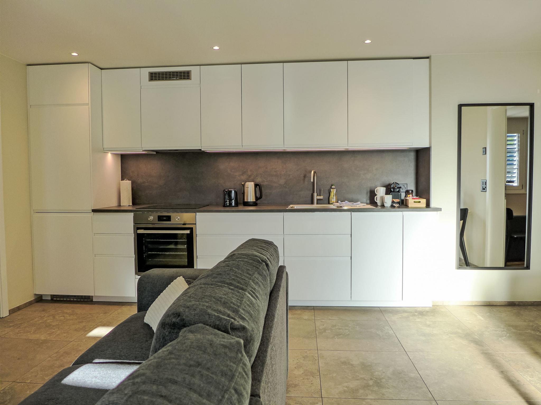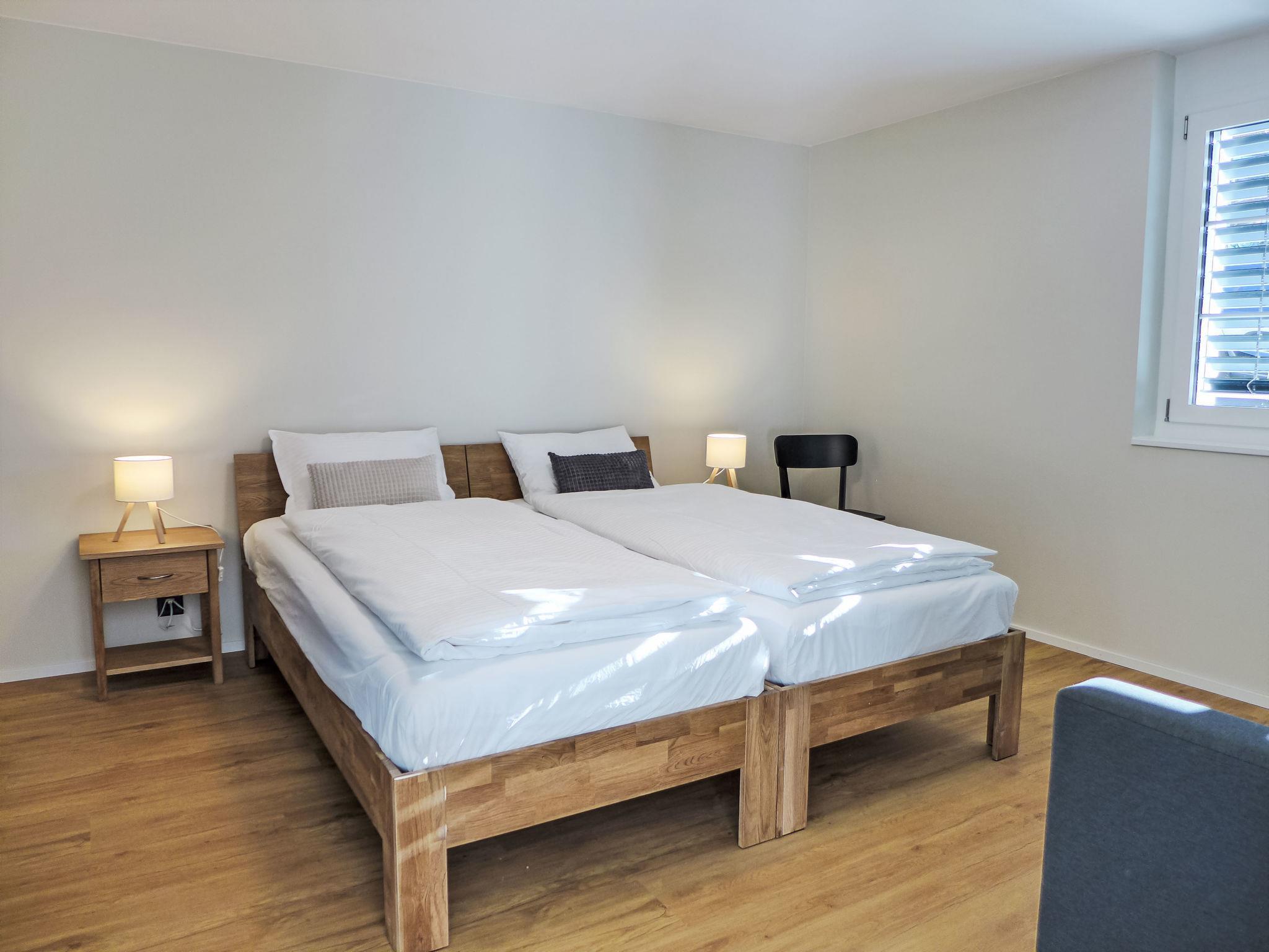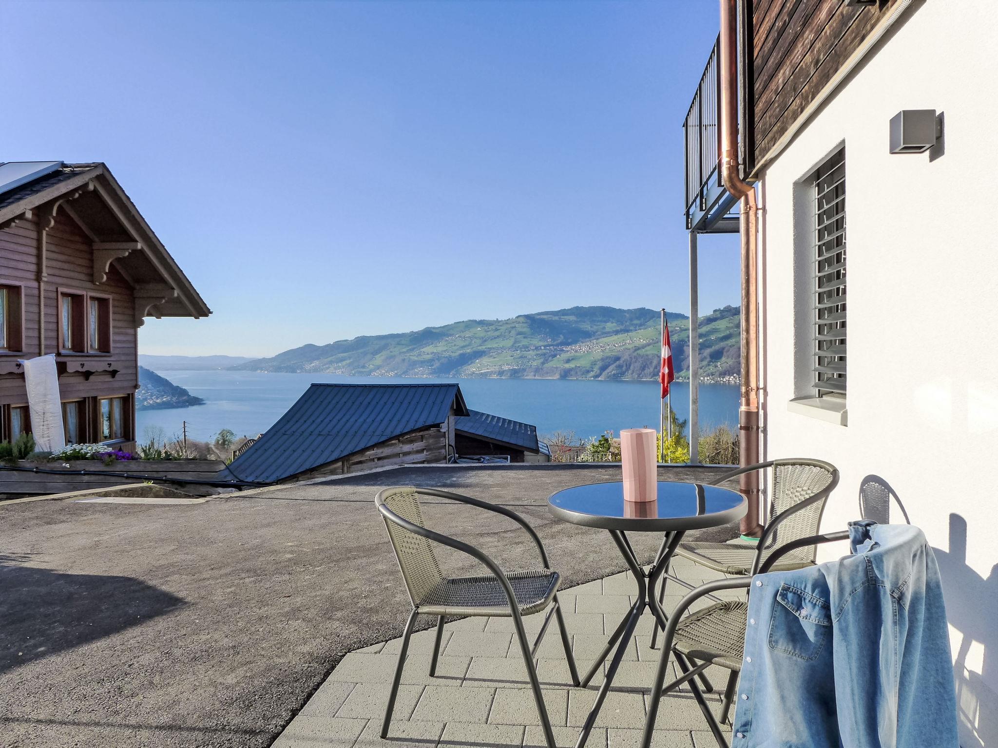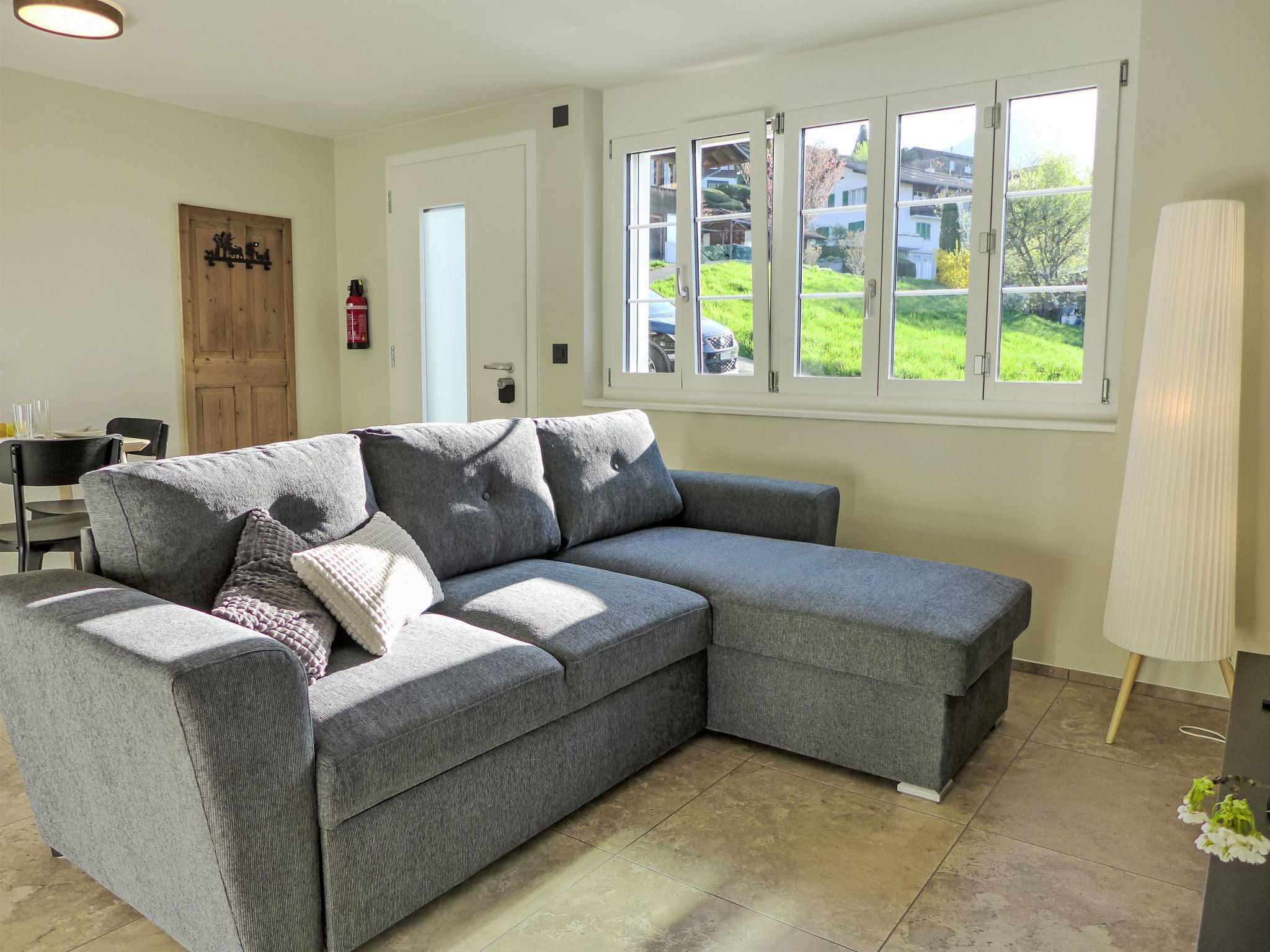 "Huus Chloster, Apt Niesen", 2-Zimmer-Wohnung 50 m2, unteres Geschoss. Vollständig renoviert im Jahre 2025, sehr komfortabel und gemütlich eingerichtet: offenes Wohn-/Esszimmer mit Esstisch, Kabel-TV und elektrischem Rollladen. Ausgang zur Terrasse. 1 Zimmer mit 2 Betten (90 cm, Länge 200 cm), 1 Diwanbett (80 cm, Länge 200 cm). Offene Küche (Backofen, Geschirrspüler, 4 Induktionskochplatten, Toaster, Wasserkocher, Tiefkühler, elektrische Kaffeemaschine, Kapseln für die Kaffeemaschine (Nespresso) extra, Racletteofen, Fondue Set (Käse)). Dusche/WC. Fussbodenheizung. Solarstrom. Kleine Terrasse, Westlage. Herrliche Sicht auf den See, die Berge und die Landschaft. Zur Verfügung: Kinderhochstuhl, Babybett bis 2 Jahre (extra), Haartrockner. Internet (WLAN, gratis). Parkplatz (1 Auto). E-Ladestation. Bitte beachten: Nichtraucher-Unterkunft. Feuerlöscher.