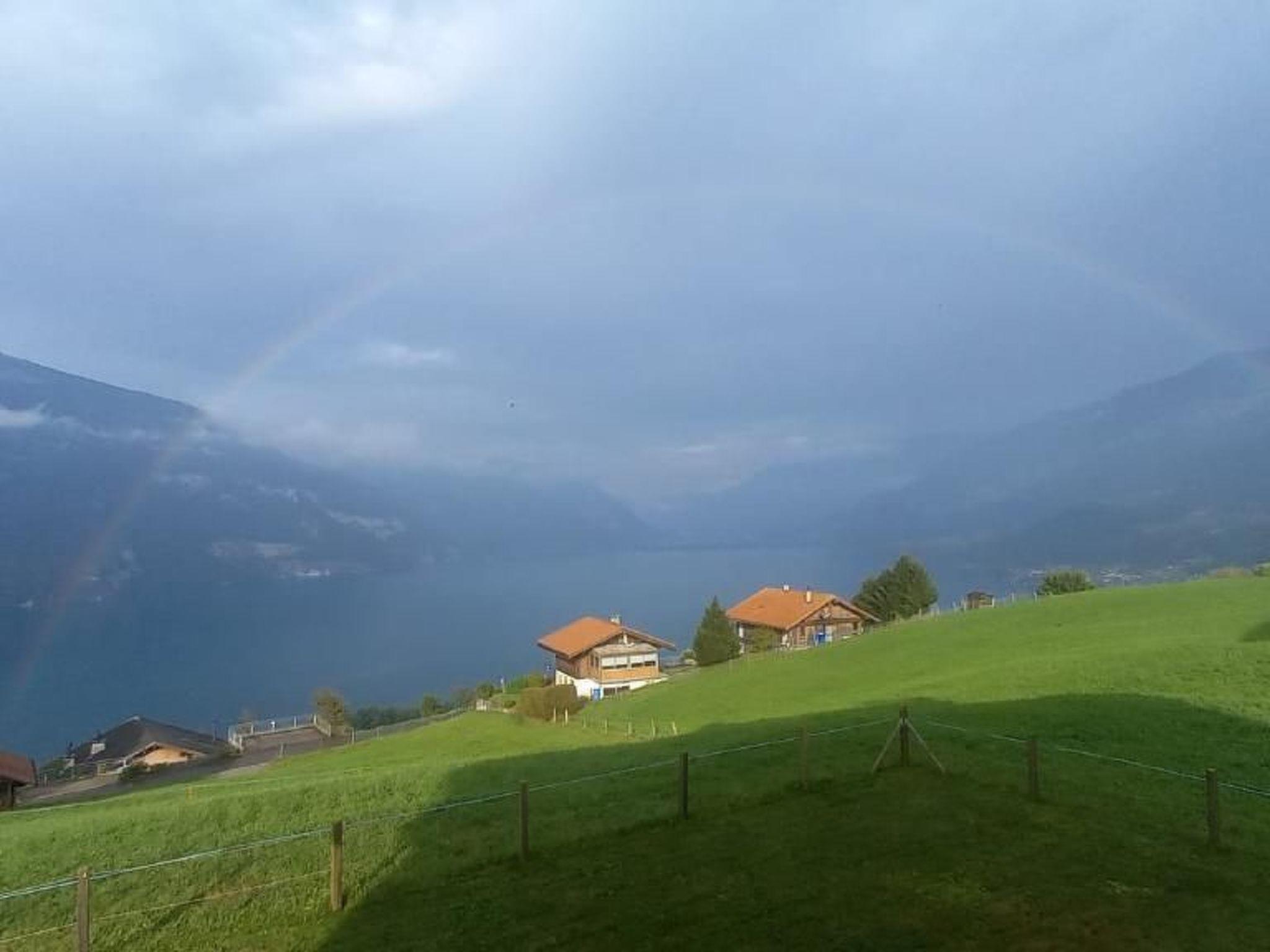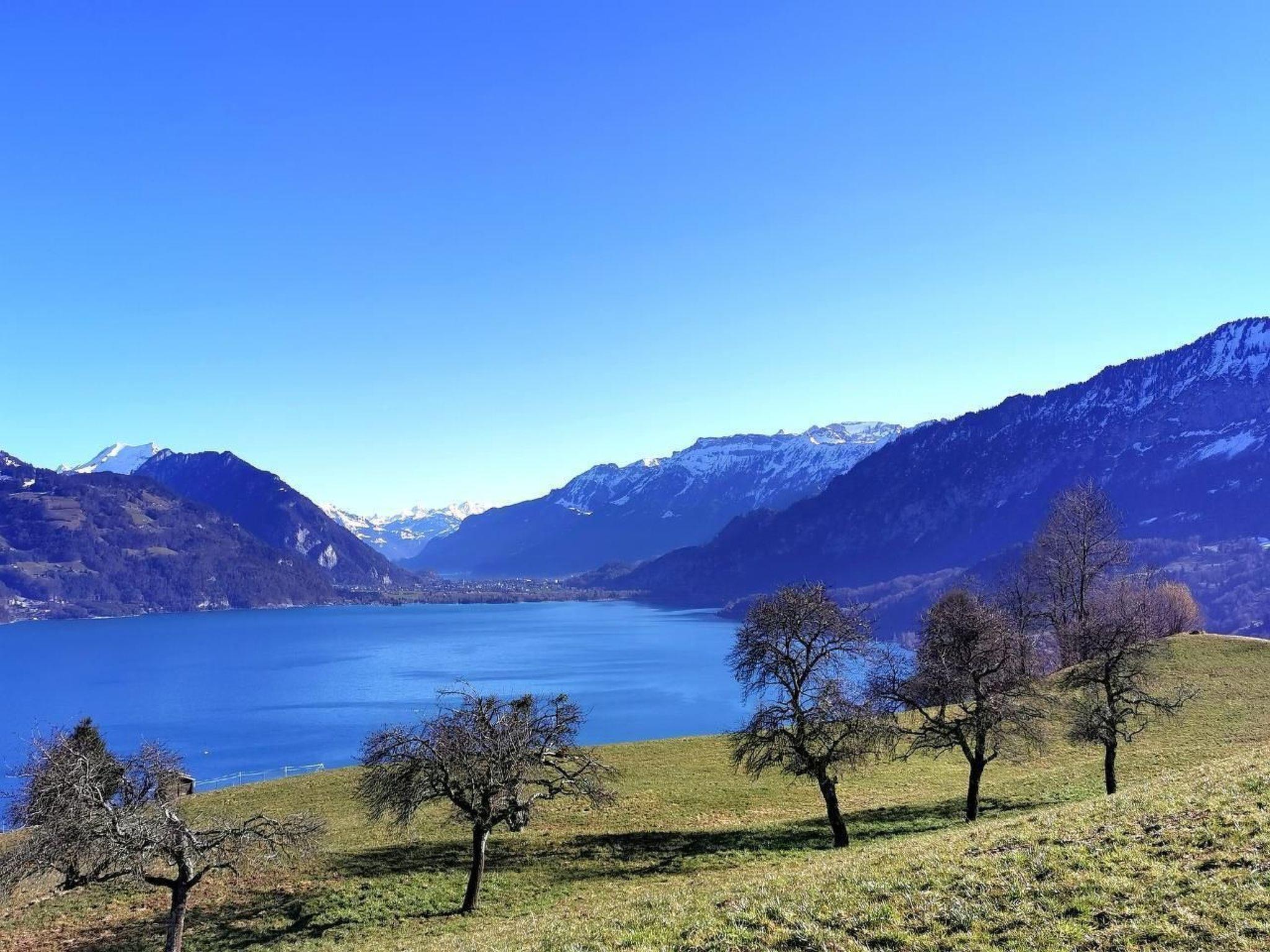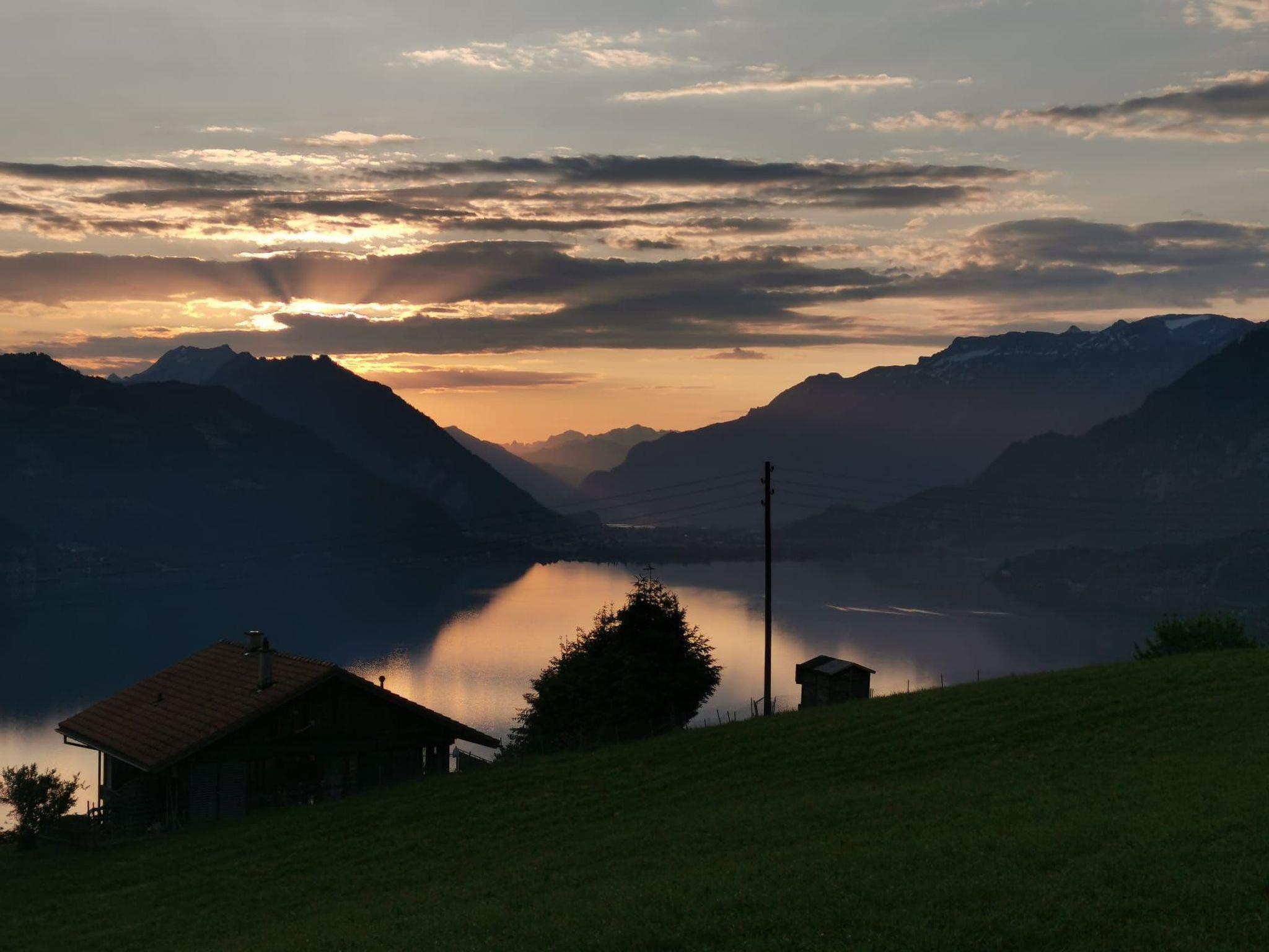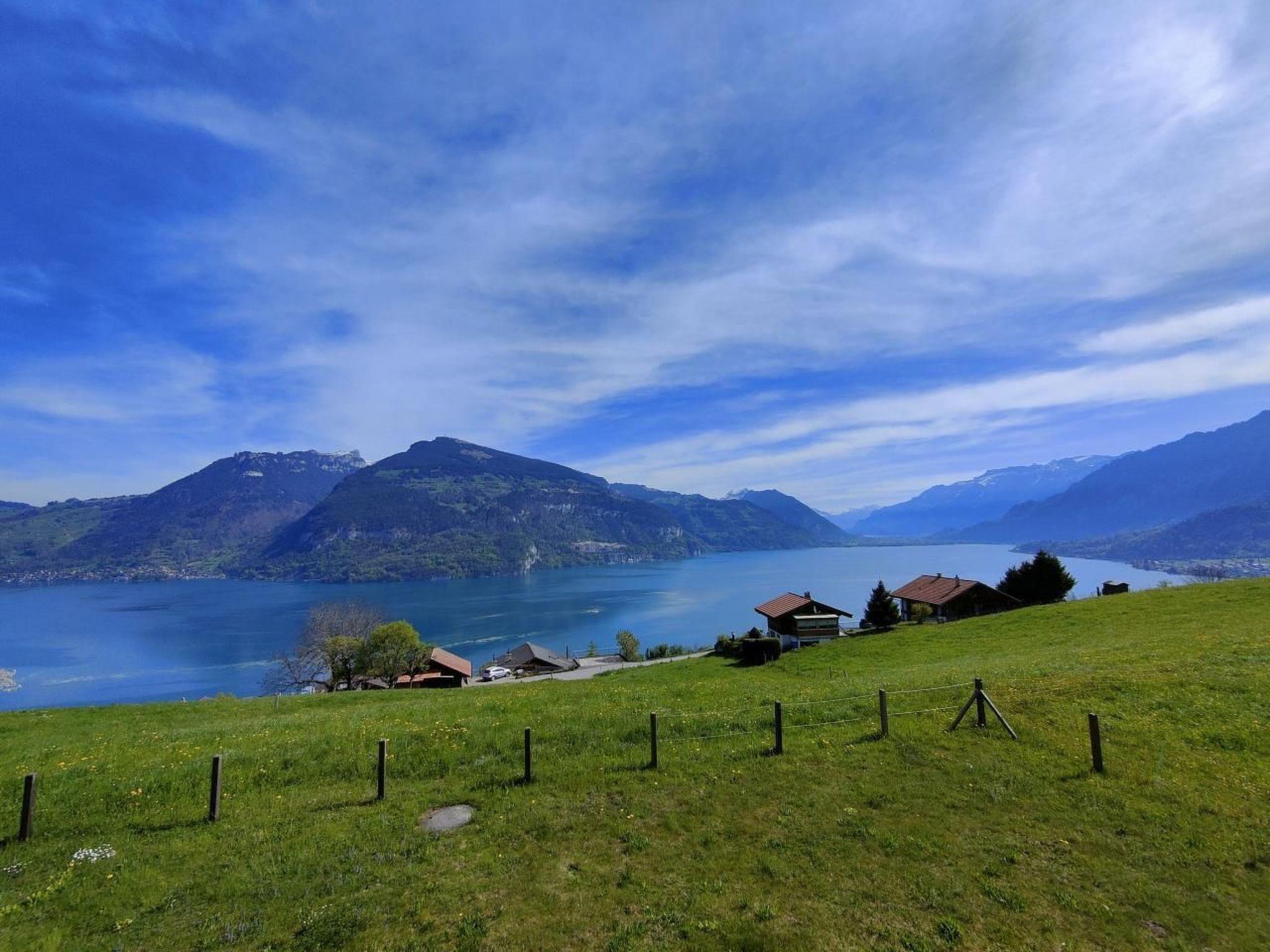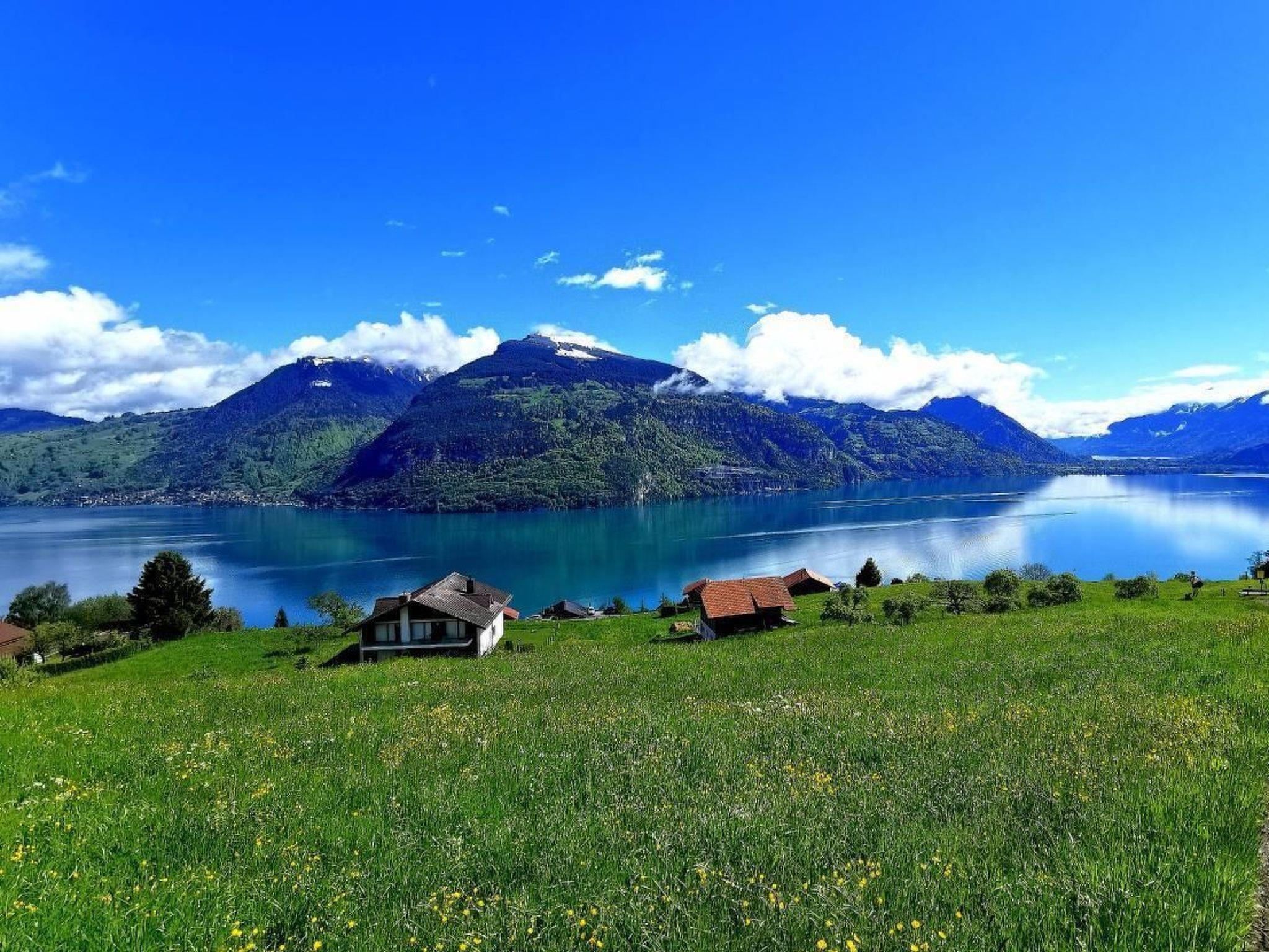 Idyllische Lage mit einmaliger Aussicht auf die schönen Berge vom Berner Oberland, und über den ganzen Thunersee von Interlaken bis nach Thun. Die Wohnung liegt am Dorfrand in der Natur umgeben von wenigen Häusern.
