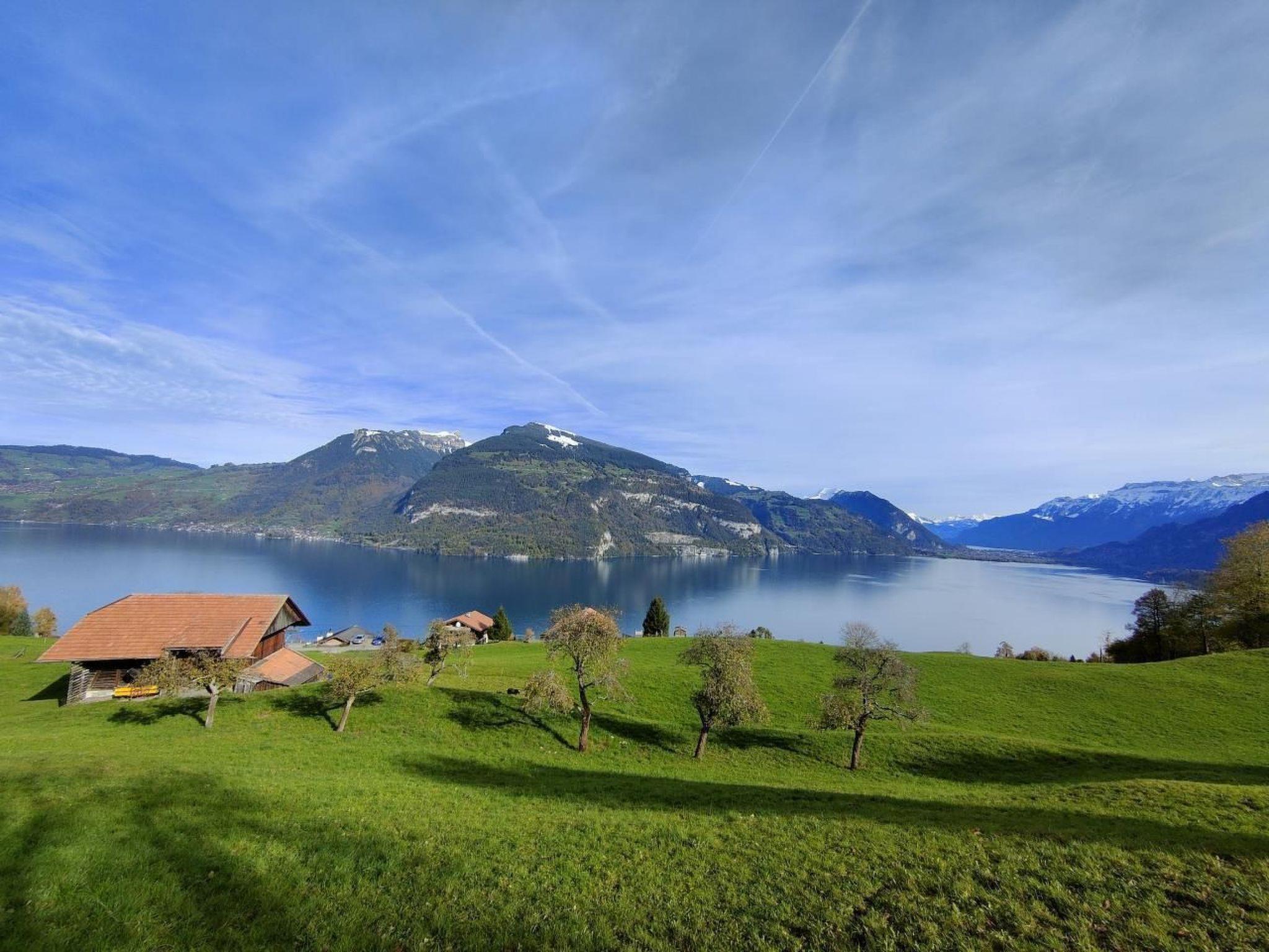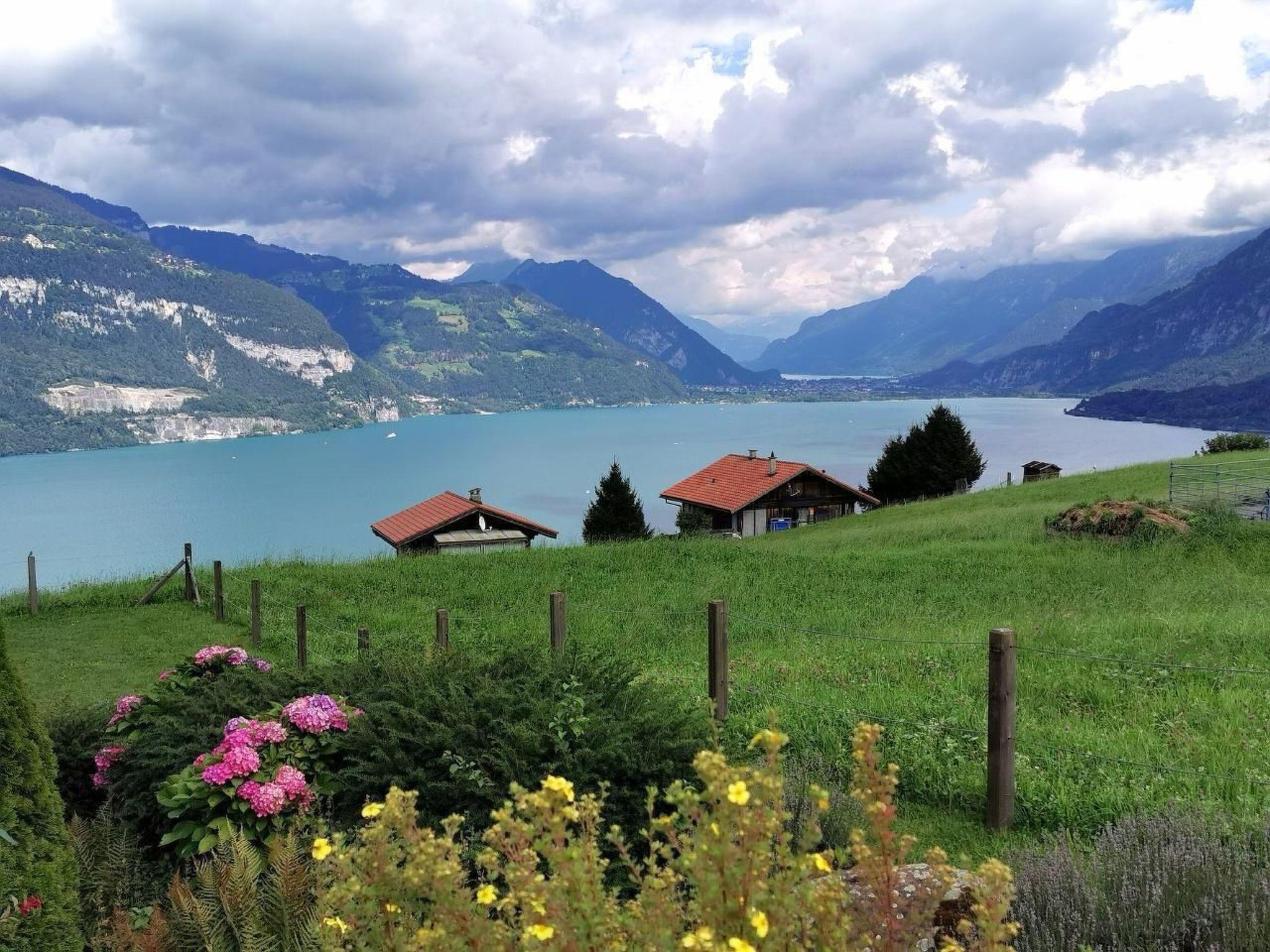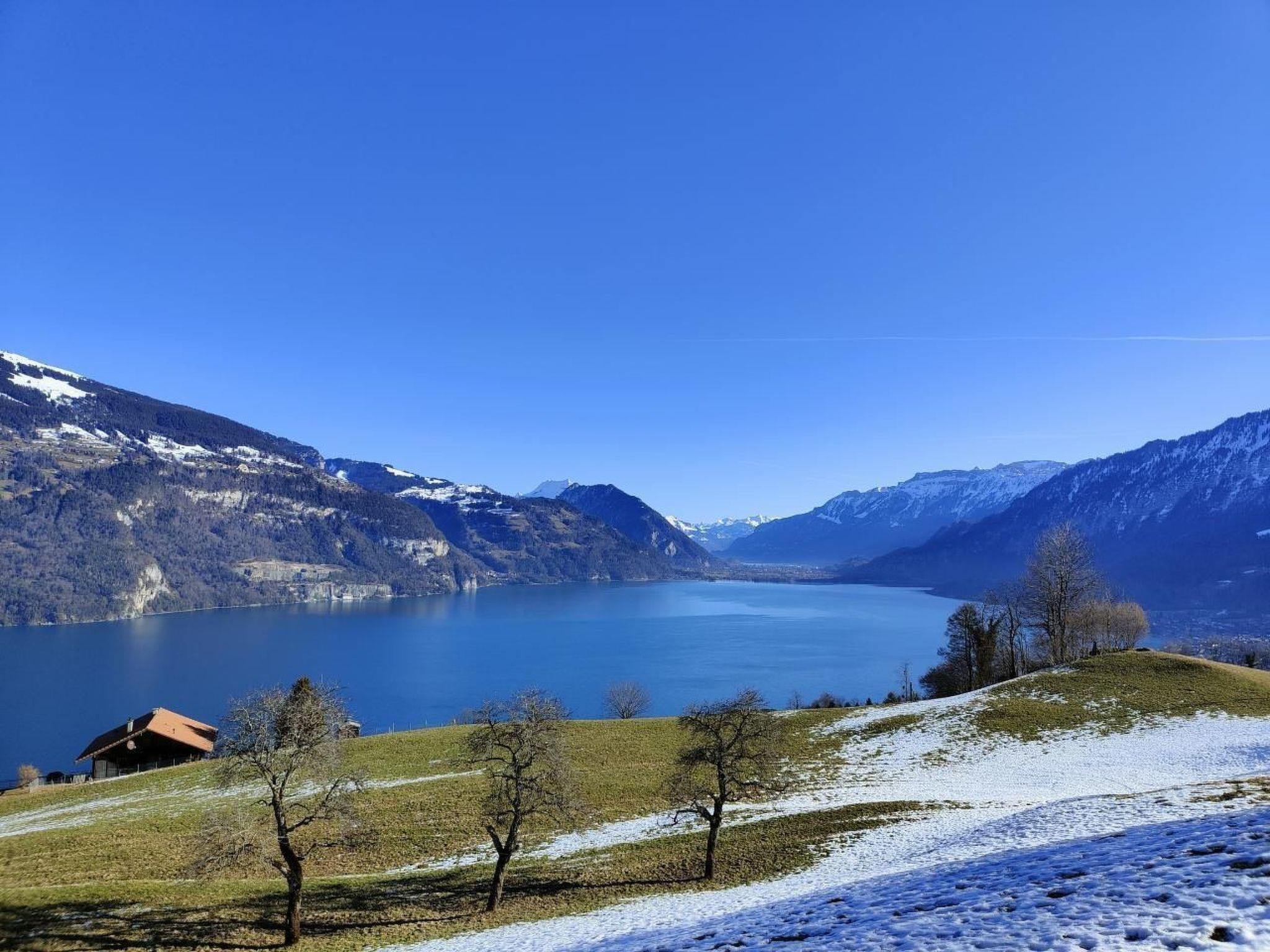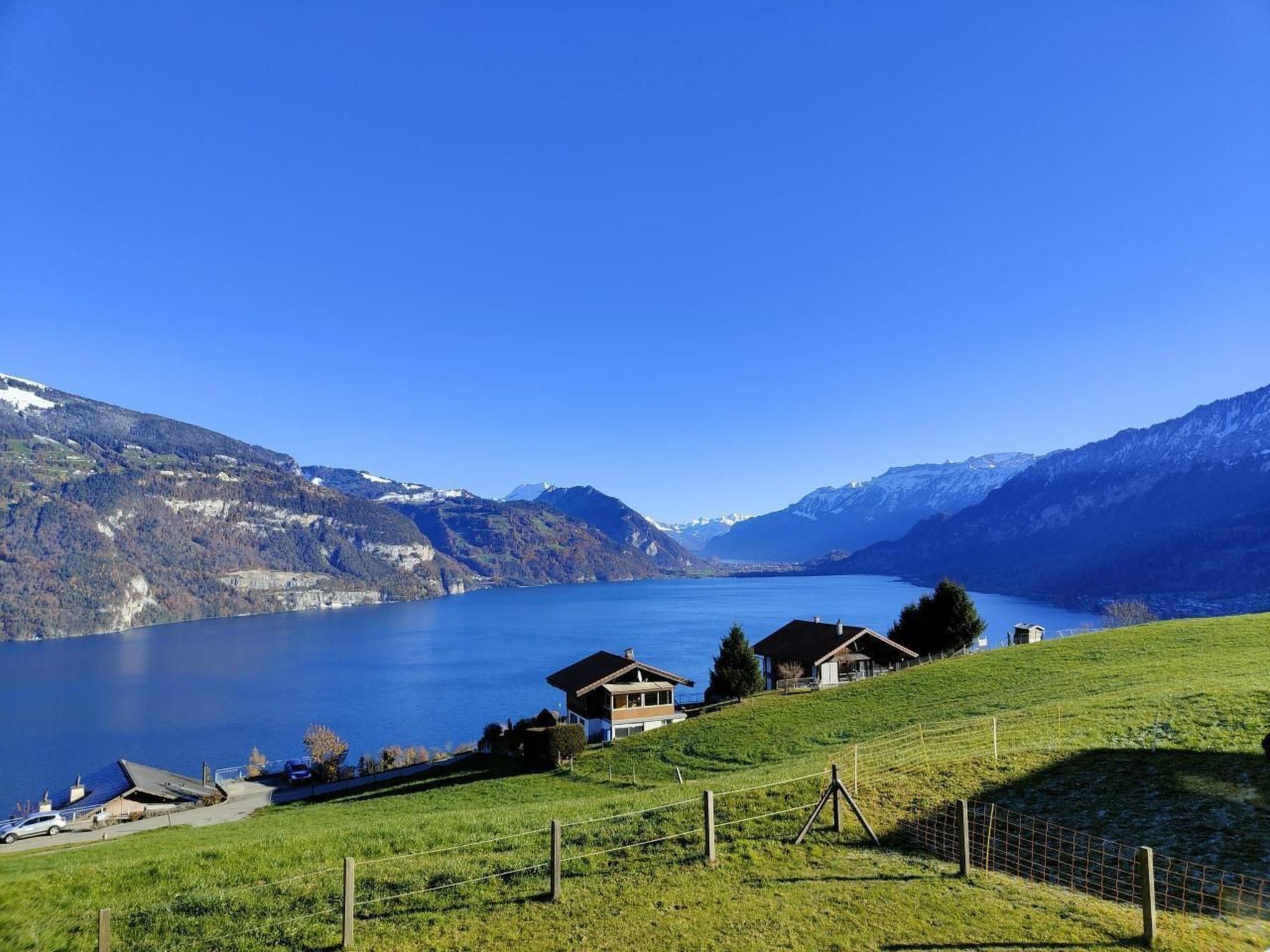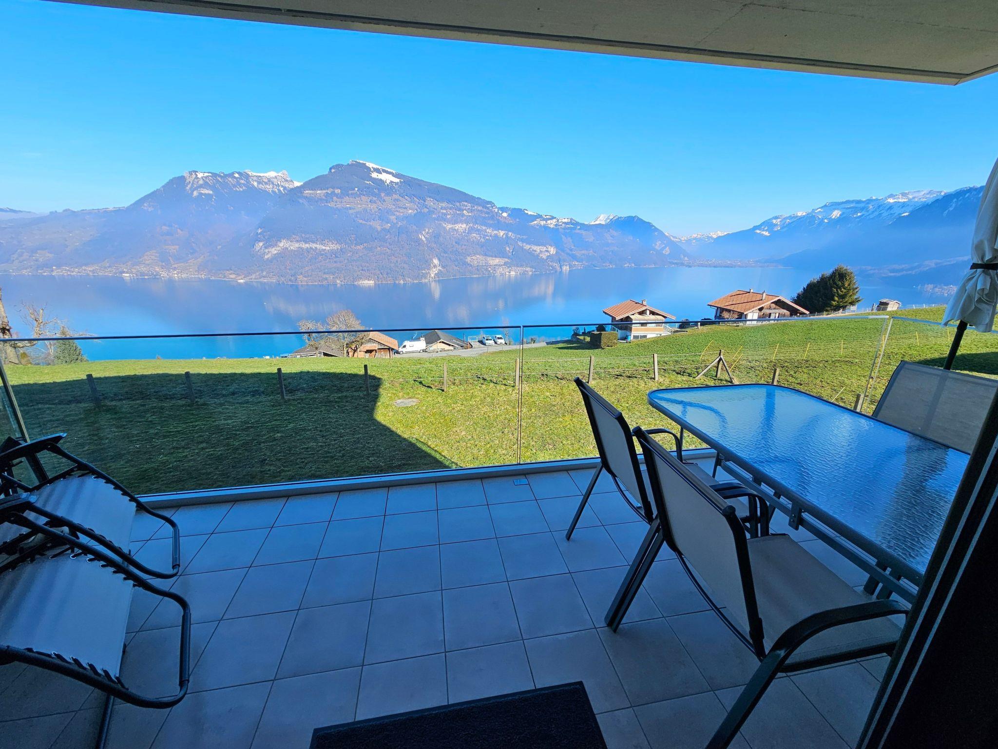 Idyllische Lage mit einmaliger Aussicht auf die schönen Berge vom Berner Oberland, und über den ganzen Thunersee von Interlaken bis nach Thun. Die Wohnung liegt am Dorfrand in der Natur umgeben von wenigen Häusern.