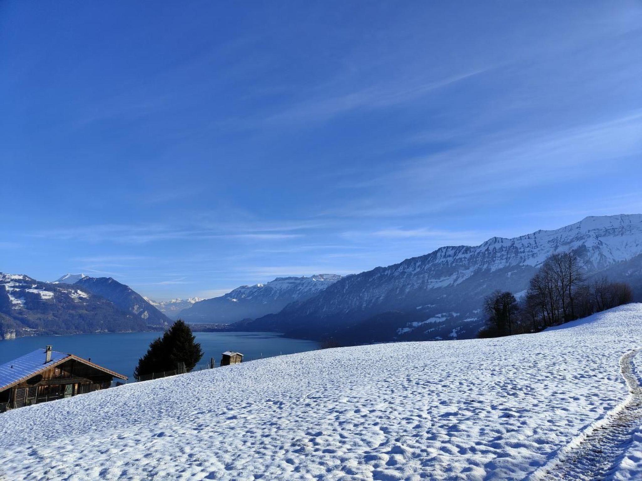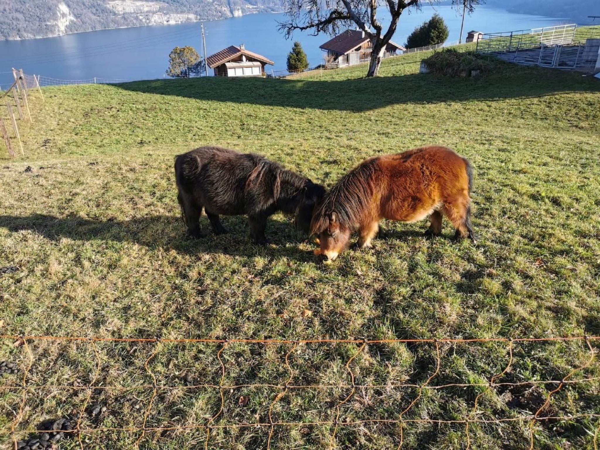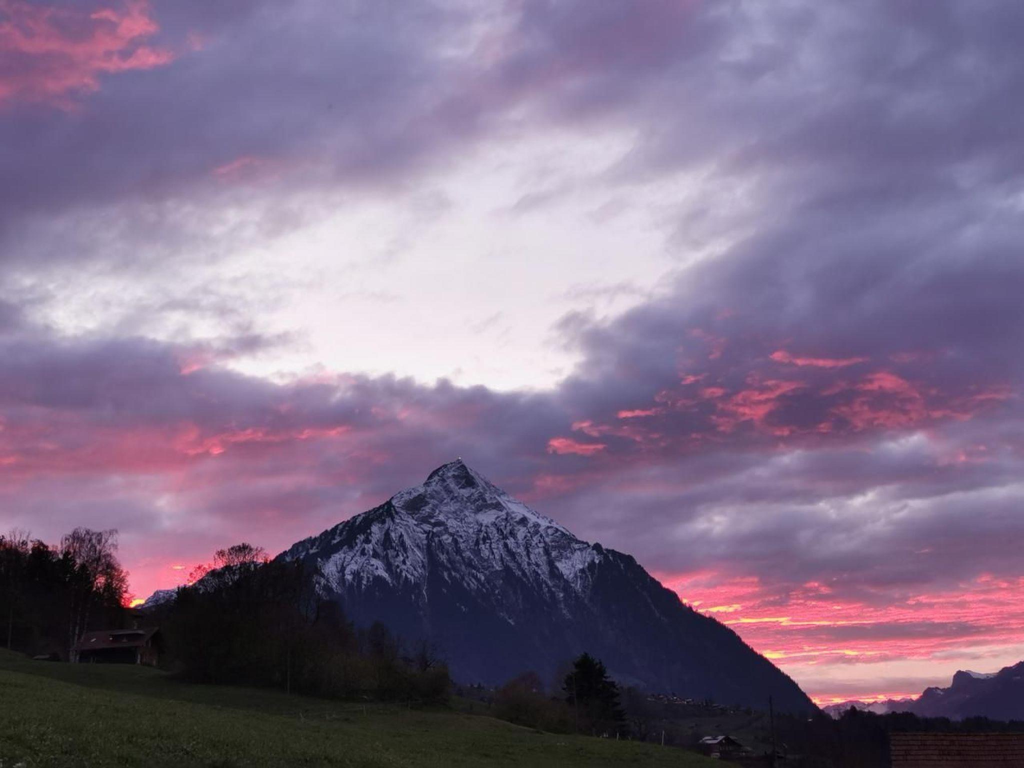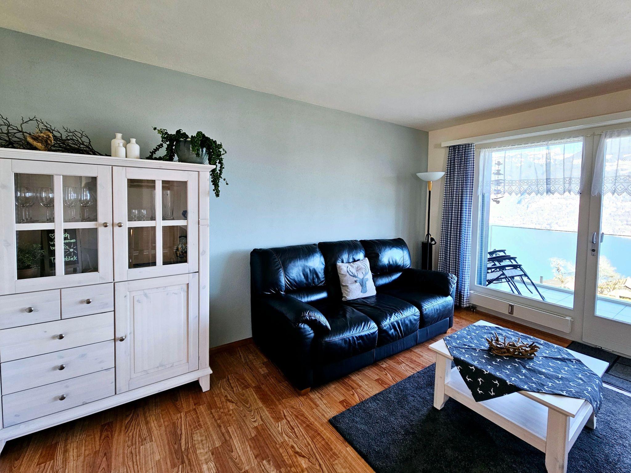 Idyllische Lage mit einmaliger Aussicht auf die schönen Berge vom Berner Oberland, und über den ganzen Thunersee von Interlaken bis nach Thun. Die Wohnung liegt am Dorfrand in der Natur umgeben von wenigen Häusern.