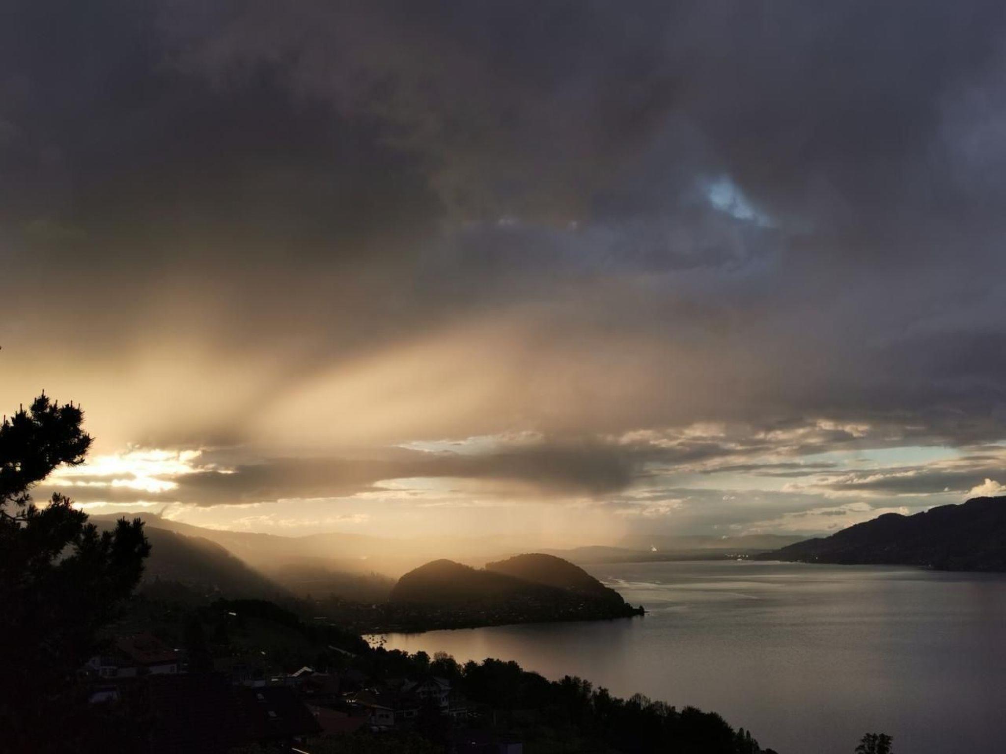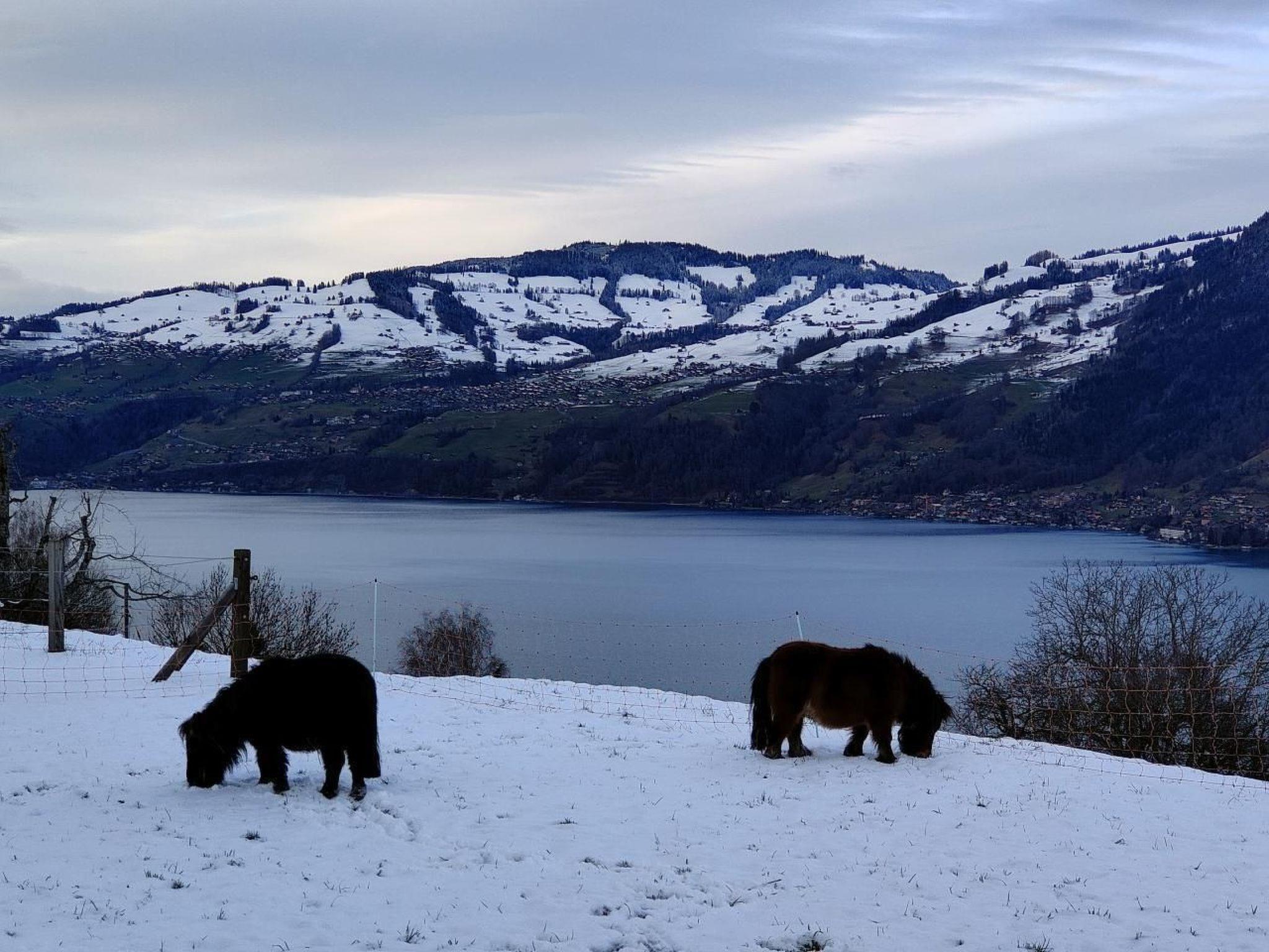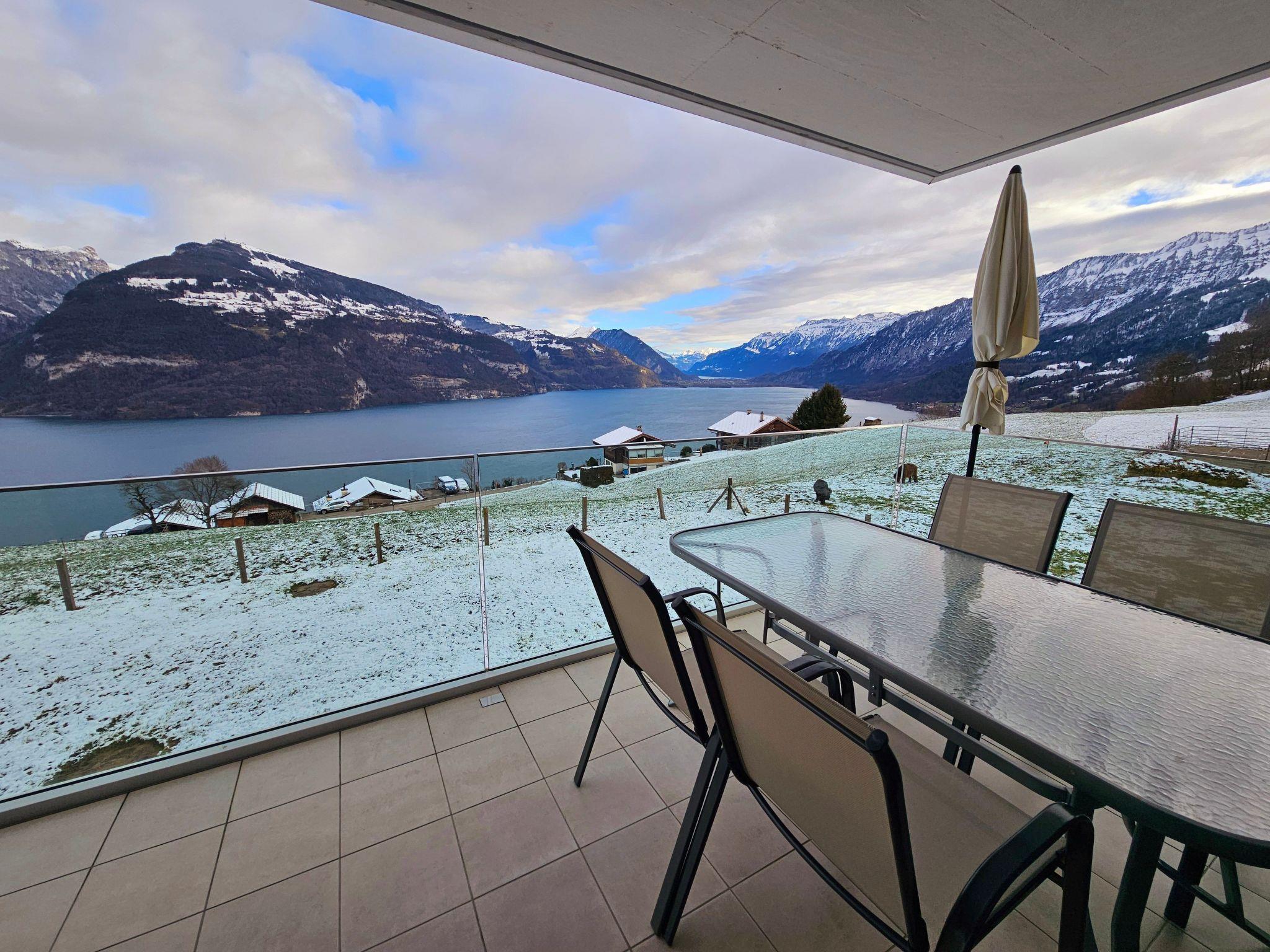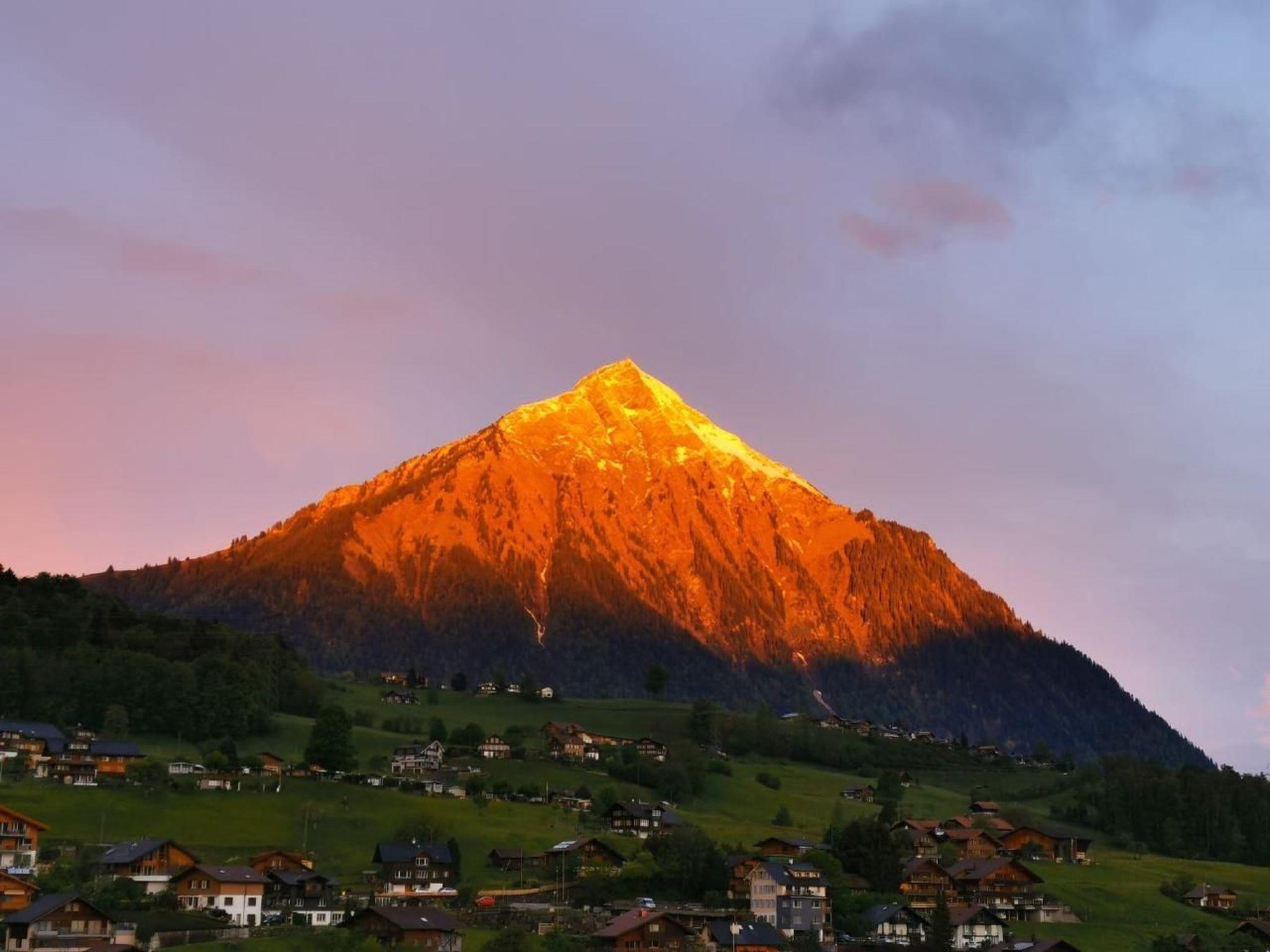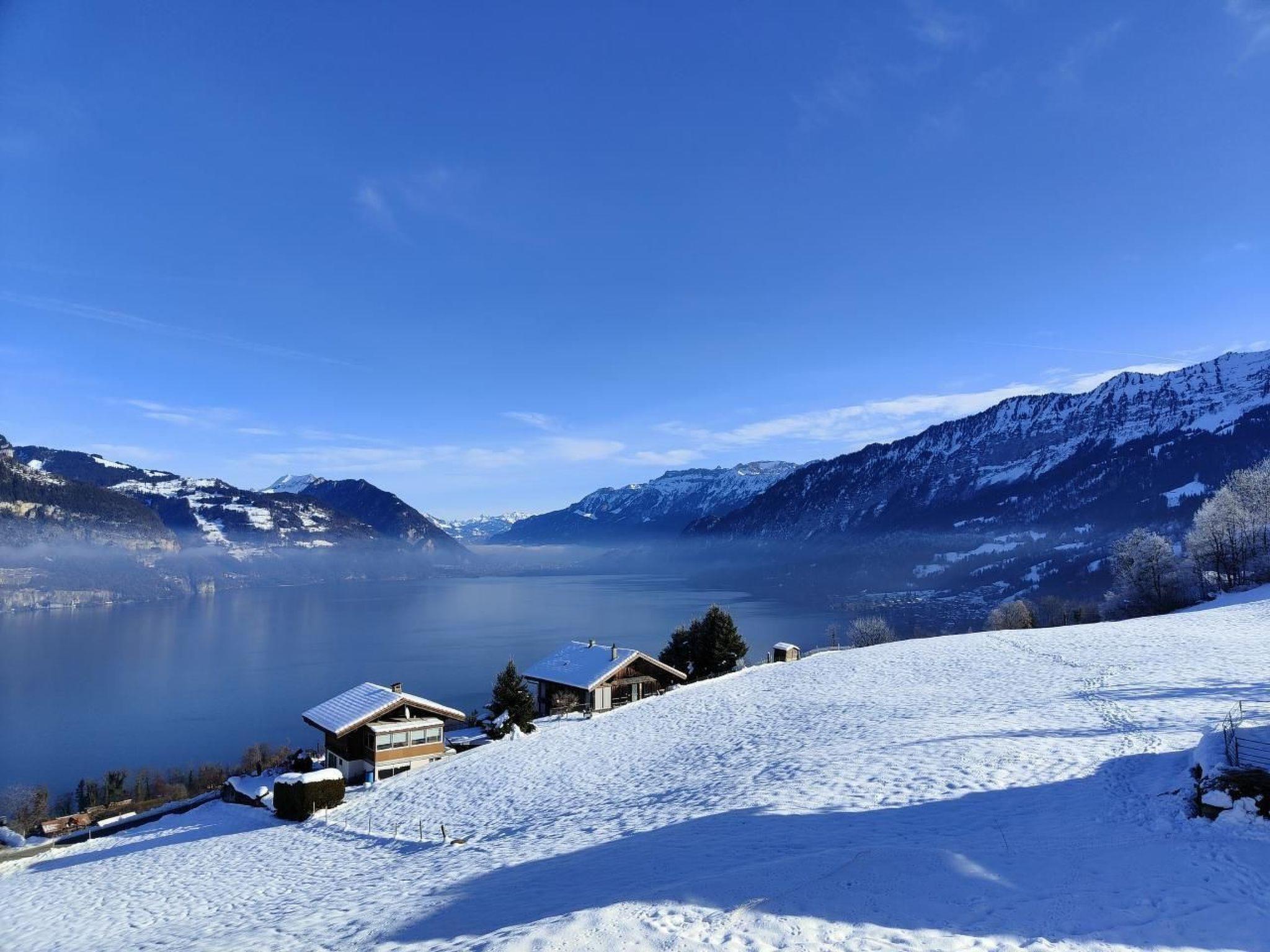 Idyllische Lage mit einmaliger Aussicht auf die schönen Berge vom Berner Oberland, und über den ganzen Thunersee von Interlaken bis nach Thun. Die Wohnung liegt am Dorfrand in der Natur umgeben von wenigen Häusern.