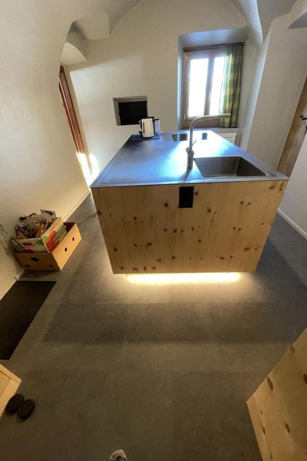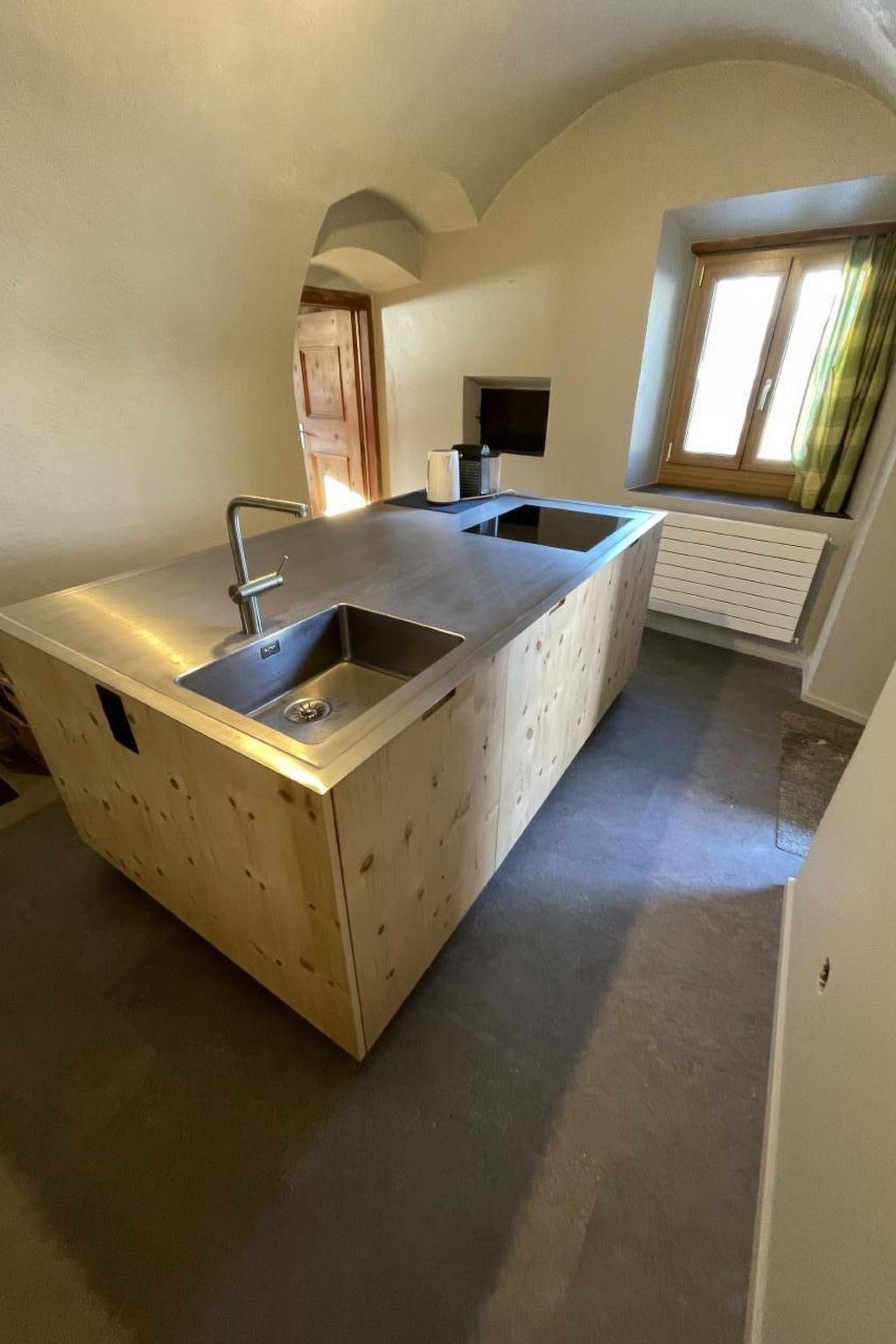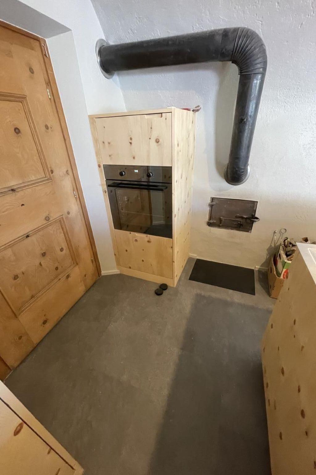 Parterre: Stube aus antikem Arvenholz und traditionellem Holzofen (kann benutzt werden, aber da wir seit 2023 Geothermische Heizung im ganzen Haus haben, wird der Ofen praktisch nie mehr benutzt.) Küche und ein Doppelzimmer, das als Wohnzimmer genutzt werden kann da ein neues Schlafsofa fuer 2 dem Raum mehr flexibilität gibt mit Balkonausgang, Dusche/WC. Küche, WC/Dusche und Gang: Neu Renoviert 2023