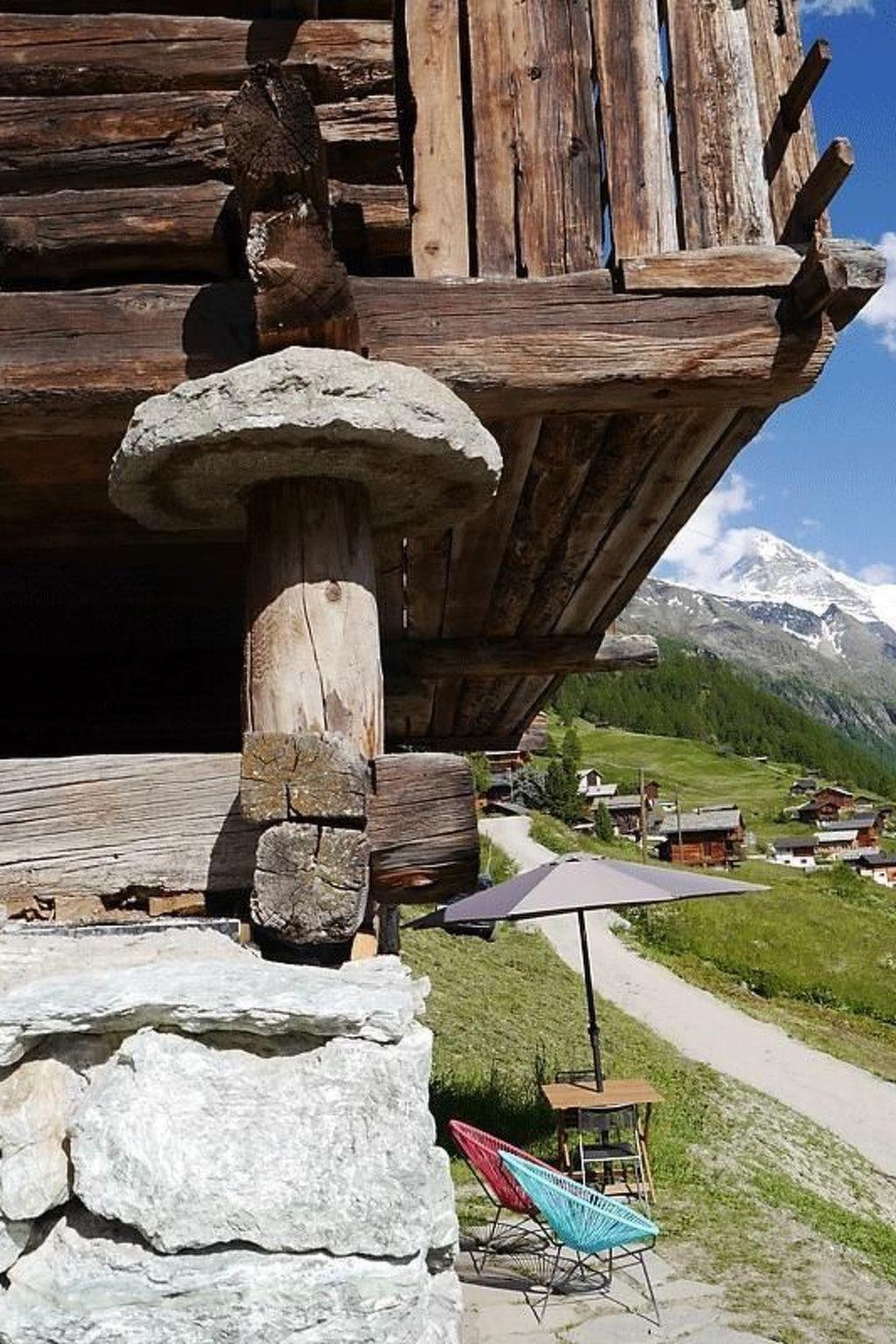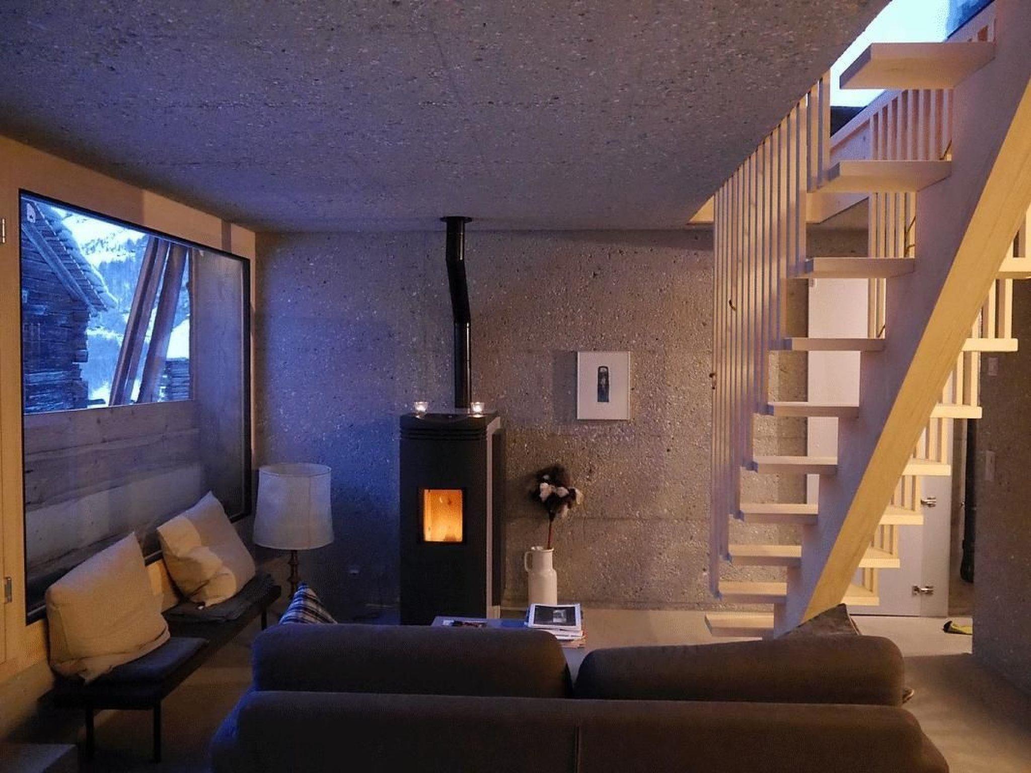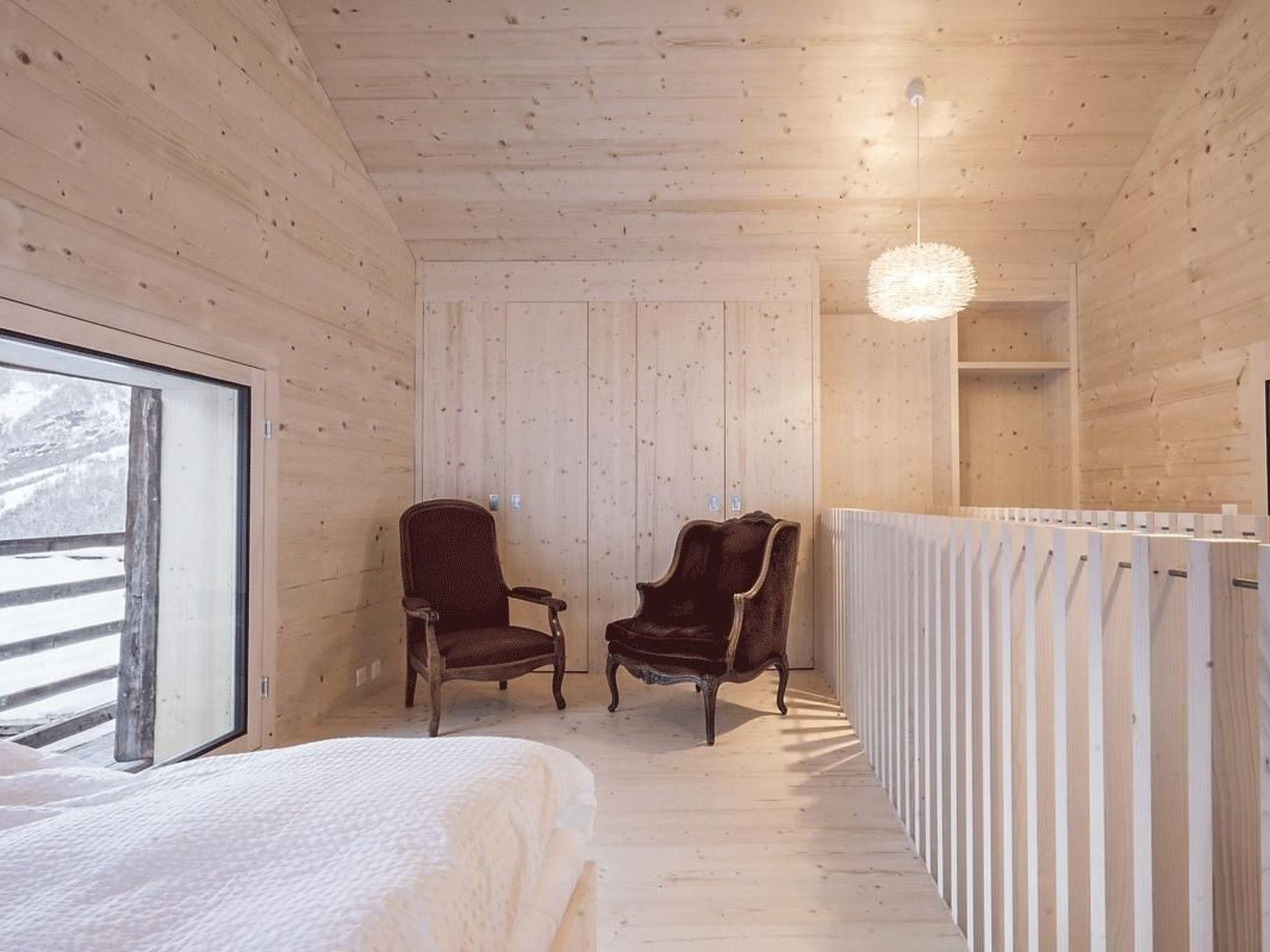 Der ehemalige Stall ist heute ein Wohnraum in einem modernen Ambiente, der mit einem Pelletofen beheizt wird. Der obere Teil wurde in ein geräumiges Schlafzimmer umgewandelt, das einen Blick auf den 4357 Meter hohen Dent Blanche bietet. Die verschiedenen Räume ermöglichen es uns, Ihnen zwei völlig unterschiedliche Atmosphären zu bieten. Der ehemalige Stall ist mineralisch und verbindet Beton und Stein, während der Raum des Raccard ein mit Holz ausgekleideter Kokon ist, der zum Entspannen und Ausruhen einlädt. Der Übergang von einem Stockwerk zum anderen erfolgt über eine Holztreppe, die die Leere überwindet - eine Reise für sich!