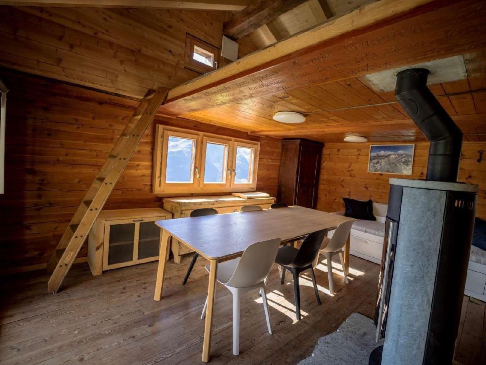 Das 2023 komplett renovierte Maiensäss befindet sich auf 2100 m Höhe, gegenüber den höchsten Gipfeln der Walliser Alpen (Dent-Blanche, Dent d'Hérens) und den Gletschern des Haut val d'Hérens.