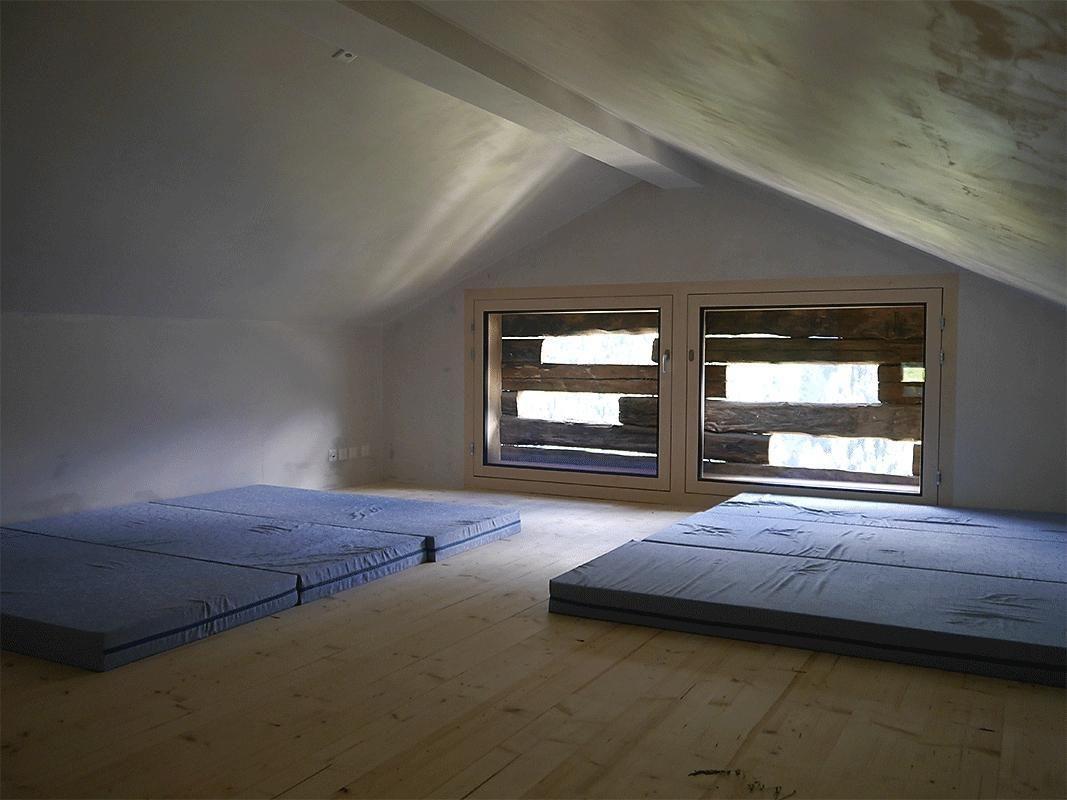 Dieser alte Dachboden war zum Abriss vorgesehen. Er wurde geborgen und umgebaut, um ihm eine neue Funktion innerhalb des Anakolodge-Komplexes zu verleihen. Dieses Maiensäss hat die Besonderheit, dass es bis zu 12 Personen beherbergen kann. Es besteht aus zwei Doppelzimmern, die sich im Sockel befinden, sowie aus einem separaten Badezimmer. Das Badezimmer wird durch einen in den Boden gehauenen Schlitz beleuchtet, der ein diffuses Licht ermöglicht.