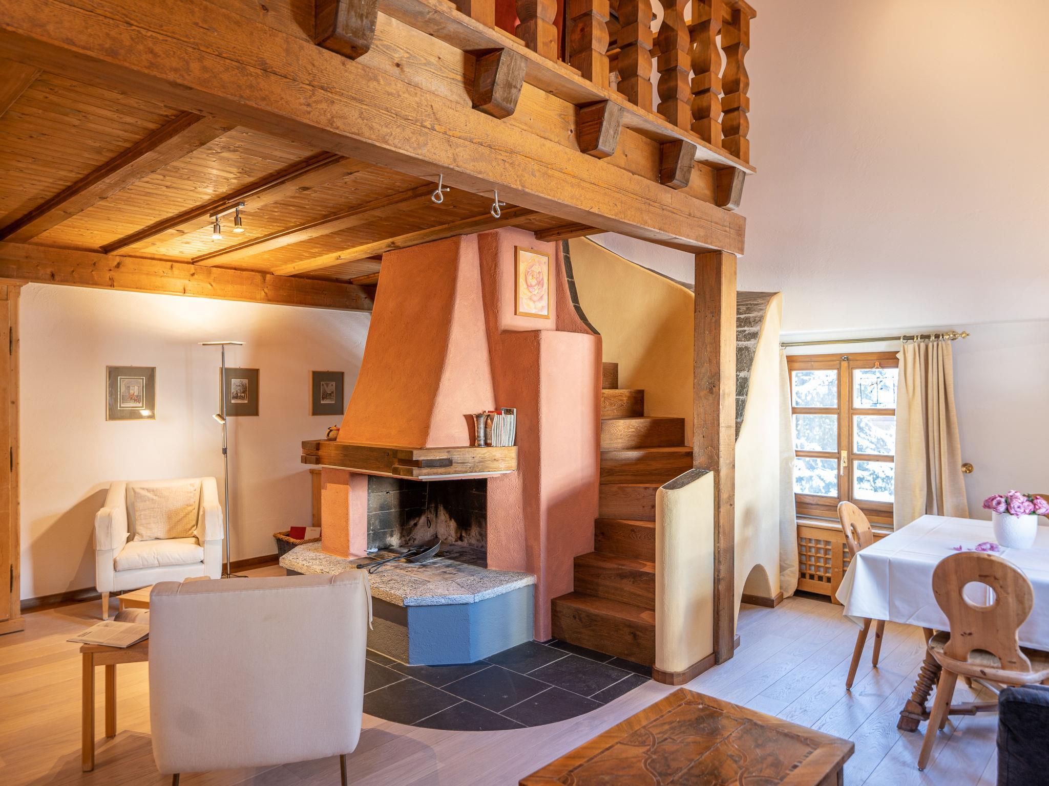 "Chesa Cantieni", 3-Zimmer-Wohnung 85 m2 auf 2 Stockwerken, Nordlage. Komfortabel und geschmackvoll eingerichtet: Wohn-/Esszimmer mit offenem Kamin und TV. 1 Zimmer mit 1 Bett (90 cm, Länge 200 cm), 1 x 2 Etagenbetten (85 cm, Länge 185 cm). Offene Küche (Backofen, Geschirrspüler, 4 Induktionskochplatten, Toaster, Wasserkocher, Tiefkühler, elektrische Kaffeemaschine, Kapseln für die Kaffeemaschine (Nespresso) extra, Racletteofen). Dusche/WC. Obergeschoss: 1 Zimmer mit 1 Doppelbett (2 x 80 cm, Länge 195 cm), Bad/Dusche/WC. Ausgang zum Balkon. Galerie mit 1 Diwanbett (150 cm, Länge 200 cm). Kleiner Balkon. Sicht auf die Ortschaft. Zur Verfügung: Haartrockner. Internet (Wireless LAN, gratis). Garage Nr. 12 in 100 m, Höhe 225 cm, Breite 260 cm. Bitte beachten: geeignet für Familien. Nichtraucher-Unterkunft. Anstelle eines abgeschlossenen Schlafzimmers befinden sich manche Schlafplätze in einem offenen Bereich (Galerie, Nische etc.).