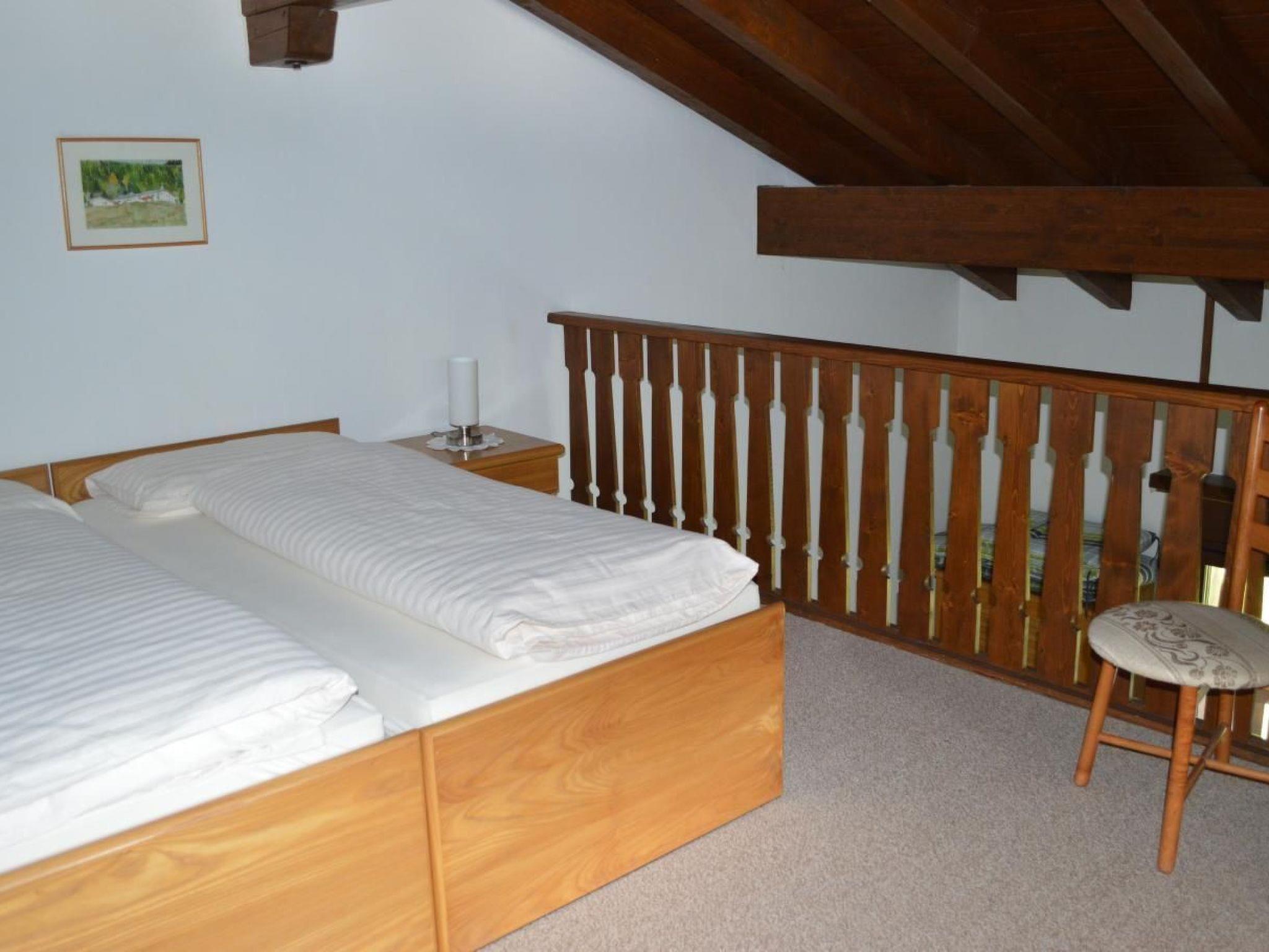 Eine Holztreppe führt zur offenen Galerie, welche mit einem Doppelbett und Schränken ausgestattet ist.