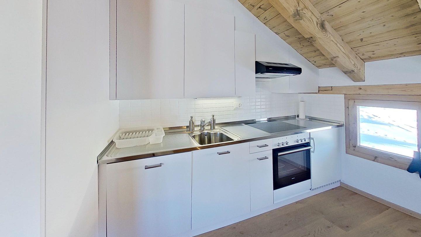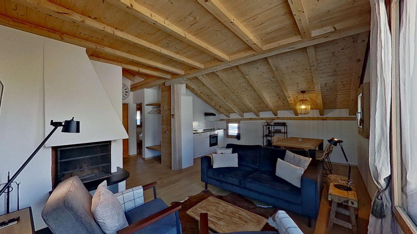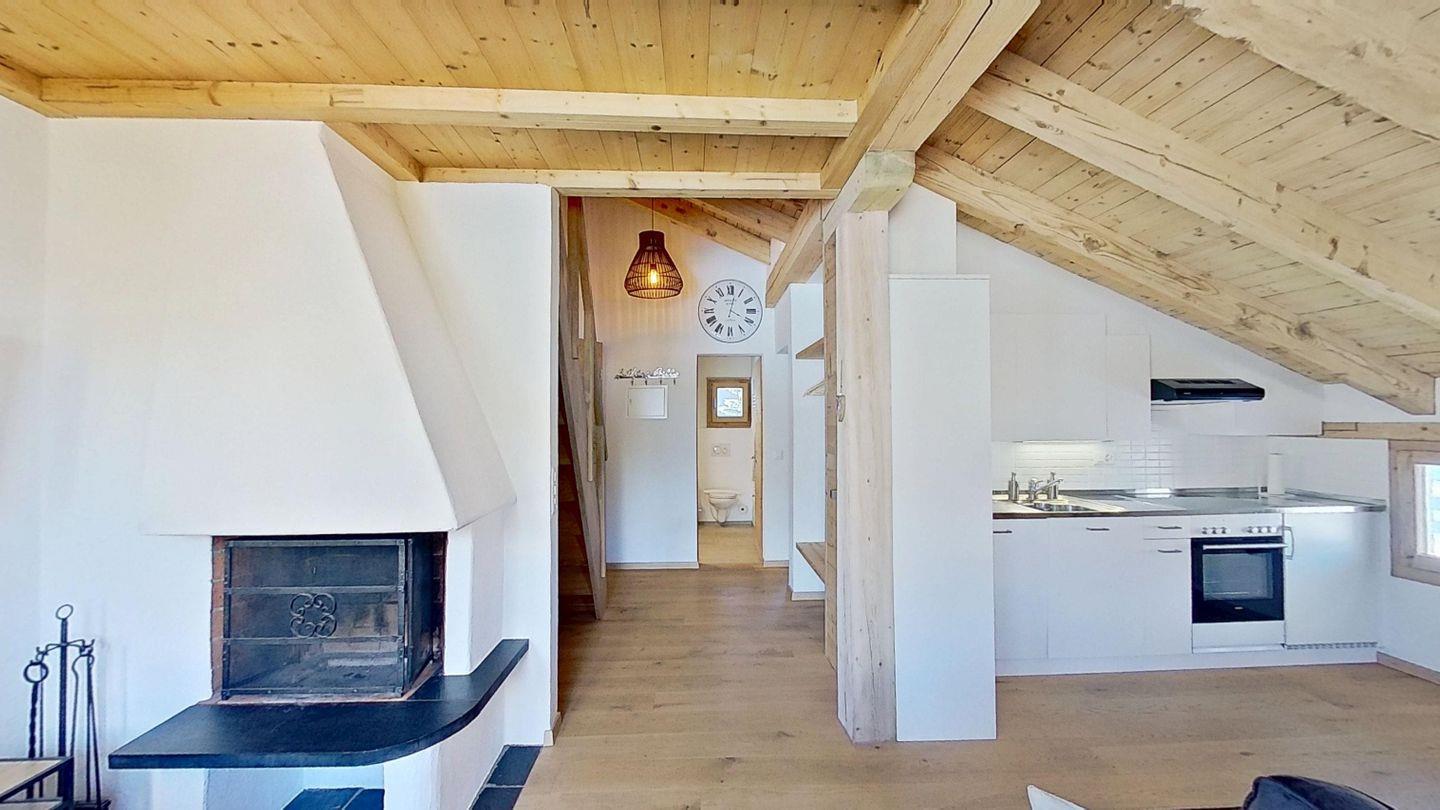 2½-Zimmerwohnung, Entrée mit Garderobe. Wohnzimmer mit Kochnische, Essbereich, TV und Sofaecke mit Kamin und einer schönen Bergsicht. Ein Doppelzimmer. Badezimmer mit Dusche, WC und Lavabo. Ein Aussenparkplatz. Nichtraucherwohnung. Haustiere sind erlaubt.
