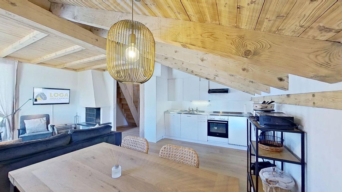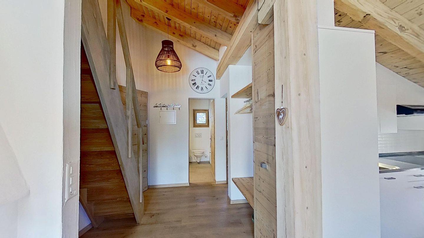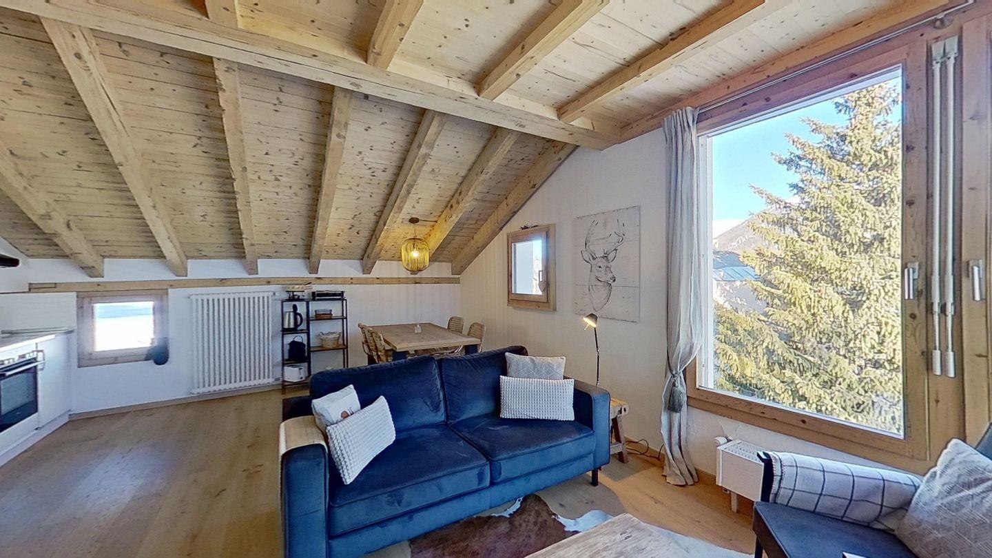 2½-Zimmerwohnung, Entrée mit Garderobe. Wohnzimmer mit Kochnische, Essbereich, TV und Sofaecke mit Kamin und einer schönen Bergsicht. Ein Doppelzimmer. Badezimmer mit Dusche, WC und Lavabo. Ein Aussenparkplatz. Nichtraucherwohnung. Haustiere sind erlaubt.