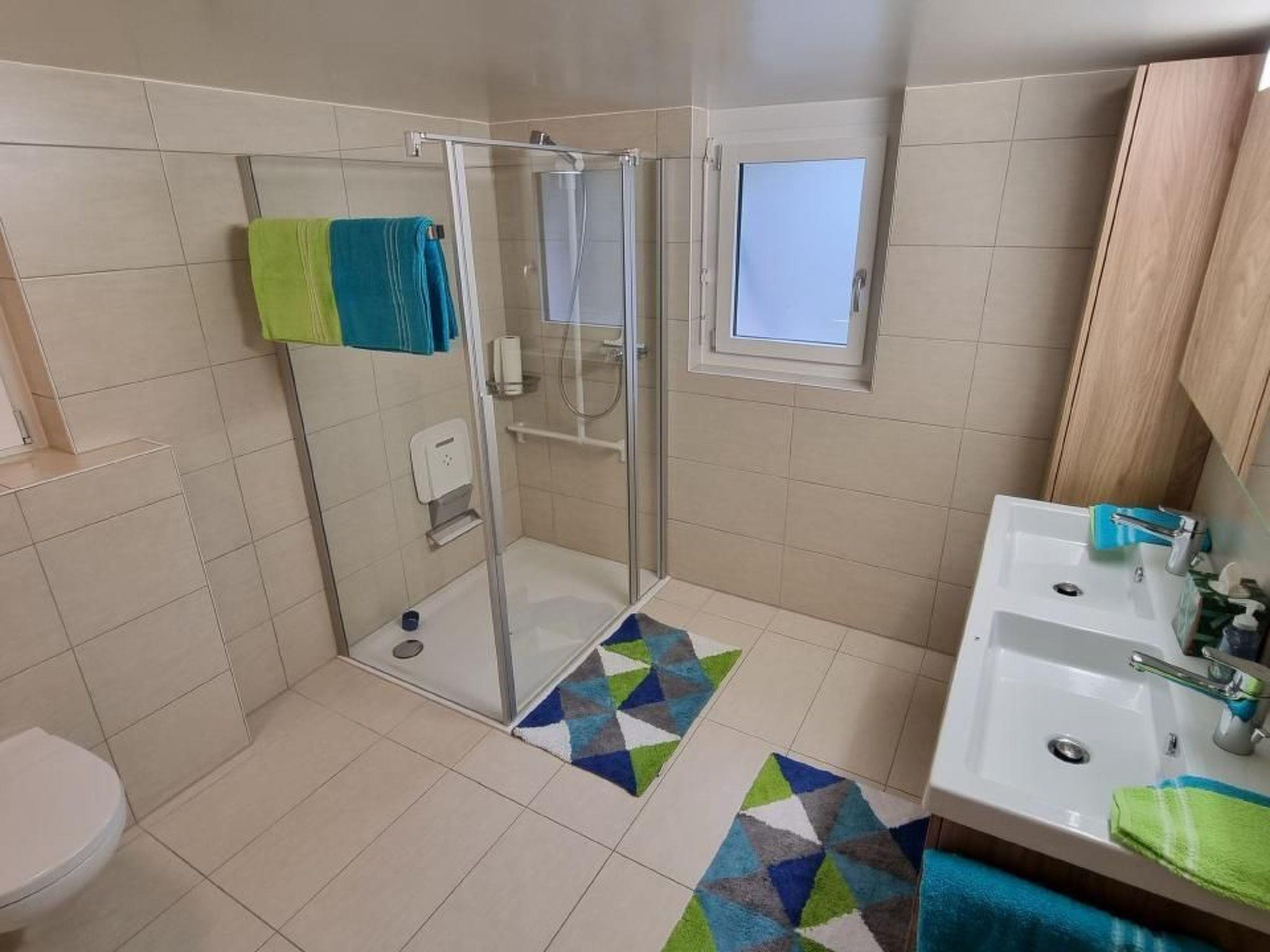 - Ein großes Badezimmer mit Doppelwaschbecken und einer großen Dusche. Das Badezimmer ist mit Hilfsmitteln für Personen mit eingeschränkter Mobilität ausgestattet.