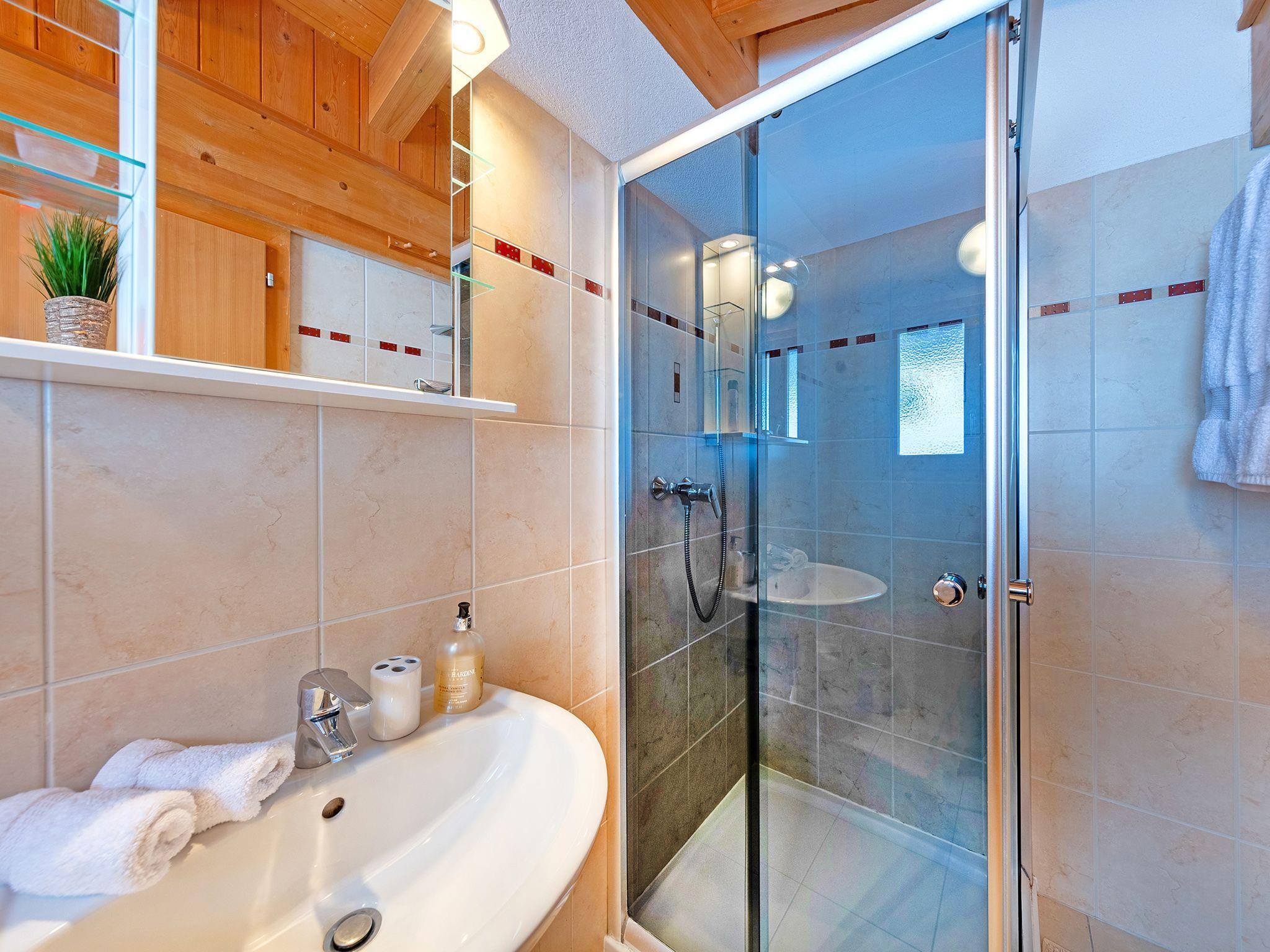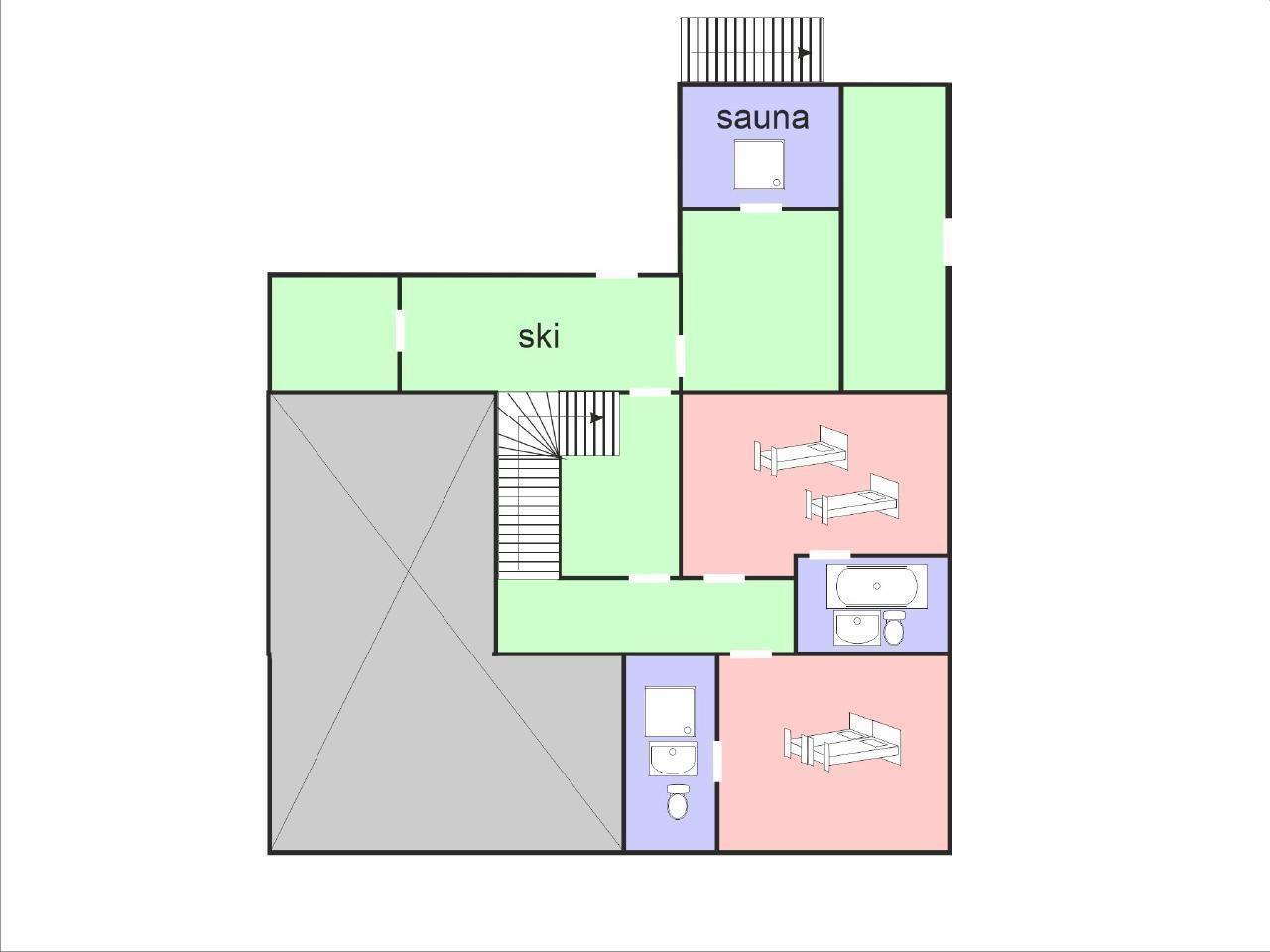 Erdgeschoss: Auf dieser Etage befinden sich die Sauna mit Dusche sowie zwei weitere Schlafzimmer mit eigenem Bad: ein Schlafzimmer mit franz. Doppelbett und ein Schlafzimmer mit zwei Einzelbetten. Es gibt einen Skiraum.