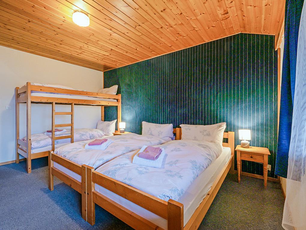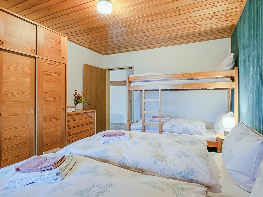 CH 384.24 Chaletwohnung 4-8 Pers.: Freundliche 4-Zimmerwohnung mit 90 qm Wohnfläche, 2. Etage. Wohn-/Essraum, ausgebaut bis in den Dachgiebel, mit Kamin, Couchgarnitur, Smart-TV, Esstisch, Küchenzeile (Backofen, Spülmaschine). Zwei Doppelzimmer. 4-Bettzimmer mit 2 Einzelbetten, Etagenbett. Bad: Du, Bw, Wb, WC. Balkon mit Sitzmöbeln, schönem Talblick.