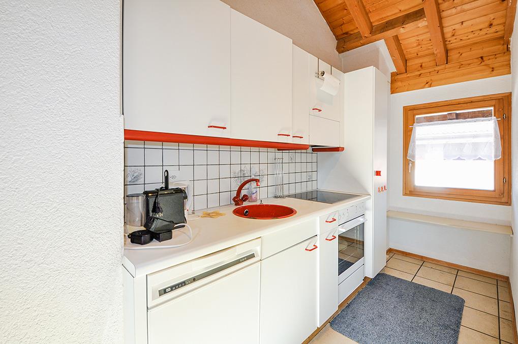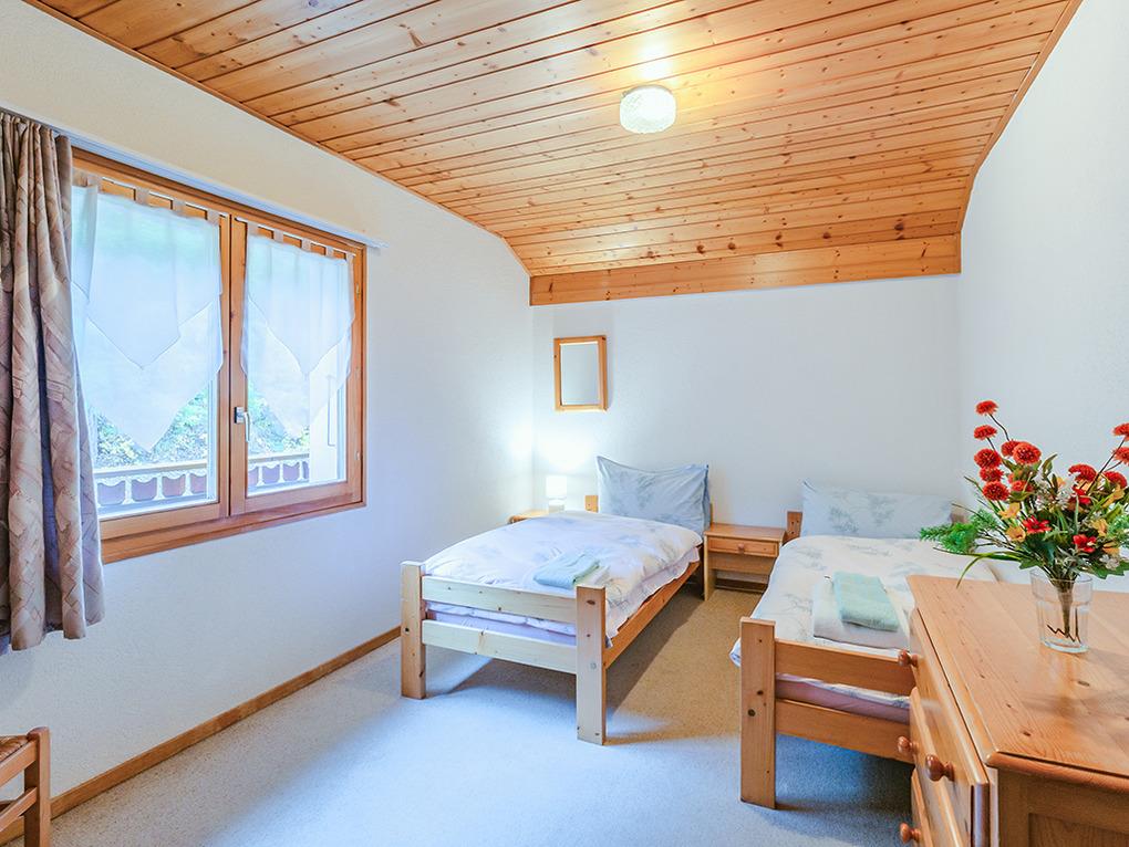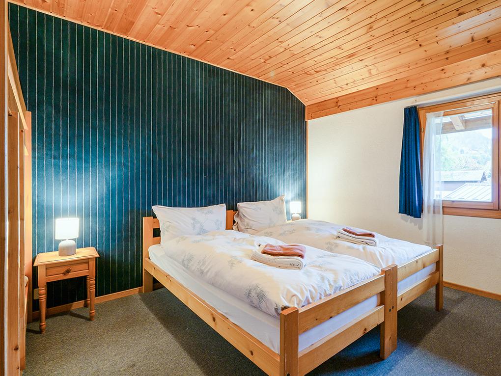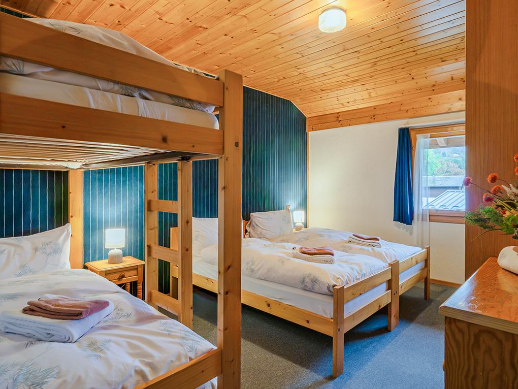 CH 384.24 Chaletwohnung 4-8 Pers.: Freundliche 4-Zimmerwohnung mit 90 qm Wohnfläche, 2. Etage. Wohn-/Essraum, ausgebaut bis in den Dachgiebel, mit Kamin, Couchgarnitur, Smart-TV, Esstisch, Küchenzeile (Backofen, Spülmaschine). Zwei Doppelzimmer. 4-Bettzimmer mit 2 Einzelbetten, Etagenbett. Bad: Du, Bw, Wb, WC. Balkon mit Sitzmöbeln, schönem Talblick.