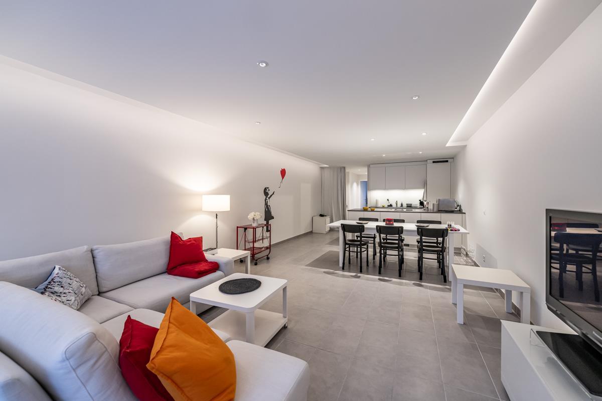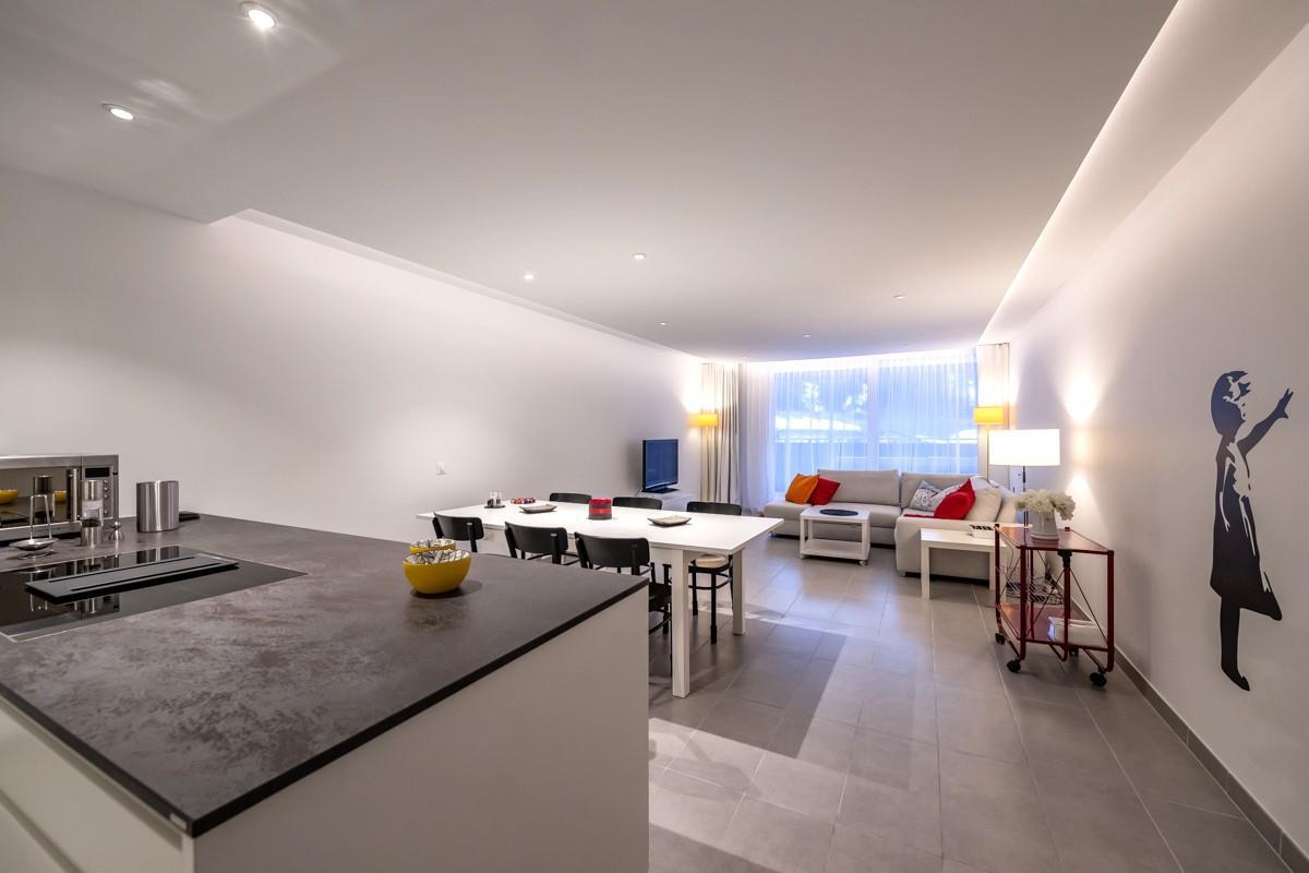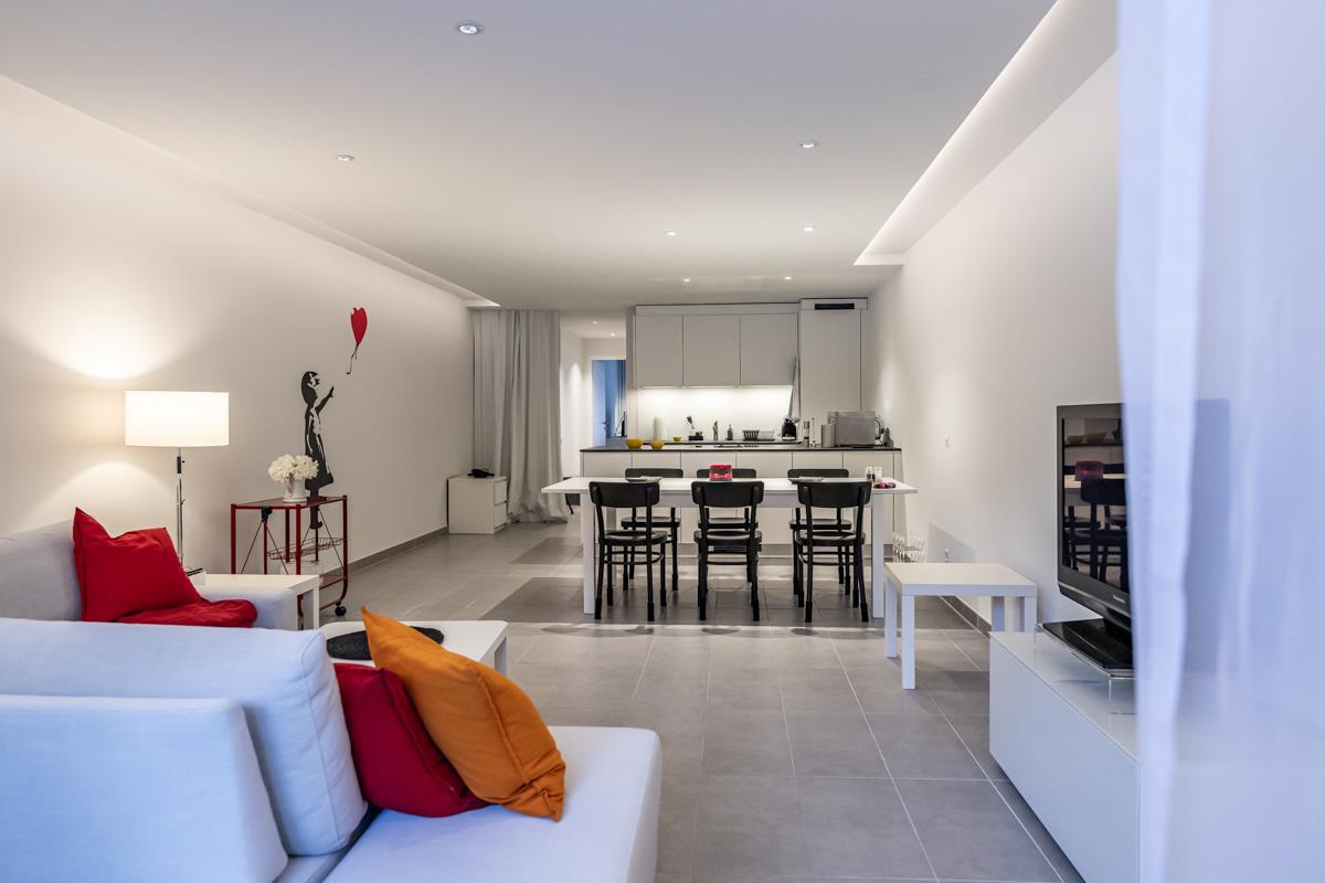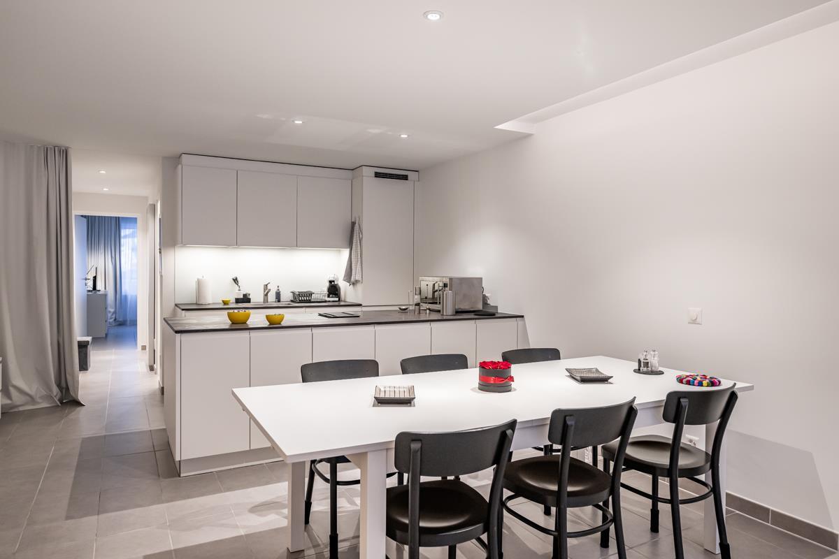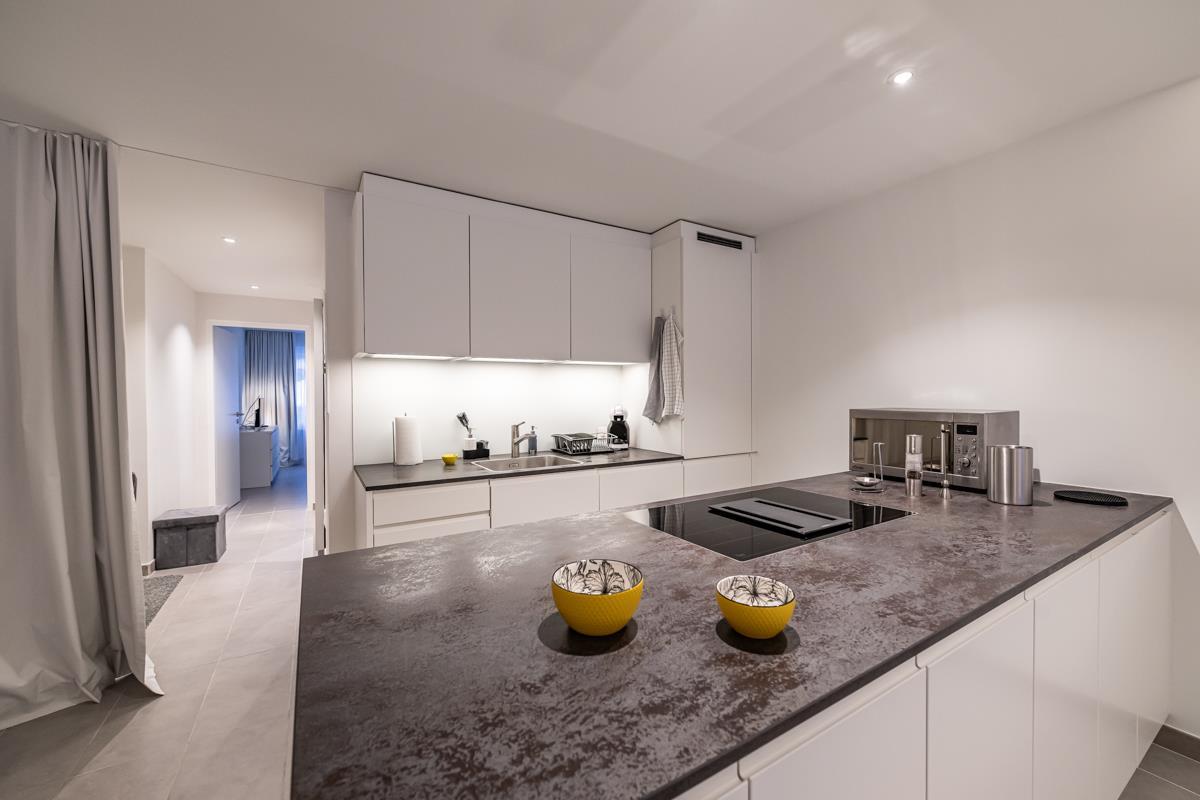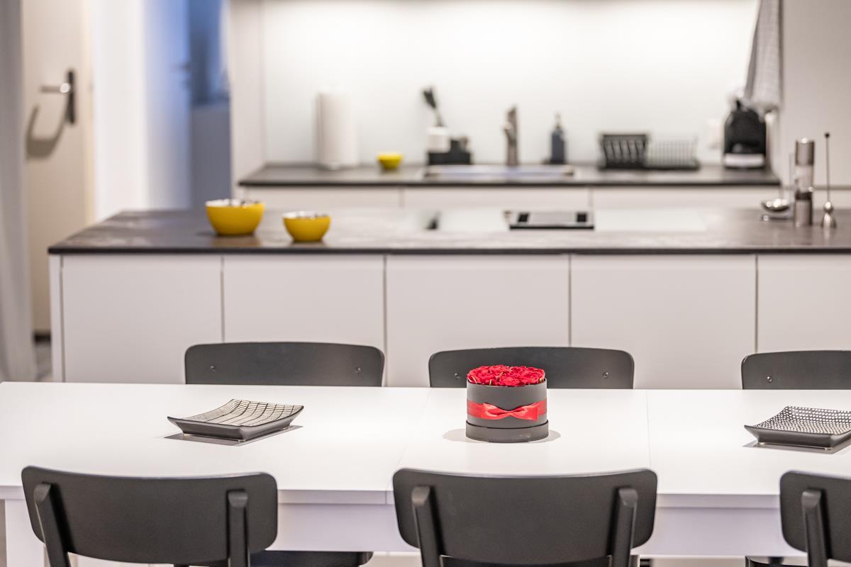 Offene Küche: Induktionsherd, horizontaler Dampfabzug. Backofen. Grosser Kühlschrank, separater Tiefkühlschrank. Geschirrspüler. Kapselkaffeemaschine. Mikrowelle.