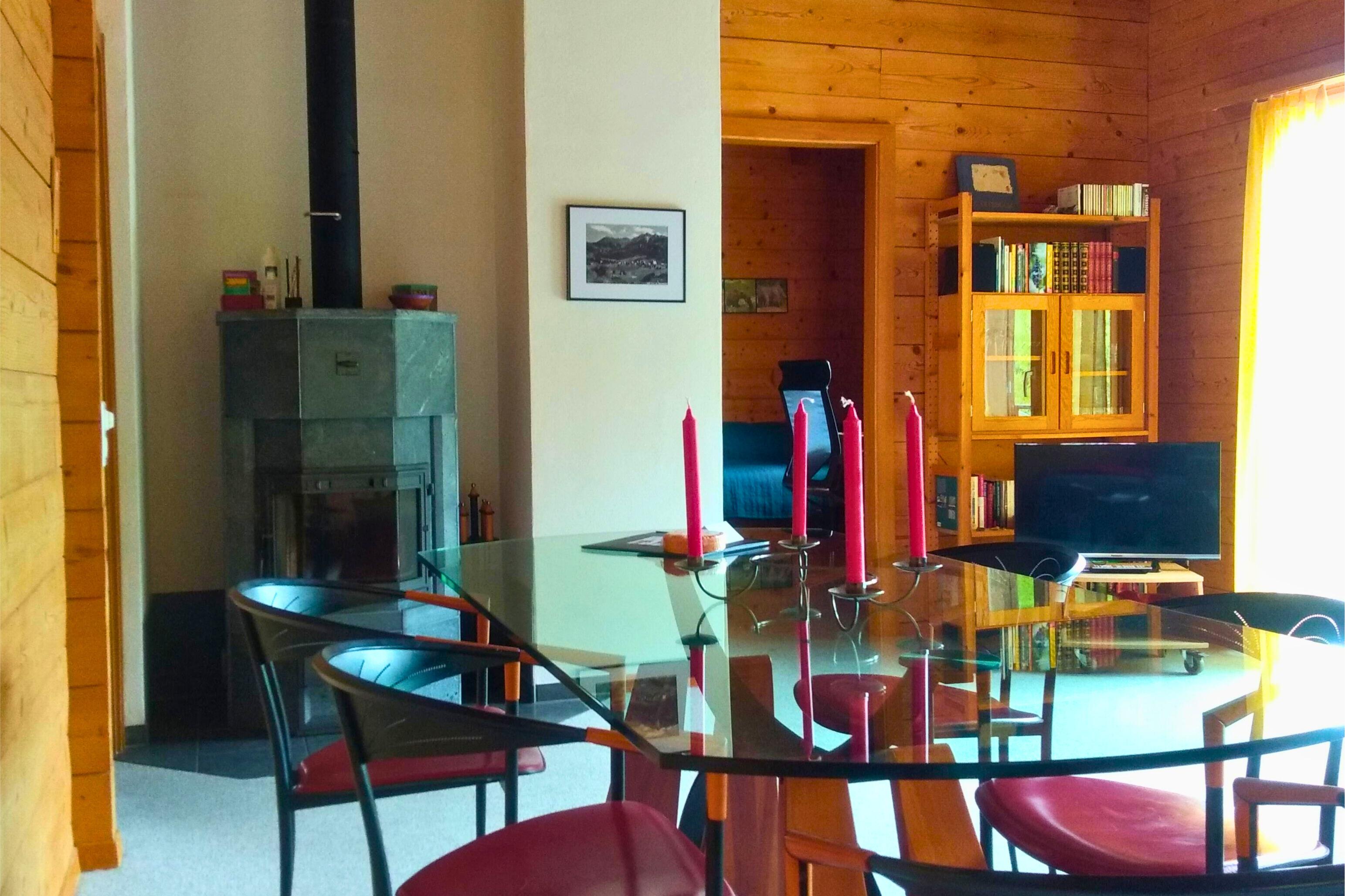 - Grosszügiges Wohnzimmer mit grossem Esstisch, Specksteinofen und gemütlichem Sofa