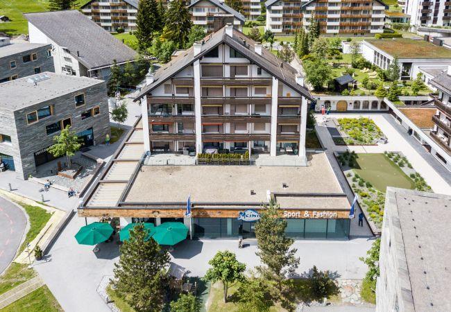 Diese grosszügige 5.5-Zimmerwohnung befindet sich im 4. Stock eines Mehrfamilienhauses direkt bei der Talstation in Laax mit Sicht auf das Rocksresort und die Piste.