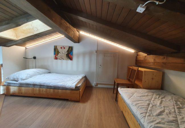 Das Schlafzimmer ist mit einem komfortablen Doppelbett und einem praktischen Kleiderschrank eingerichtet und wird durch eine Schiebetür vom Wohnzimmer abgetrennt, was sowohl Privatsphäre als auch eine offene Raumwirkung ermöglicht. Das Badezimmer verfügt über ein Lavabo, eine Dusche und ein WC.