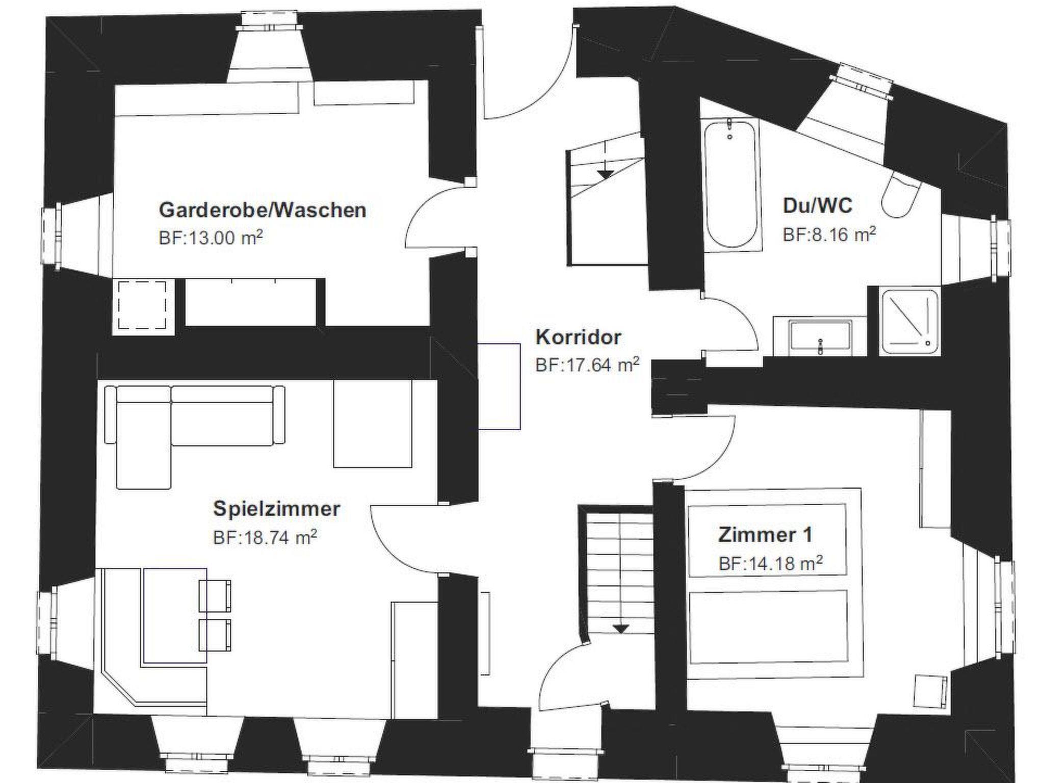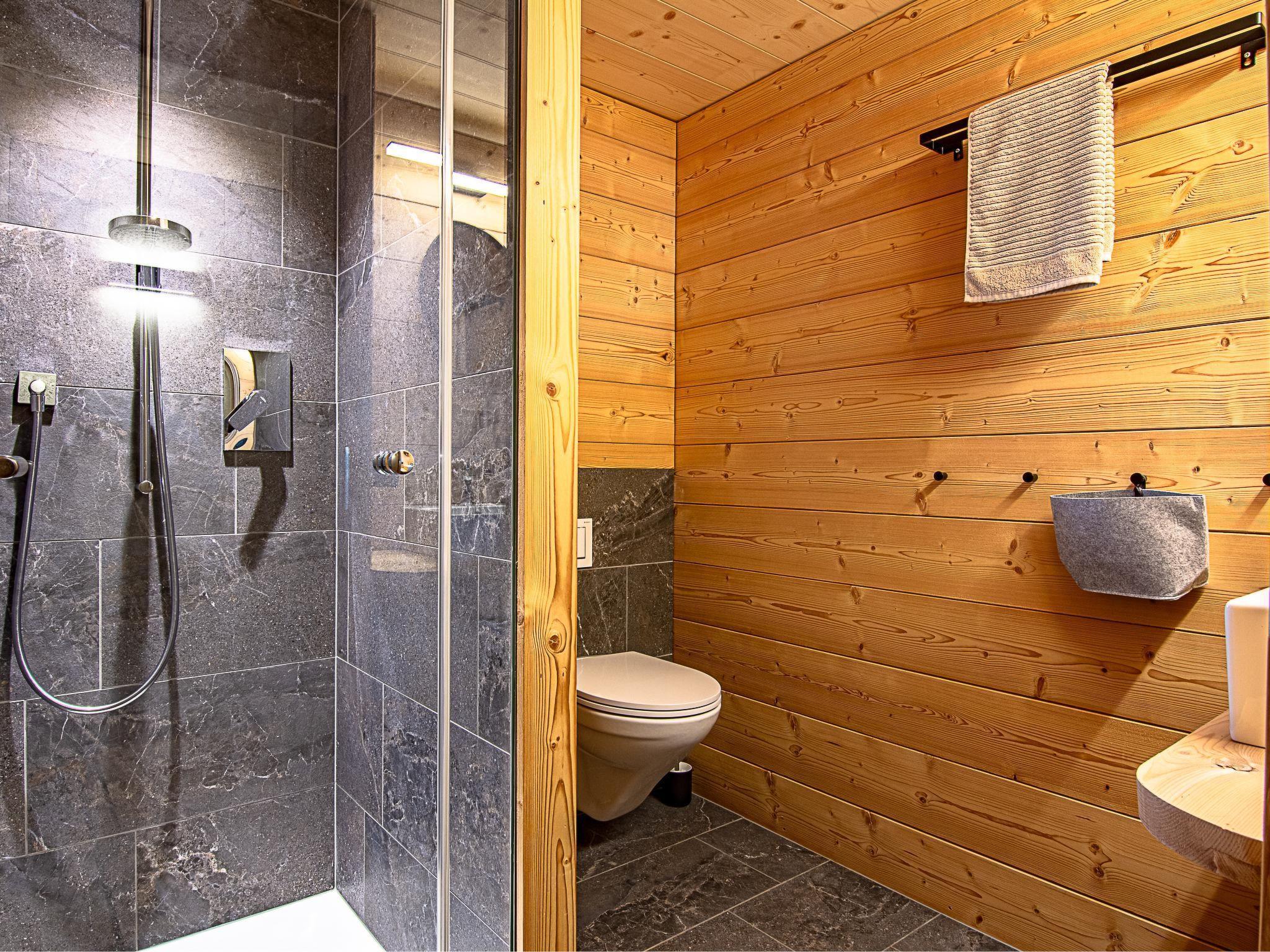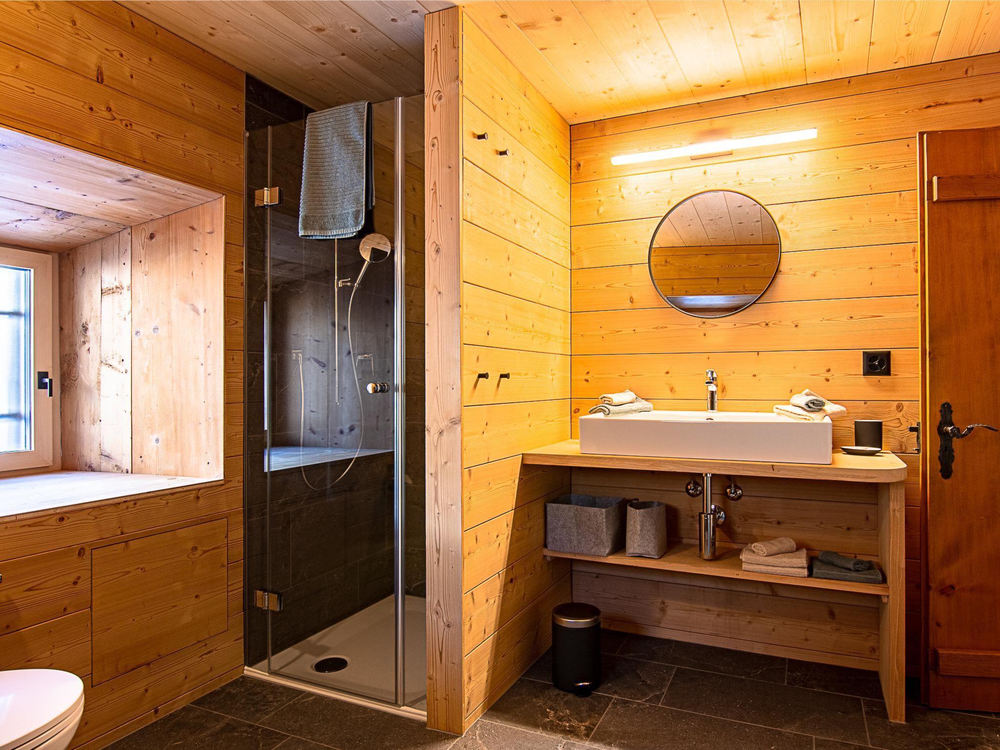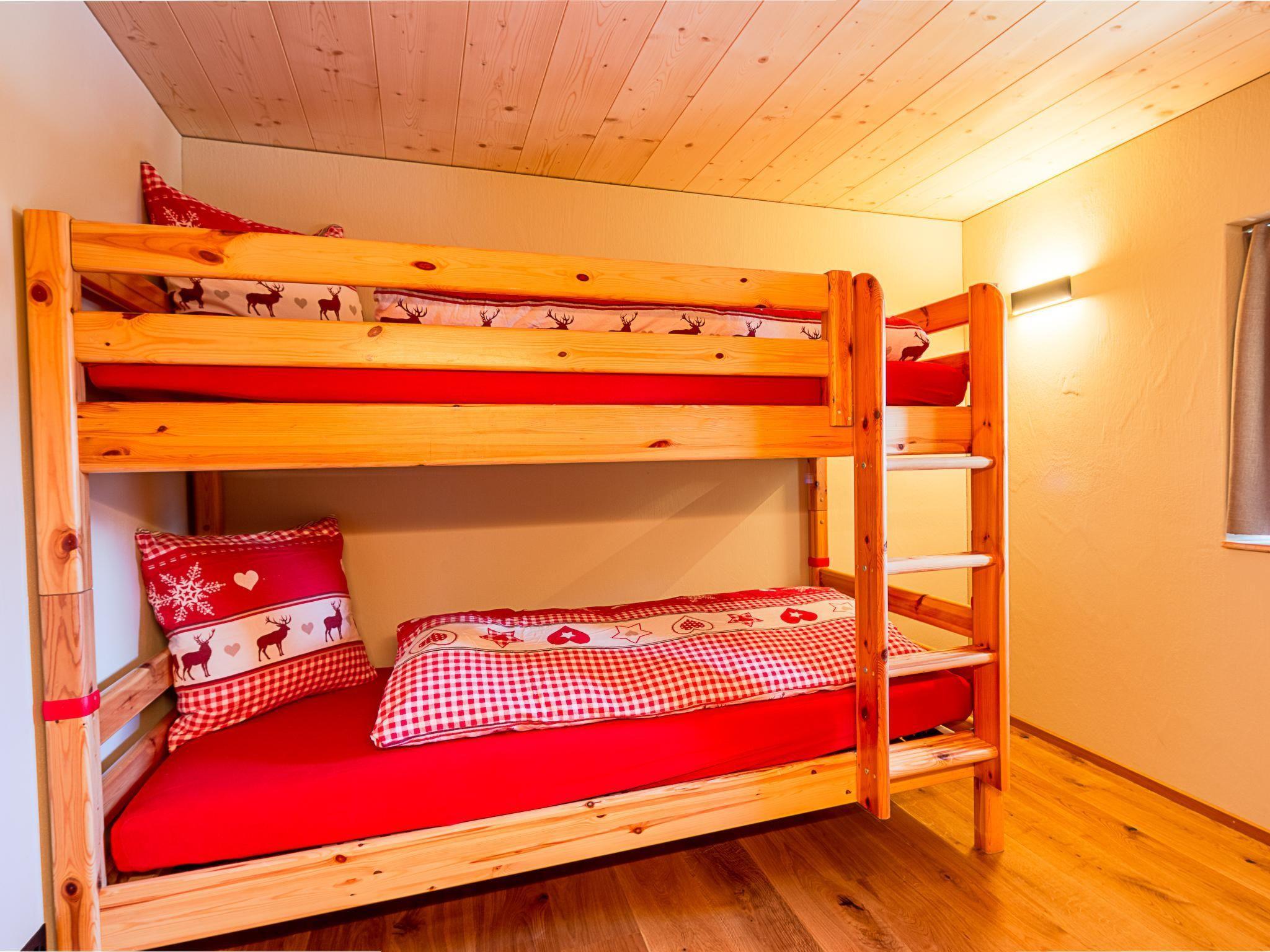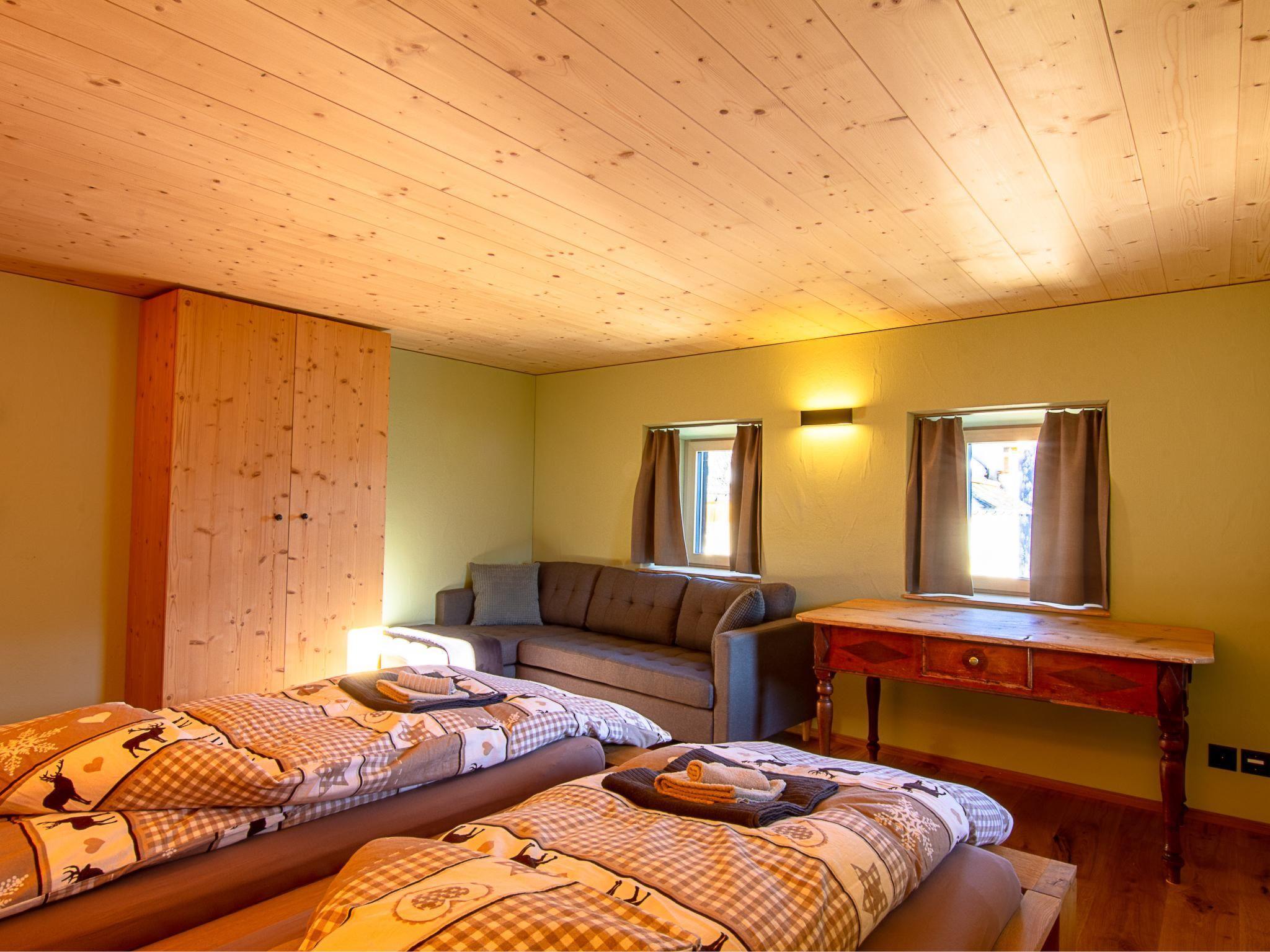 Im Erdgeschoss: ein Schlafzimmer mit Doppelkajütenbett, eine Nasszelle mit Bad/Dusch/WC, ein Spielzimmer mit Ausziehsofa sowie eine Waschküche mit Garderobe und grossem Skischuhtrockner. Obergeschoss: Schlafgeschoss mit 4 Schafzimmern, zwei Nasszellen mit jeweils einer Dusche/WC. Im neu ausgebauten Dachgeschoss: grosszügige moderne Küche mit Backofen, Mikrowelle, grossem Kühlschrank, Induktionskochherd. Die Küche ist mit Geschirr für 14 Personen ausgestattet. Der Essbereich verfügt über einen 3.60m grossen massiven Holztisch. Der Wohnbereich ist durch einen modernen Cheminéeofen vom Essbereich getrennt.