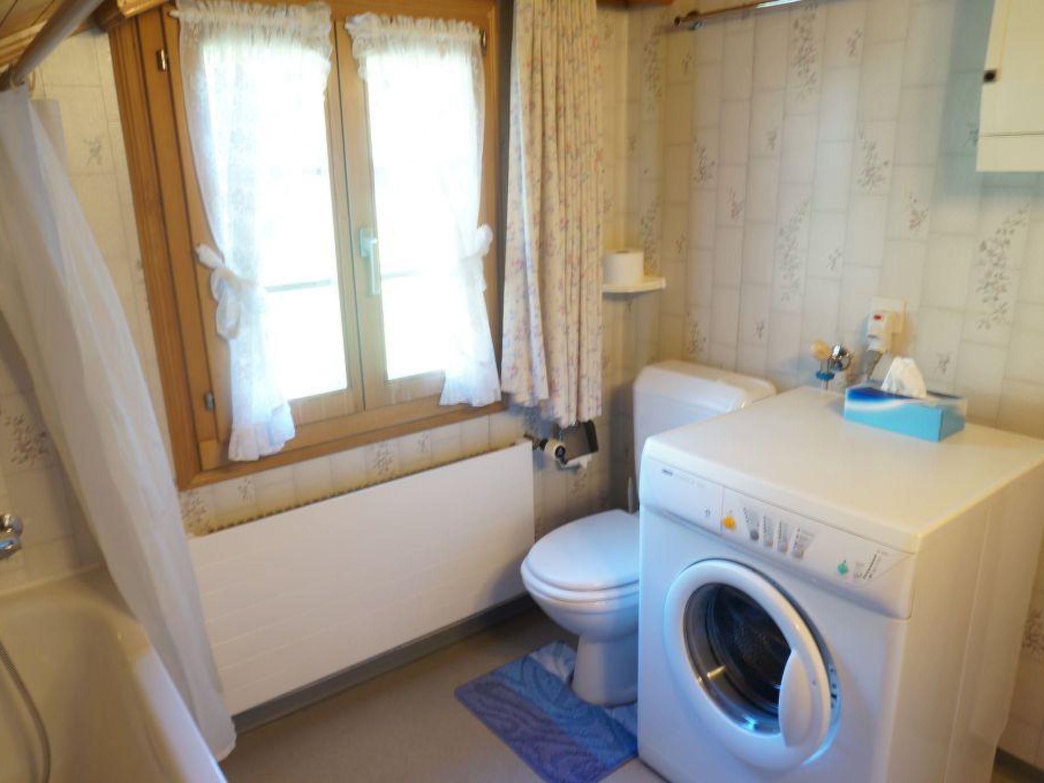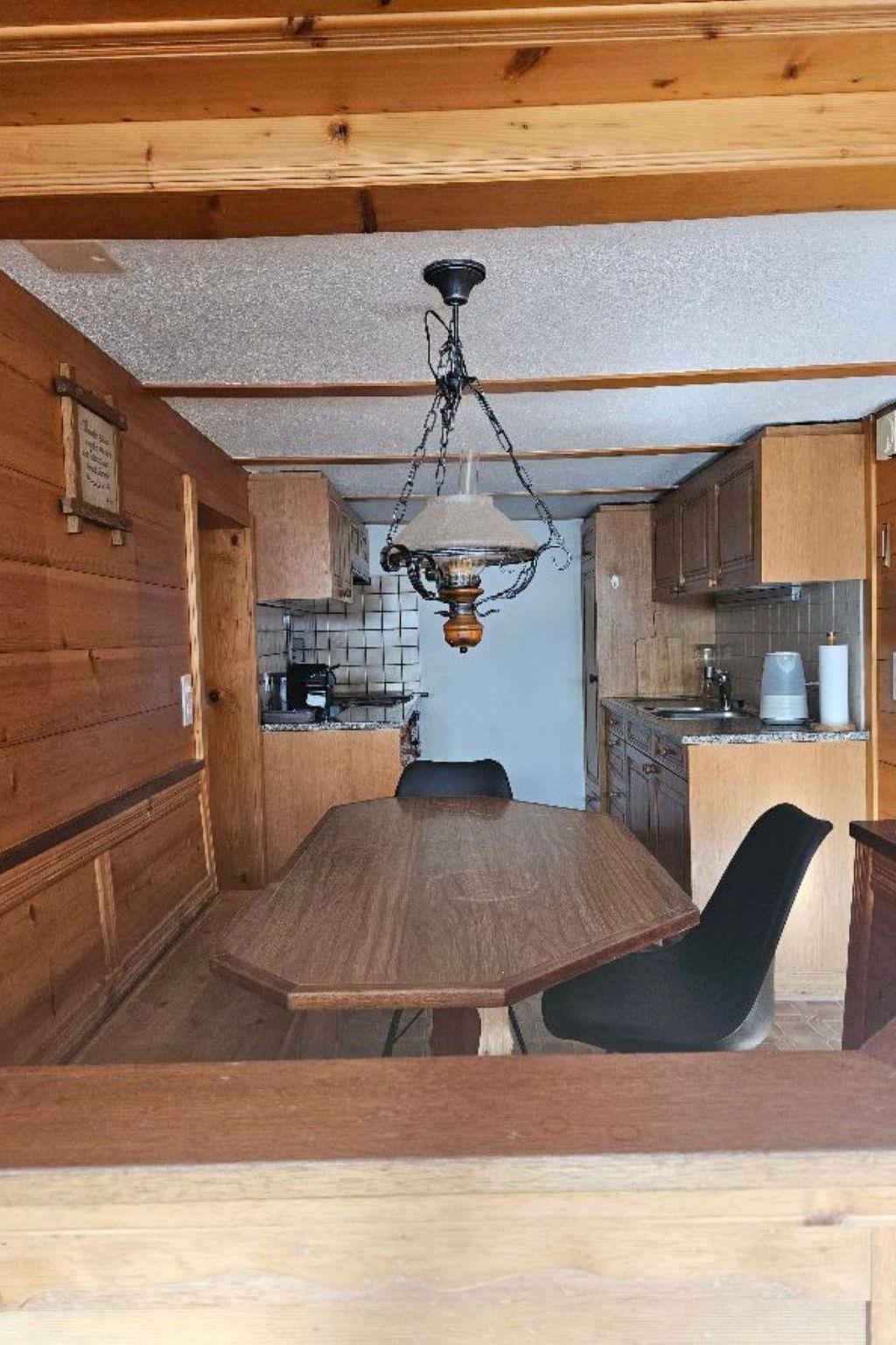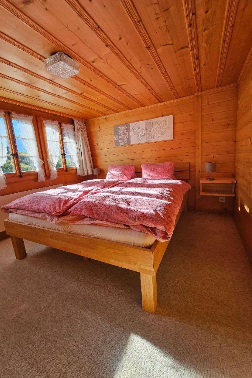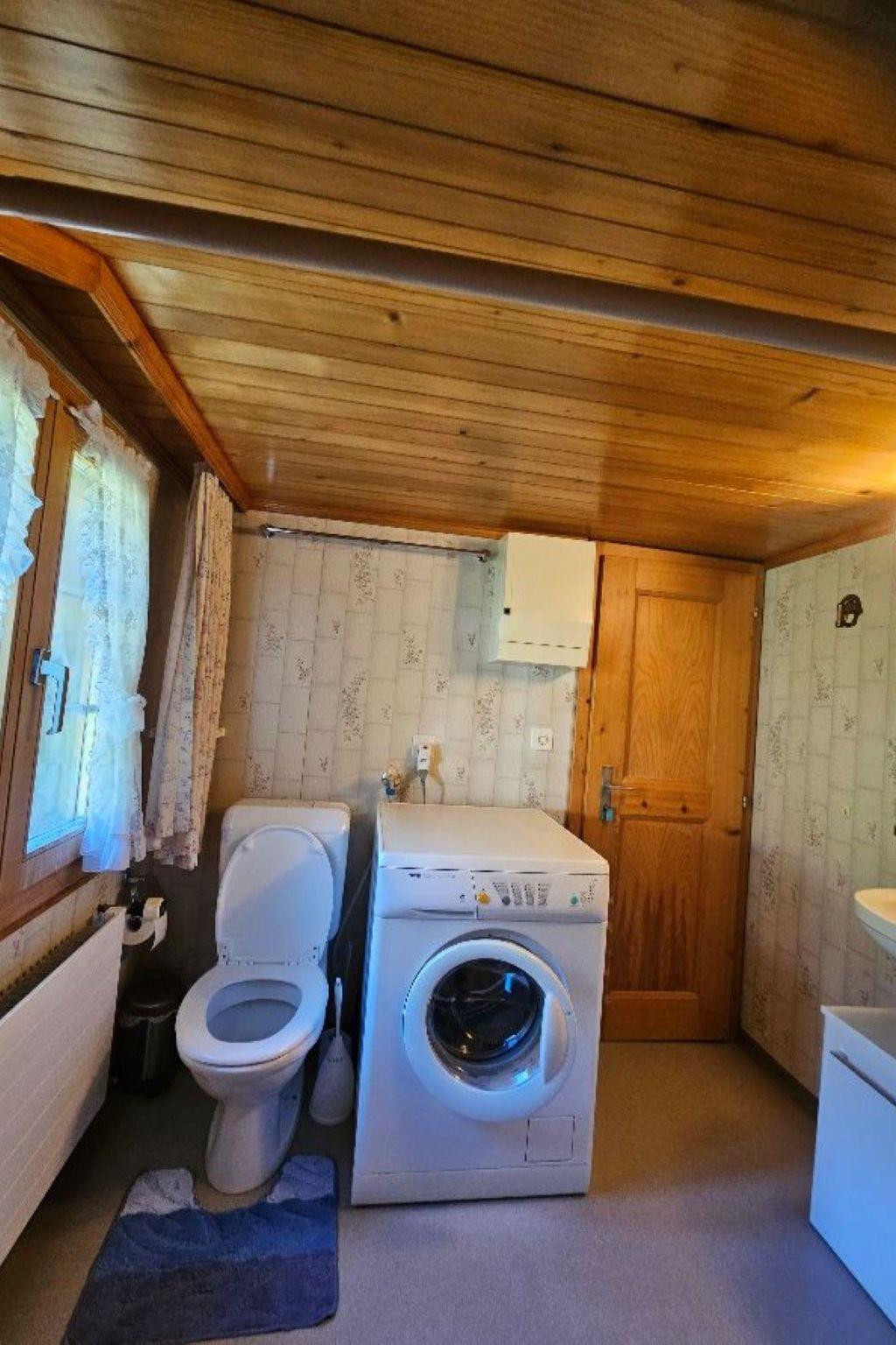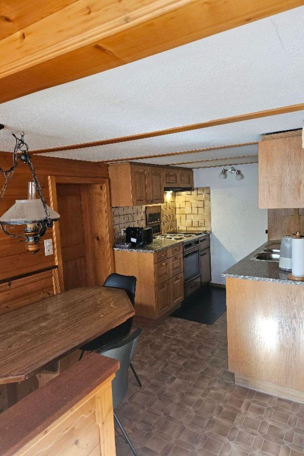 Wohn-/ Esszimmer mit Küche (u.a. ausgestattet mit Holzofen, Kochfeld mit 4 Herdplatten, Backofen, Kühlschrank mit Gefrierfach, Geschirrspüler, Kapsel-Kaffeemaschine (Nespresso) sowie Fondue- und Raclette-Set), Esstisch mit 4 Stühlen, gemütliche Sitzecke mit TV/Radio und Zugang zum Balkon. 1 Badezimmer mit Dachschräge, Badewanne/WC und Waschmaschine. 1 Schlafzimmer mit Grand Lit (160x200cm), grosser Schrank. 1 weiteres Zimmer mit zwei Einzelbetten (2x90x200cm) und Kleiderschrank. WiFi. Die Raumhöhe beträgt zwischen 1.88 m bis 1.95 m.