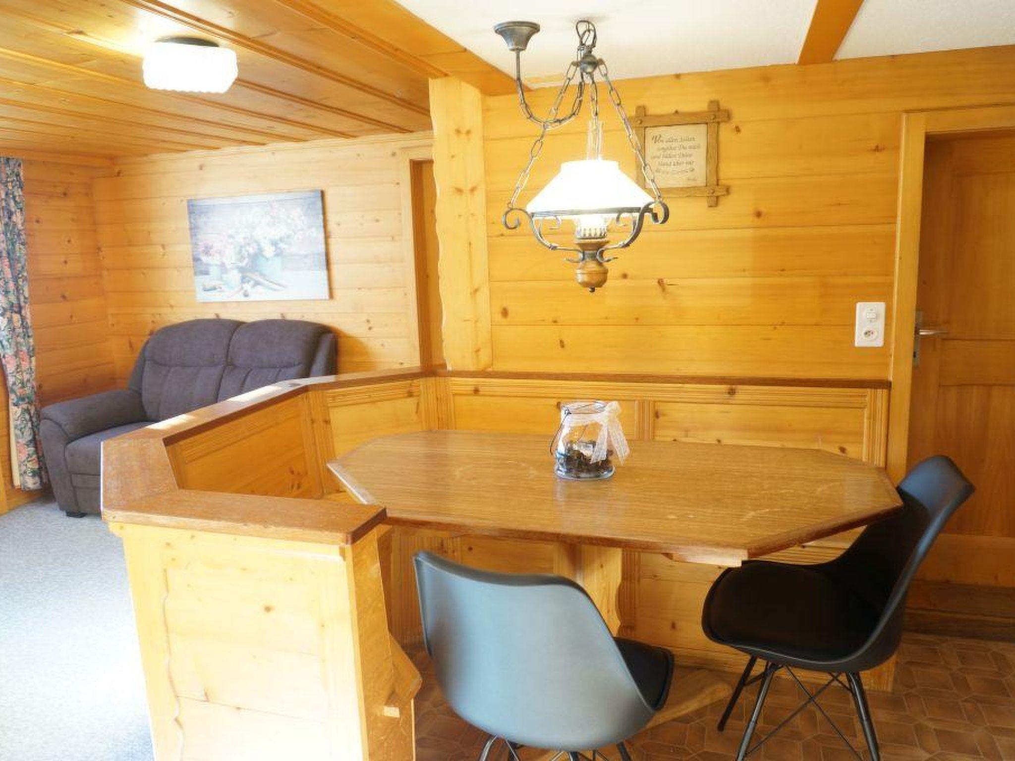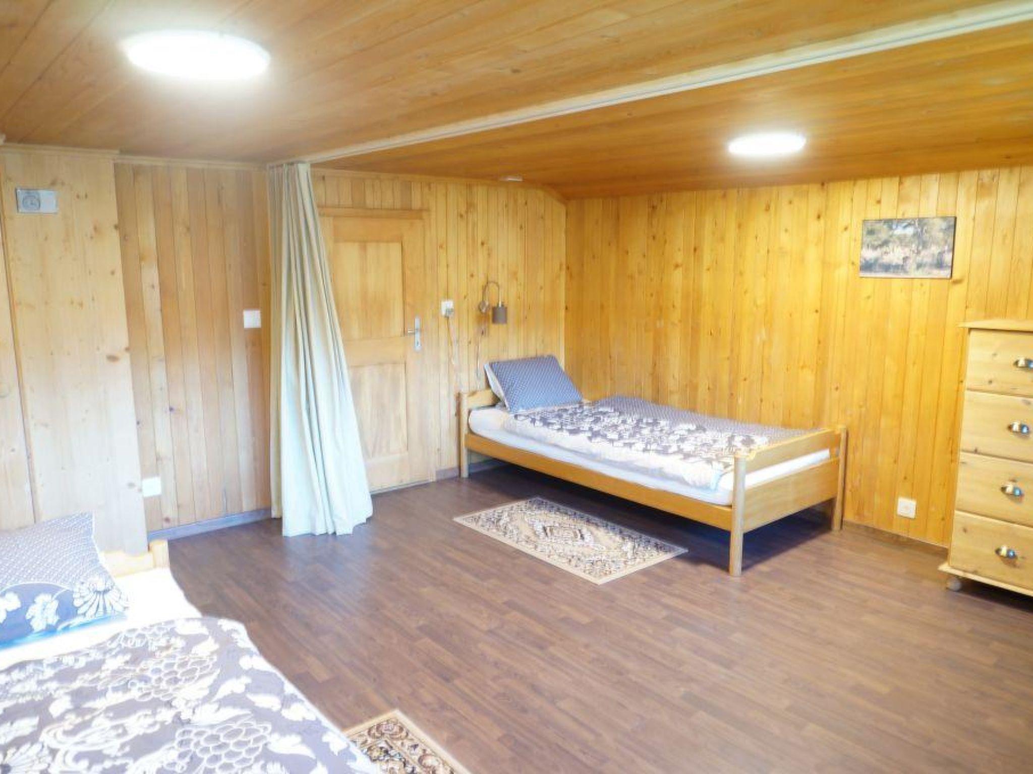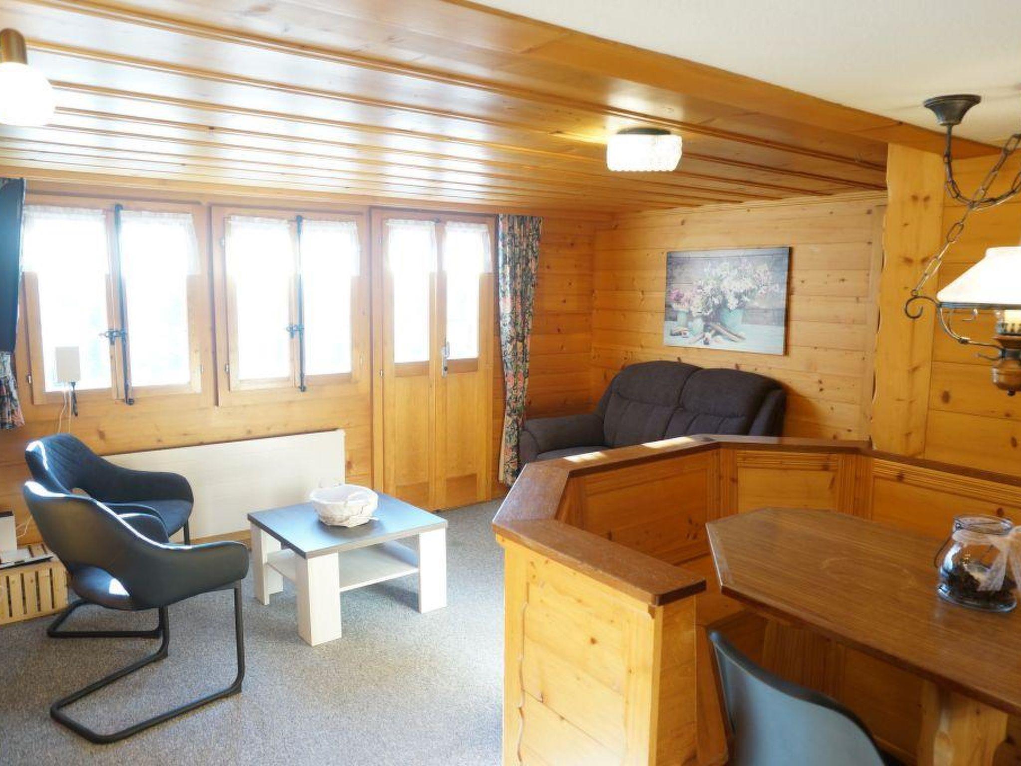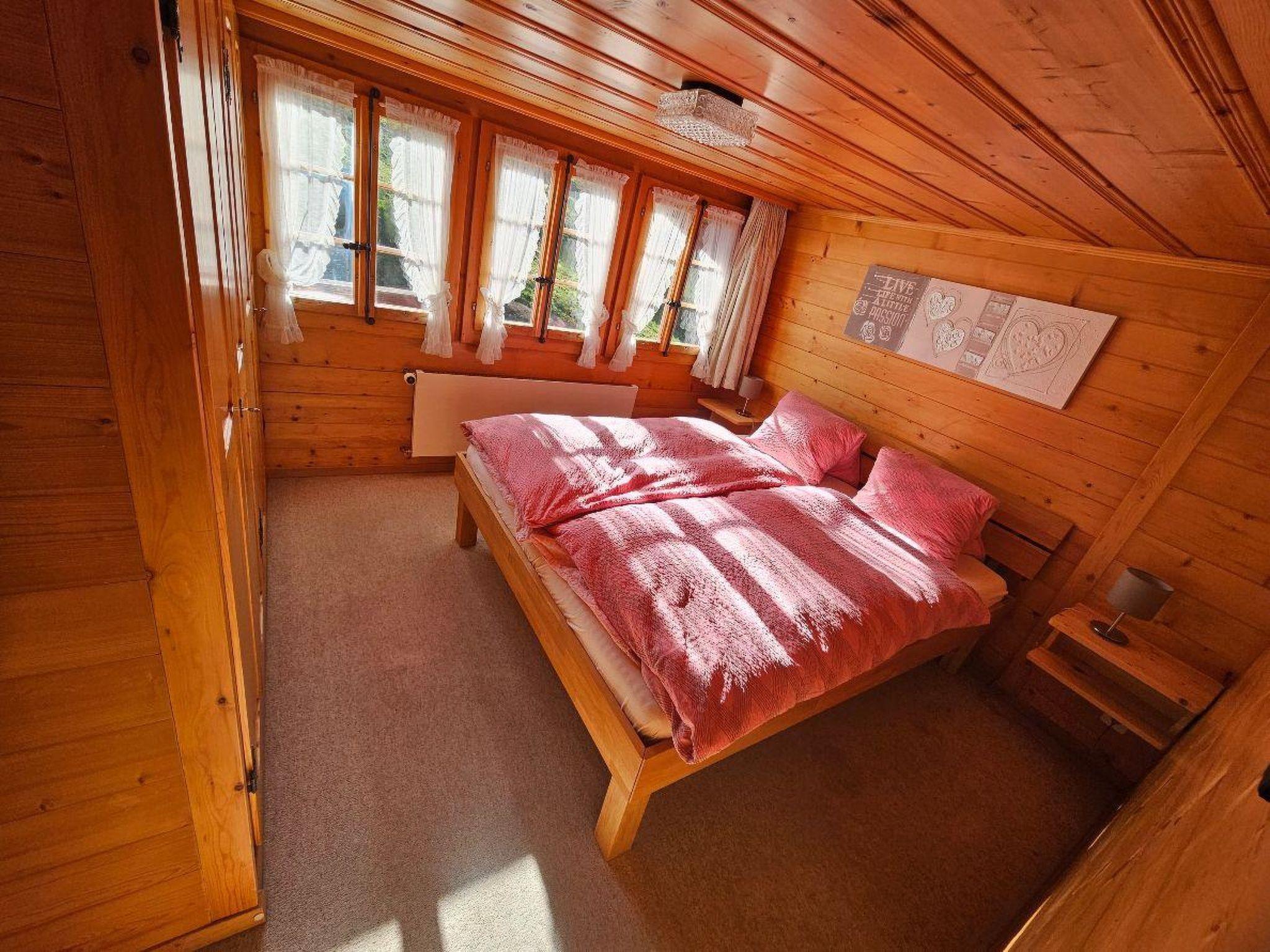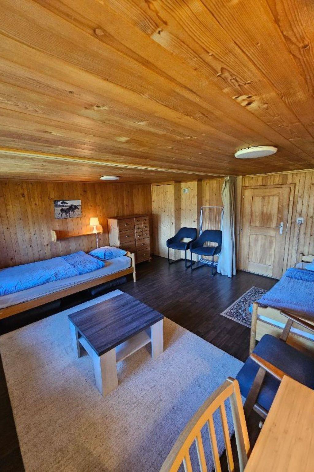 Wohn-/ Esszimmer mit Küche (u.a. ausgestattet mit Holzofen, Kochfeld mit 4 Herdplatten, Backofen, Kühlschrank mit Gefrierfach, Geschirrspüler, Kapsel-Kaffeemaschine (Nespresso) sowie Fondue- und Raclette-Set), Esstisch mit 4 Stühlen, gemütliche Sitzecke mit TV/Radio und Zugang zum Balkon. 1 Badezimmer mit Dachschräge, Badewanne/WC und Waschmaschine. 1 Schlafzimmer mit Grand Lit (160x200cm), grosser Schrank. 1 weiteres Zimmer mit zwei Einzelbetten (2x90x200cm) und Kleiderschrank. WiFi. Die Raumhöhe beträgt zwischen 1.88 m bis 1.95 m.