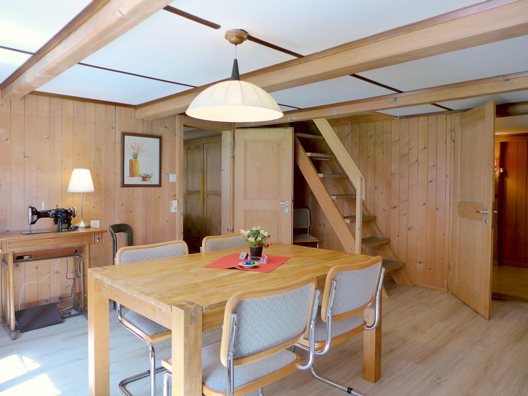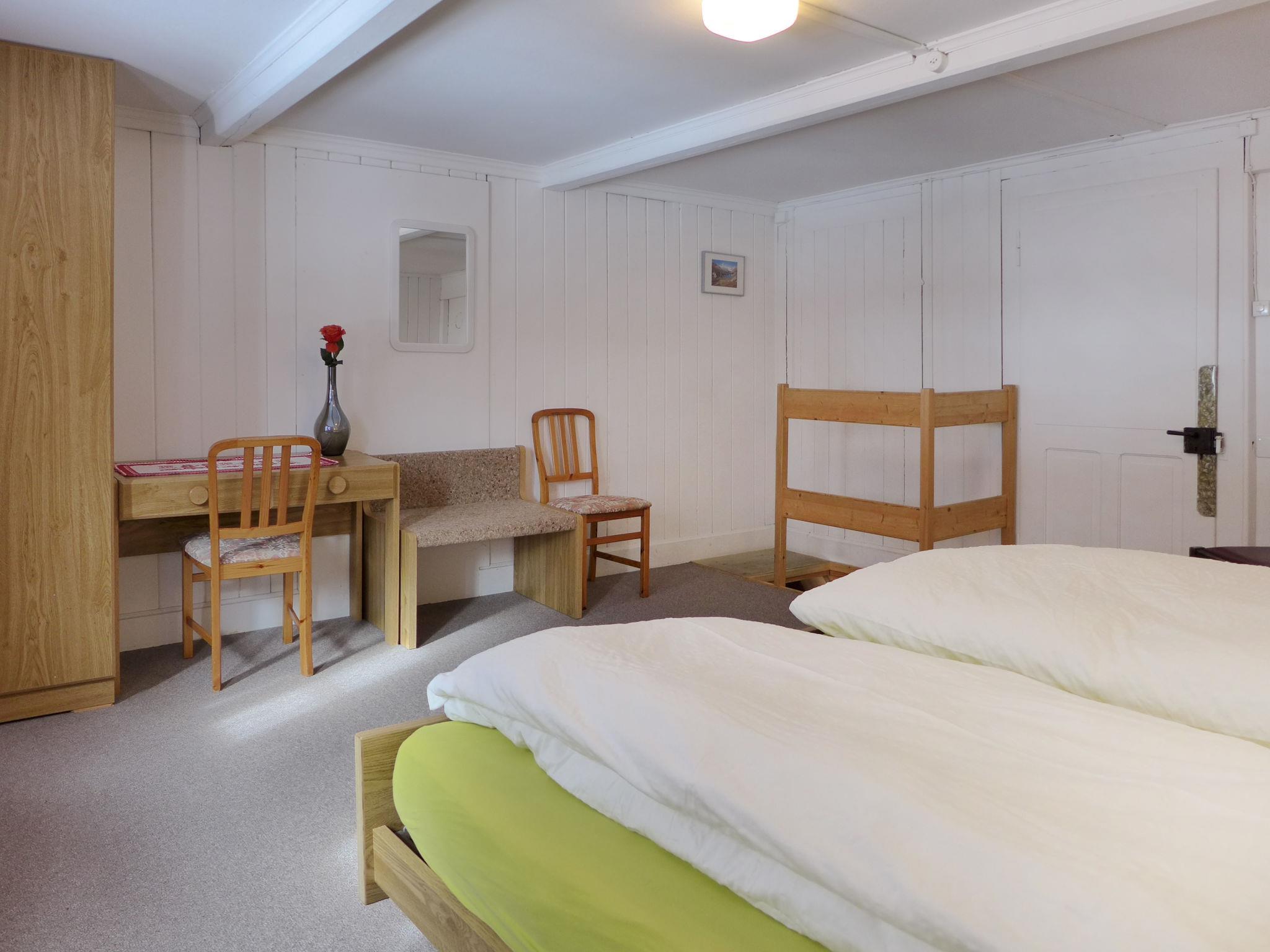 3-Zimmer-Wohnung 80 m2 auf 2 Stockwerken, im erhöhten Erdgeschoss. Geräumig, gemütlich und mit viel Holz eingerichtet: Deckenhöhe 185 - 200 cm. Wohn-/Esszimmer mit 1 Diwanbett, Sat-TV, Flachbildschirm und Radio. 1 Doppelzimmer mit 2 Betten (90 cm, Länge 200 cm). Ausgang zum Balkon. Offene Küche (3 Kochplatten, Backofen, Geschirrspüler, Toaster, Wasserkocher, Mikrowelle, elektrische Kaffeemaschine, Racletteofen, Fondue Set (Käse)) mit Esstisch. Dusche/WC. Obergeschoss: (steile Treppe) 1 grosses Doppelzimmer mit 2 Betten (90 cm, Länge 200 cm). Kleiner Balkon. Balkonmöbel, Abstellkammer. Herrliche Sicht auf die Berge und die Ortschaft. Zur Verfügung: Waschmaschine, Babybett bis 2 Jahre (extra), Haartrockner. Internet (Wireless LAN, gratis). Parkplatz. Bitte beachten: Nichtraucher-Unterkunft.