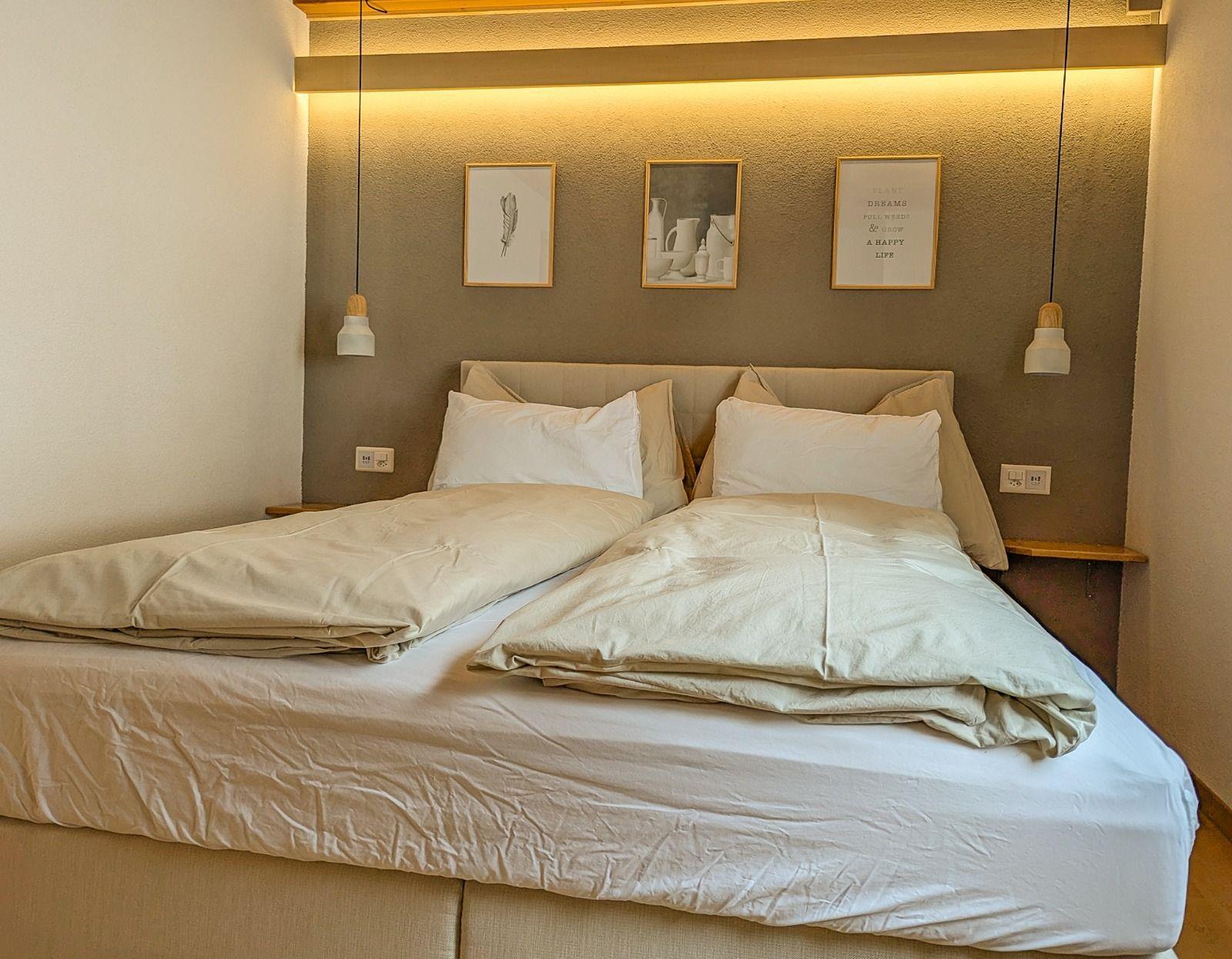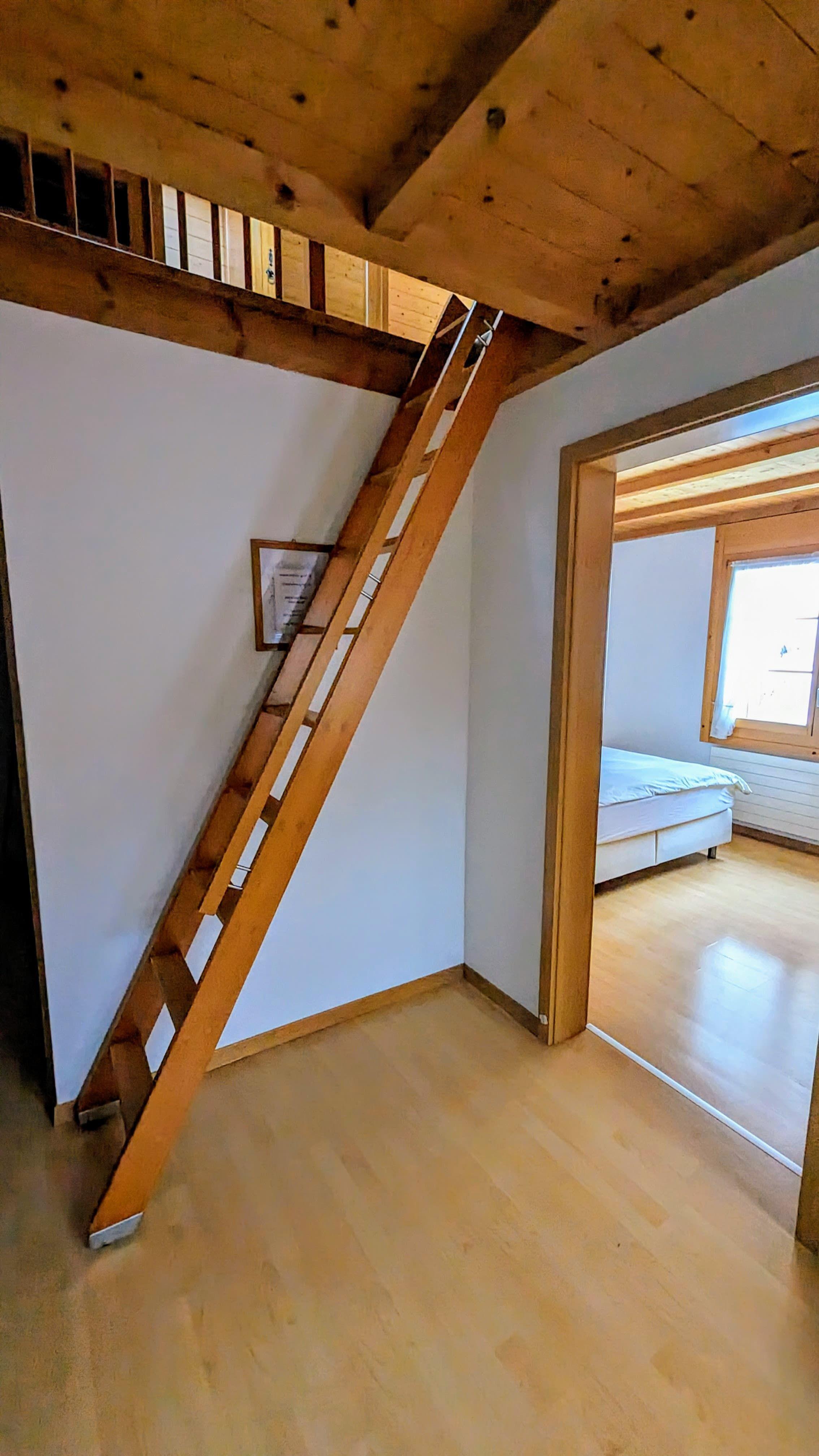 Es sind zwei Schlafzimmer vorhanden. Eines mit einem Doppelbett (160x200) und ein Dachzimmer mit drei Einzelbetten (Zugang über eine steile Treppe).