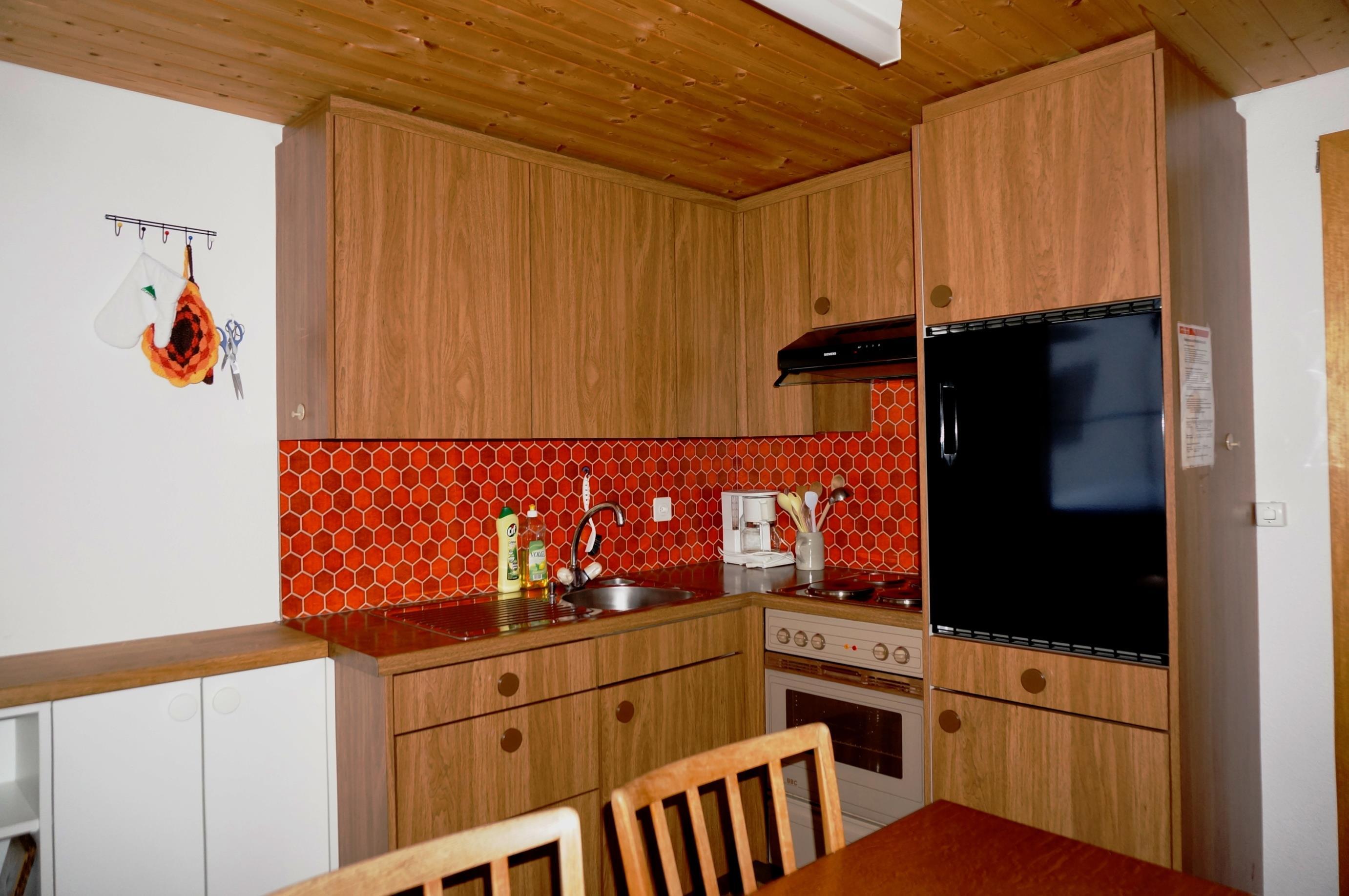 Wohnküche komplett eingerichtet, Eckbank, Tisch und Stühle, Elektroheizung, Kochherd mit 3 Herdplatten, Abzugshaube, Kühlschrank mit Gefrierfach, Kaffeekapselmaschine, Espressomaschine, Fondue- und Raclette-Set,