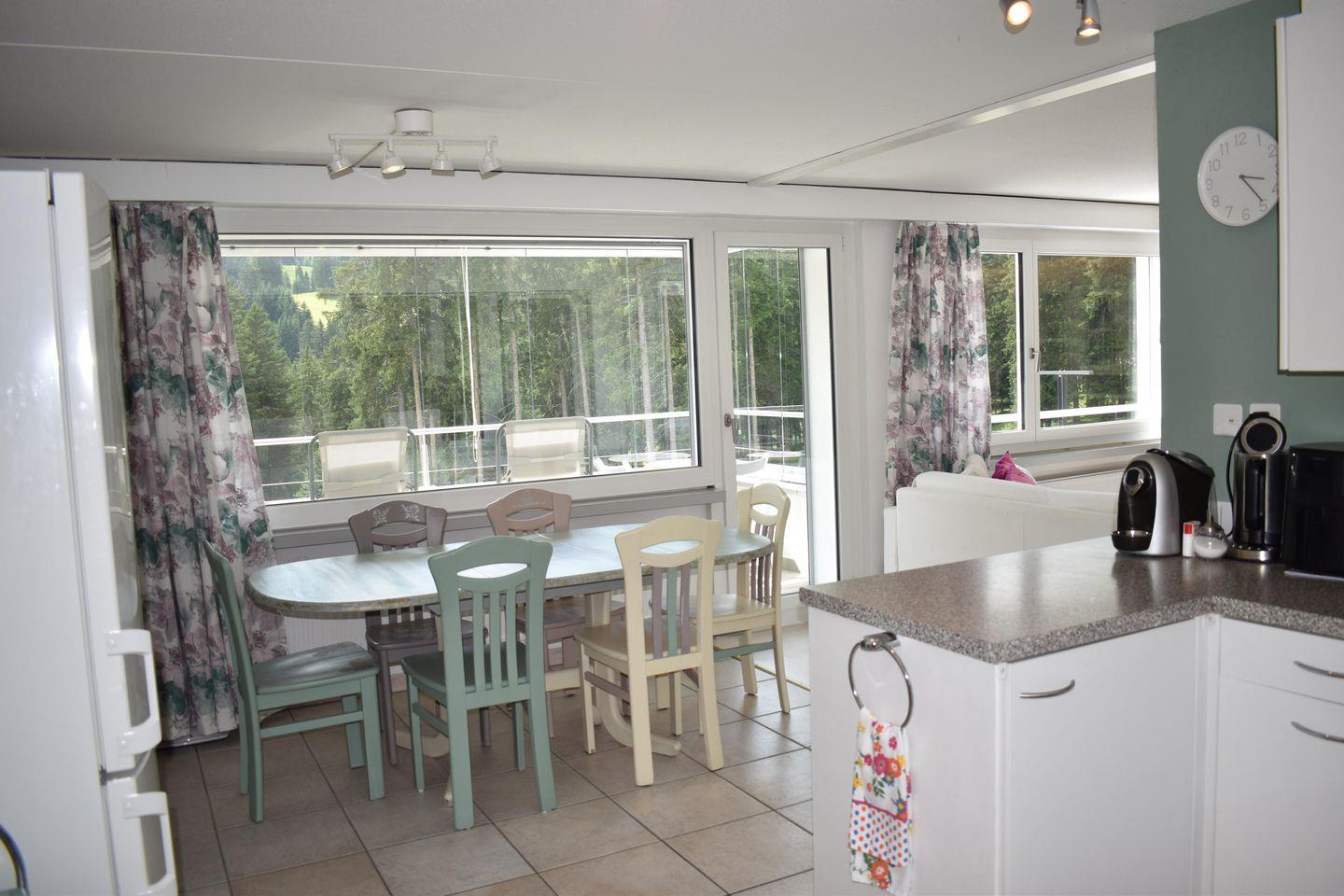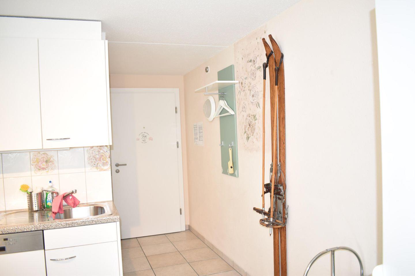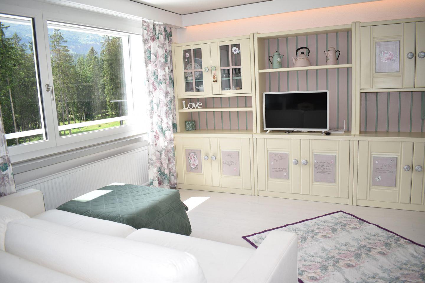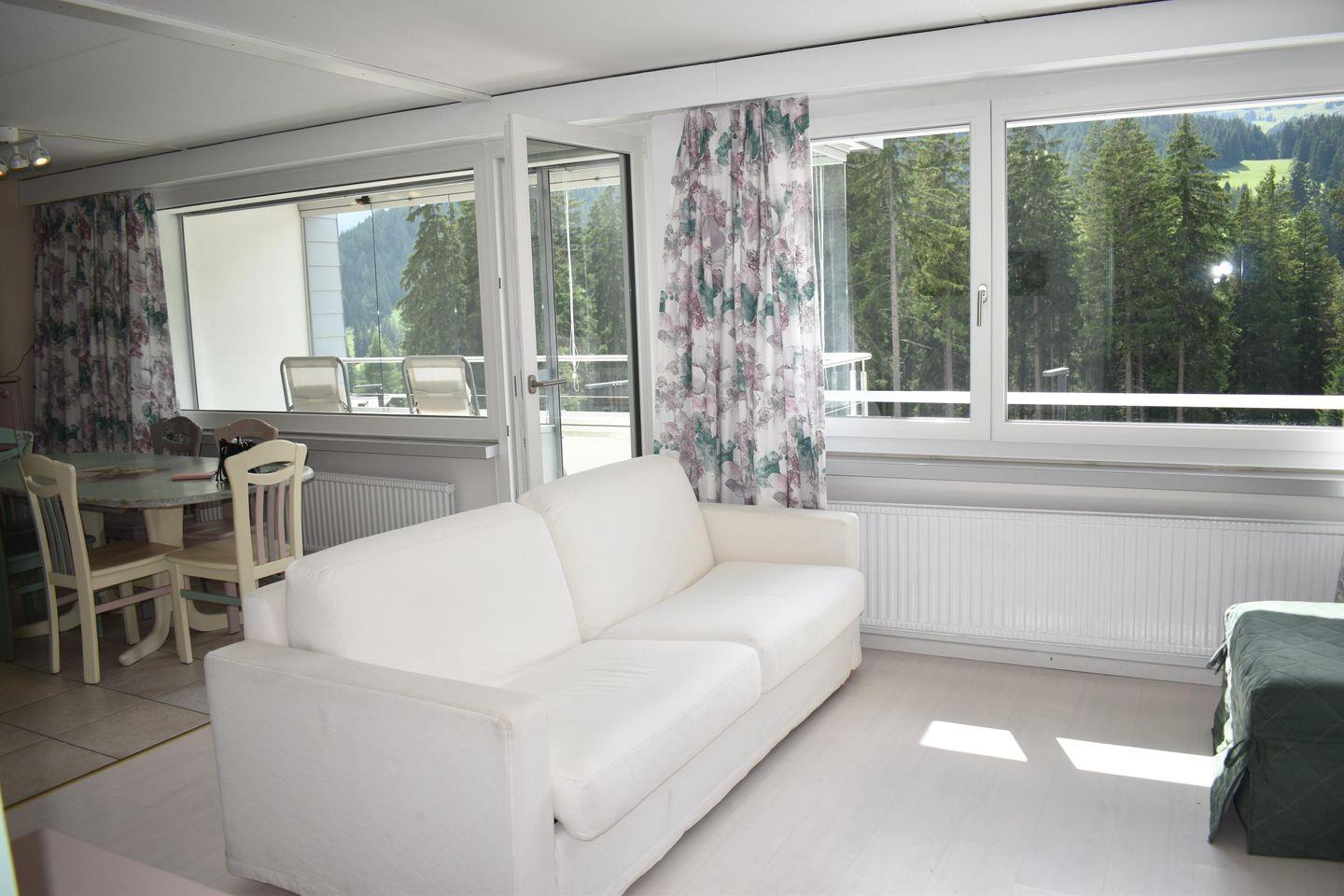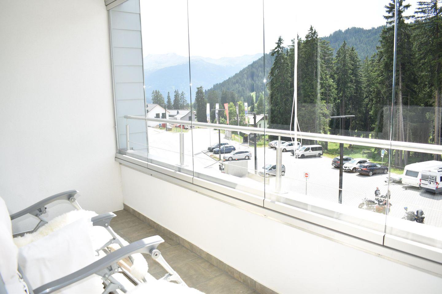 2½-Zimmer-Wohnung Nr. 202 im 2. Obergeschoss bestehend aus: Offener Eingang, Bad / WC / Lavabo, offene Küche mit 4-Platten-Glaskeramikherd, Backofen, Geschirrspüler, Dampfabzug, Kühlschrank, Tiefkühlfach und diversen Einbauschränken, Wohn- / Esszimmer mit TV, Schlafsofa, Esstisch mit Stühlen und Ausgang zum geschlossenen Westbalkon, Westbalkon, Schlafzimmer mit Doppelbett, Schrank und Kommode, Tiefgaragenplatz beim Haus Bellavista A Nr. 14 (für kleinere Autos geeignet, Garagenhöhe ca. 190 cm), Rollstuhlgängig, Gratis W-Lan, Nichtraucherwohnung, Haustiere (1 Hund) kostenpflichtig erlaubt, zur Mitbenützung: Kostenpflichtige Waschmaschine, Tumbler (Münzautomat) sowie Skiraum