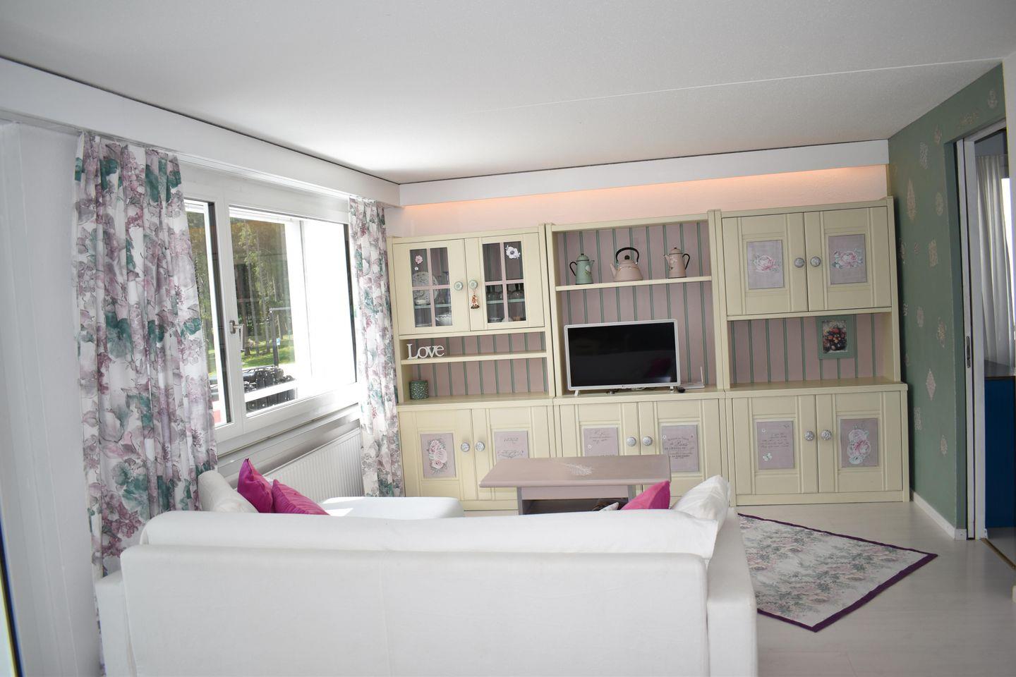 Wohn- / Esszimmer mit TV, Schlafsofa, Esstisch mit Stühlen und Ausgang zum geschlossenen Westbalkon