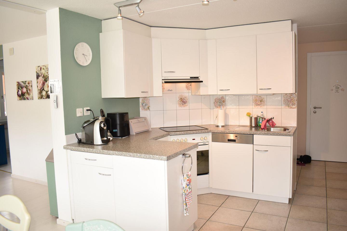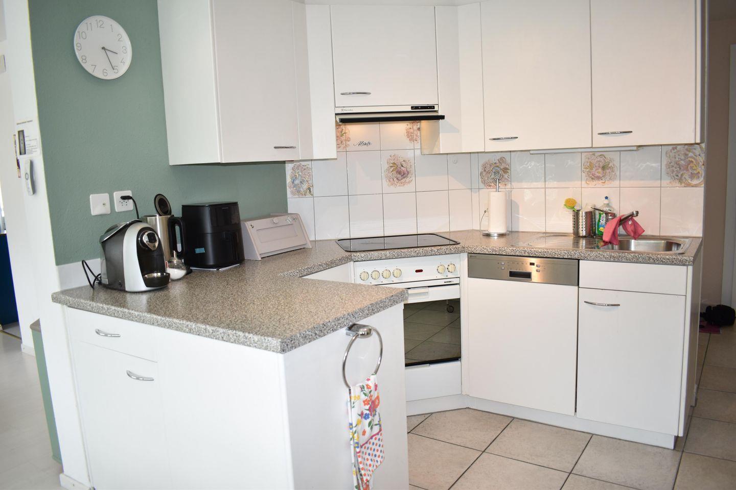 offene Küche mit 4-Platten-Glaskeramikherd, Backofen, Geschirrspüler, Dampfabzug, Kühlschrank, Tiefkühlfach und diversen Einbauschränken