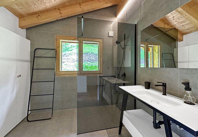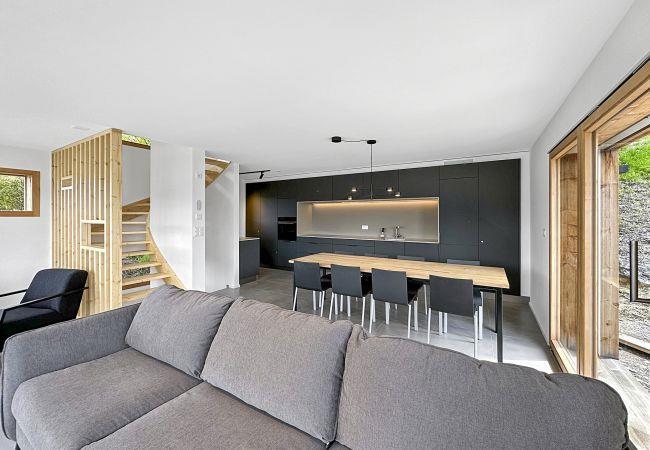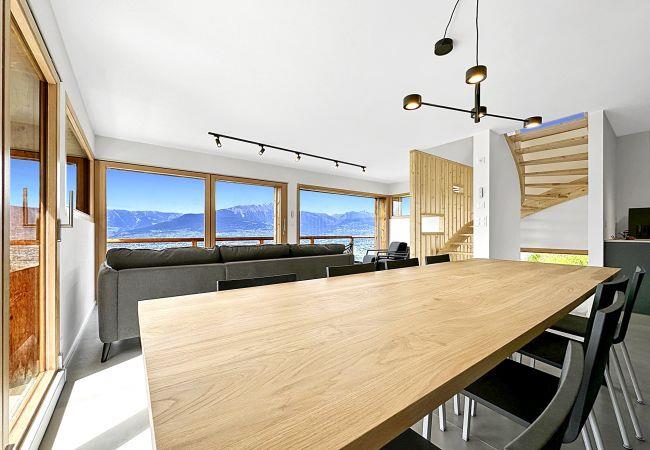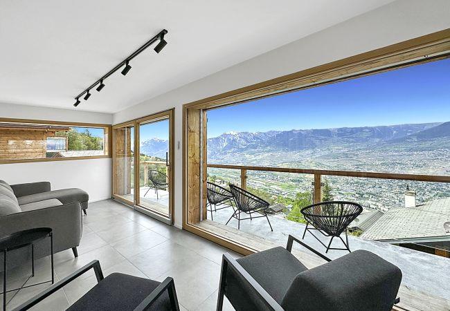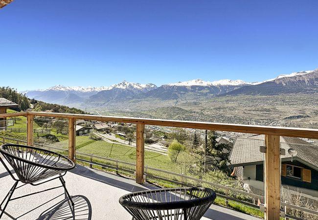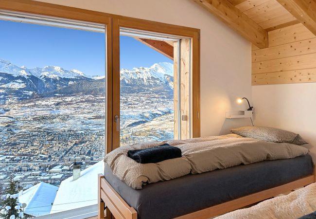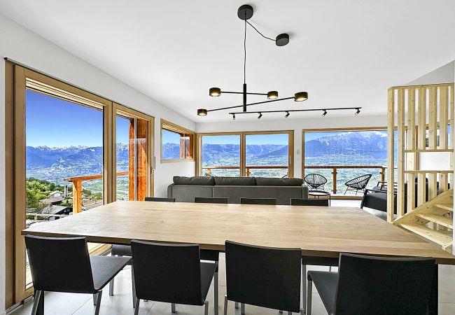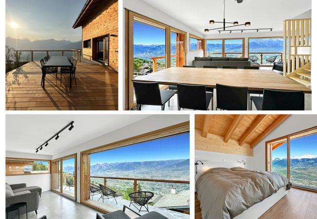 Willkommen im Chalet Commaraf, einem brandneuen modernen Chalet, eingebettet in einen Naturrahmen, mit einem atemberaubenden 180-Grad-Blick auf die Rhône-Ebene und die majestätischen Berner Alpen.