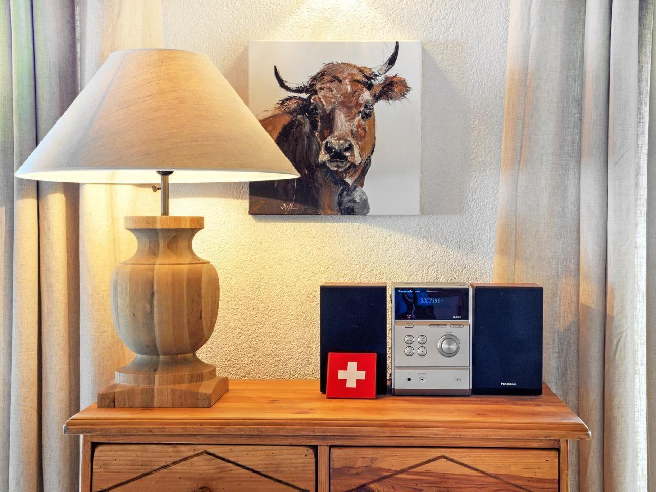 Allgemeine Wohnungsbeschreibung Küchenzeile (Spülmaschine + Kühlschrank mit Gefrierfach + E-Herd + Backofen + Mikrowelle mit Grill + Fondue-Set); Kaminofen; Kabel-TV (Flachbildschirm); DVD-Player; Stereoanlage mit CD-Player; Gratis-WLAN; Waschmaschine; Wäschetrockner; Terrasse; Balkon; elektrischer Skischuhtrockner