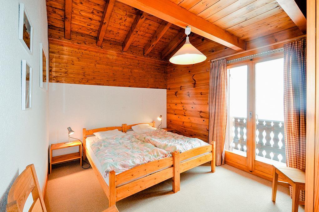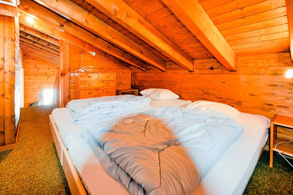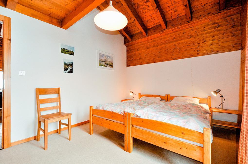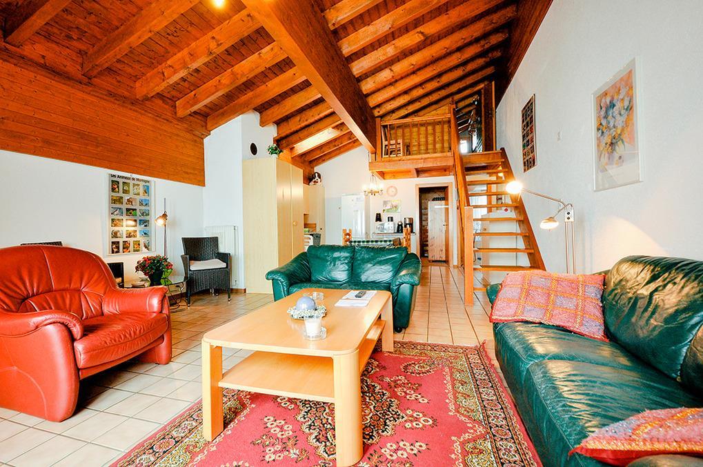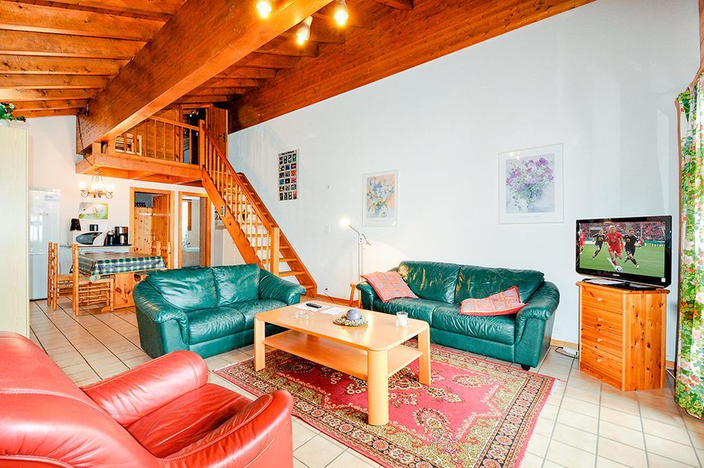 CH 431.65 Wohnungen 6-8 Pers.: 4-Zimmerwohnung, 113 qm Wohnfläche über 2 Etagen. 3. Etage: Großer, bis zum Dachgiebel ausgebauter Wohnraum mit Sitzgruppe, TV, Radio/CD, Esstisch, Küchenzeile (Backofen, Mikrowelle, Spülmaschine). Doppelzimmer. Bad: Bw/Du, Wb, WC. Vom Wohnraum Treppe ins Dachgeschoss (Schrägen): Schlafraum mit 2 Einzelbetten auf Galerie, offen zum Wohnraum. Doppelzimmer. 2-Bettzimmer. Bad: Du, Wb, WC. Süd-Balkon.