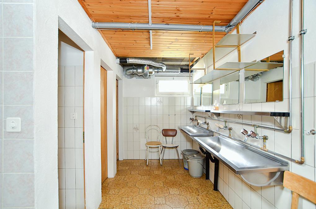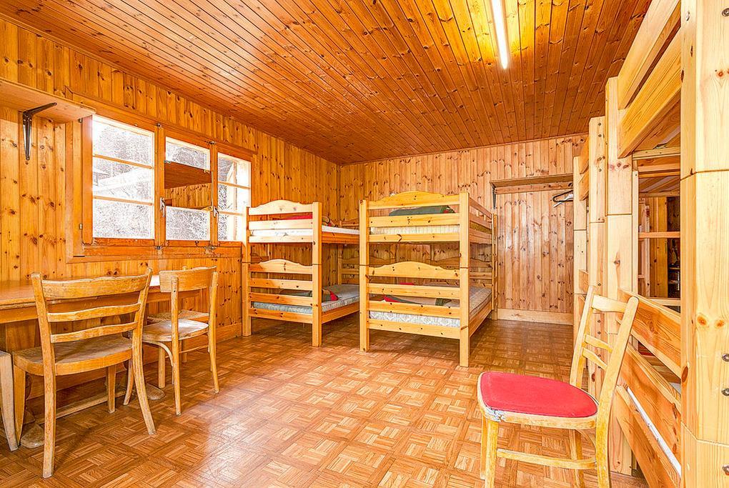 Parterre: Beheizter Skischuh-/Trockenraum. Gemütlicher, holzvertäfelter Tagesraum (ca. 48 qm) mit phantastischem Blick auf die Dents du Midi. Durchreiche zur guten Gruppenküche (Hotelherd 4 Flammen, Backofen, Spülmaschine). Vorratsraum mit Tiefkühltruhe. 2 Waschrinnen (8 Hähne) in Flurnische. 2 WC. Duschraum mit 4 Duschen, 2016 neu renoviert.