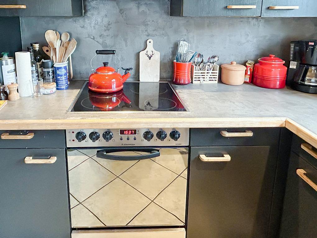 1. Etage: Schöner Wohnraum mit Sitzgarnitur, Smart-TV, Essecke, thekenartig abgetrennter Einbauküche (Backofen, Spülmaschine). Große, teils überdachte Terrasse. Doppelzimmer. Bad: Du, Wb, WC.