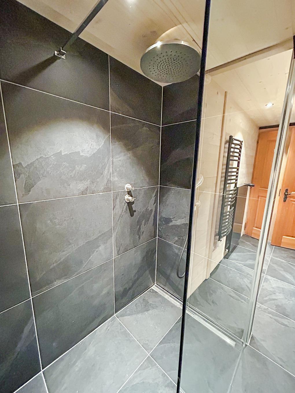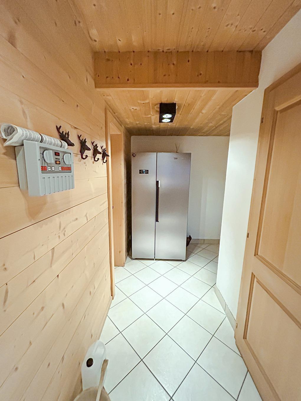 Parterre: Flur mit Skischuhregal, großem amerikanischem Kühl-/Gefrierschrank. Sauna. Zwei Doppelzimmer. Bad: Du, Wb, WC.