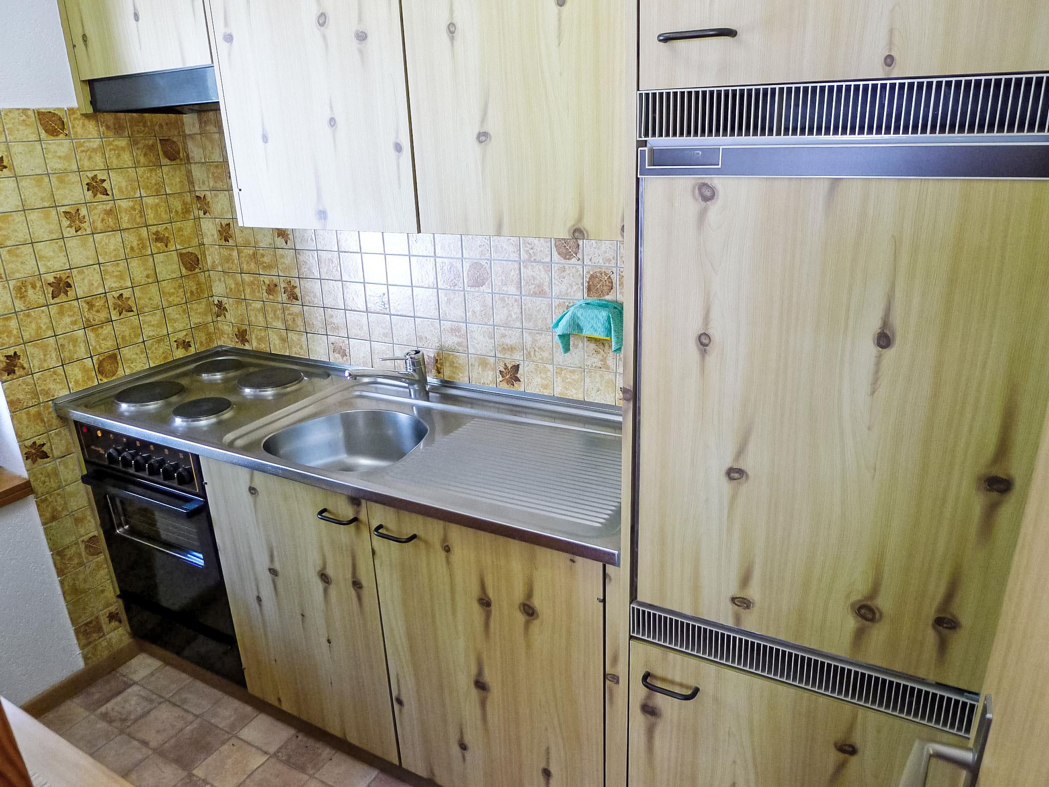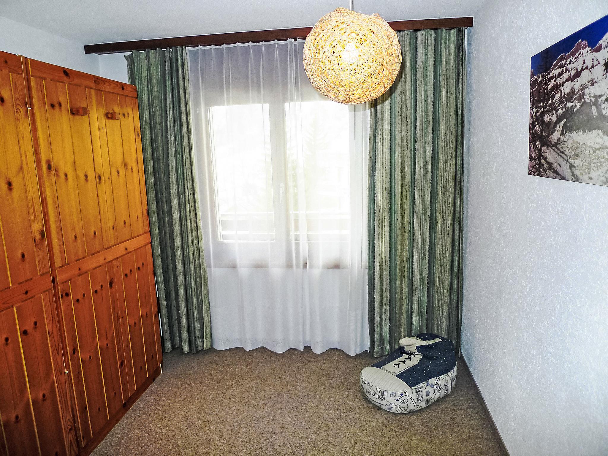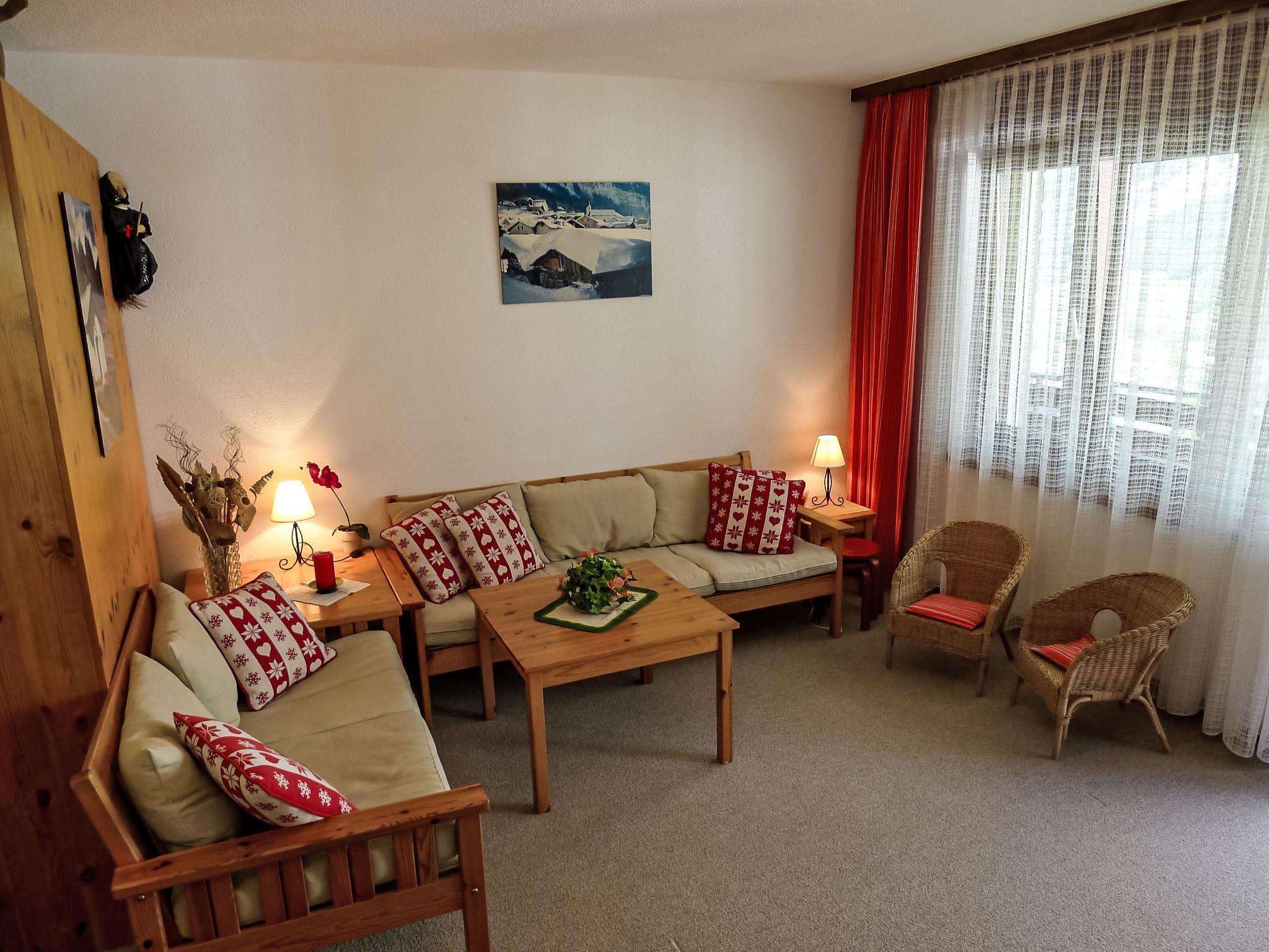 2-Zimmer-Wohnung 65 m2 im 3. Stock. Zweckmässig und gemütlich eingerichtet: Wohn-/Esszimmer mit 1 franz. Wandschrankbett (140 cm, Länge 190 cm), Esstisch und Kabel-TV (Flachbildschirm), Stereoanlage. Ausgang zum Balkon, Richtung Süden. 1 Zimmer mit 2 Wandschrankbetten. Küche (4 Kochplatten, Backofen, Mikrowelle, elektrische Kaffeemaschine). Bad/WC. Balkonmöbel, Liegestühle (2). Sehr schöne Sicht auf die Berge und die Ortschaft. Zur Verfügung: Babybett bis 2 Jahre. Internet (Wireless LAN, gratis). Parkplatz Nr. 10 (überdacht). Bitte beachten: Nichtraucher-Unterkunft.