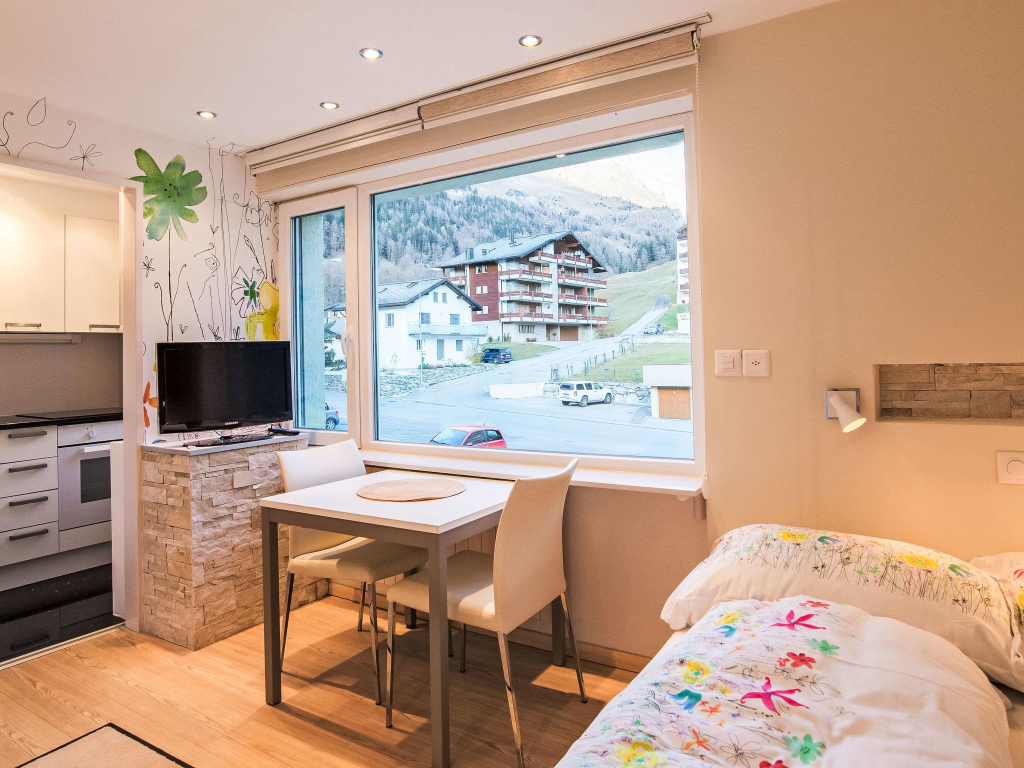 "Cristal 36", 1-Zimmer-Studio 18 m2 im 1. Stock. Renoviert, schön und gemütlich eingerichtet: Wohn-/Schlafzimmer mit 1 Doppelbett und Kabel-TV. Kleine Küche (Backofen, 3 Glaskeramikplatten, Wasserkocher, elektrische Kaffeemaschine). Dusche/WC. Parkettboden. Schöne Sicht auf die Berge. Zur Verfügung: Haartrockner. Internet (Wireless LAN, gratis). Bitte beachten: Nichtraucher-Unterkunft.