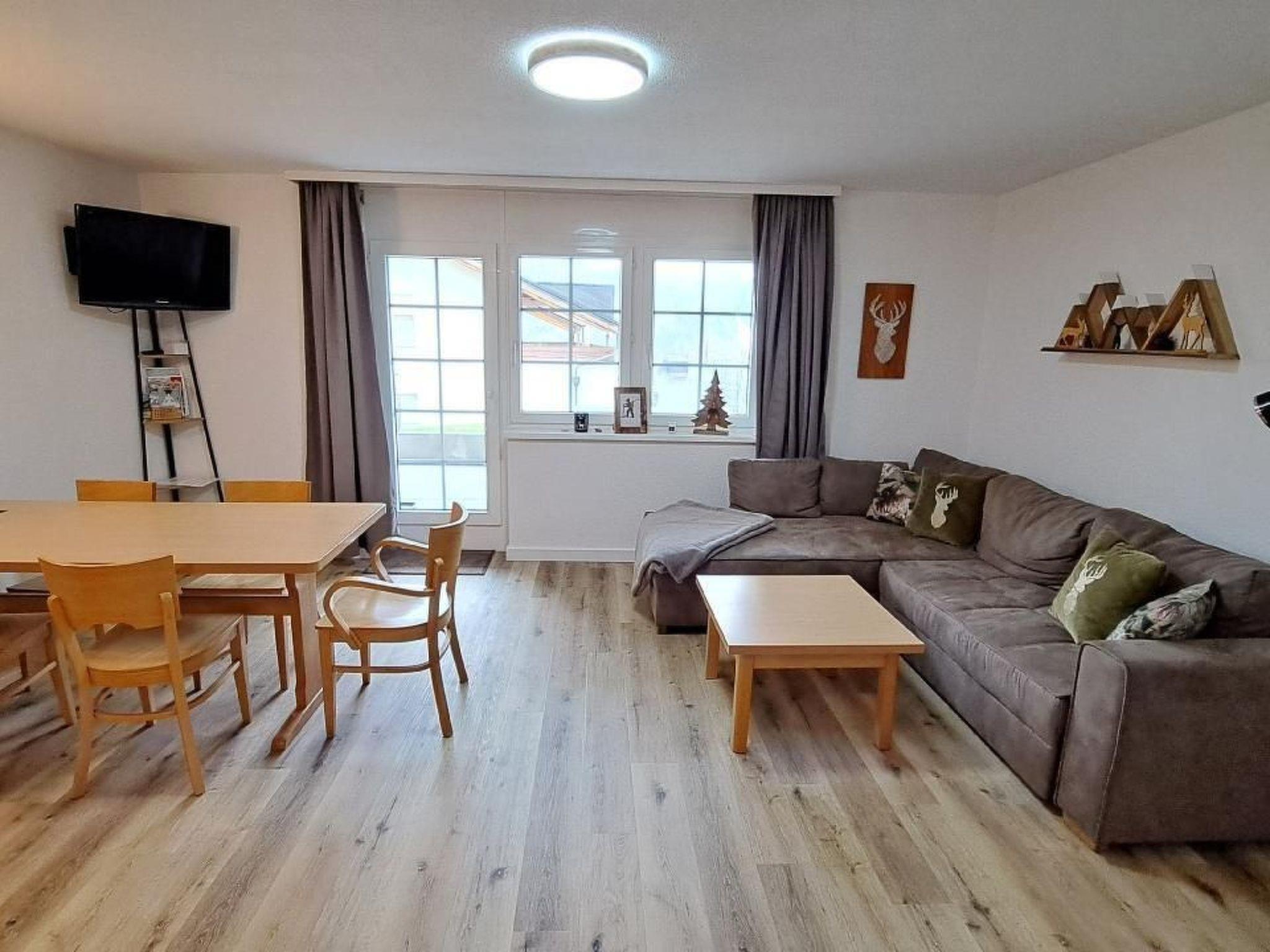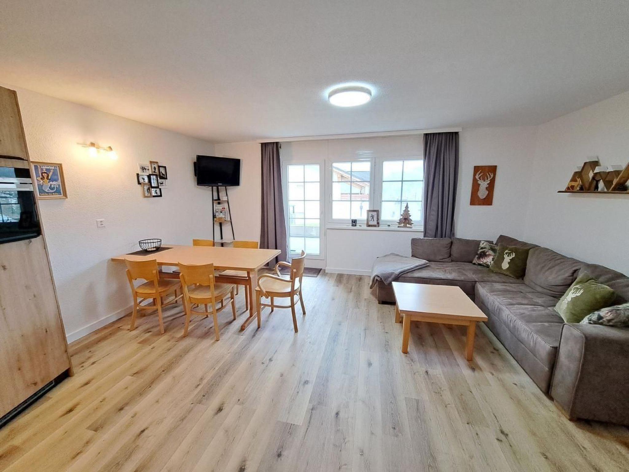 Wohnung 002 - 67 m2 Küche mit Kühlschrank, Backofen, Mikrowelle, Geschirrspüler, Kaffeemaschine (Filter), Wasserkocher, Toaster, Fondue-Set, Raclette-Set. Schlafzimmer 1: Etagenbetten 2x 90x200 cm, 1x 90x190 cm. Schlafzimmer 2: Doppelbett 180x200cm (2x 90x200cm). Badezimmer 1: Dusche, Handtuchtrockner, WC Badezimmer 2: Dusche und WC Wohn-/Esszimmer: Schlafsofa, TV, Essbereich für 5 Personen. 2 Terrassen mit Mobiliar und schöner Aussicht auf die Berge Waschküche, Skiraum. Parkplatz.