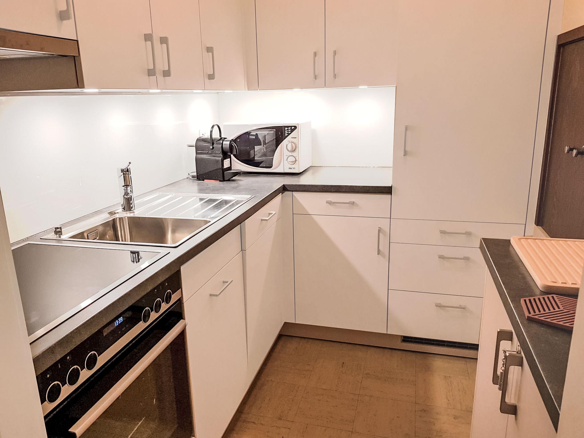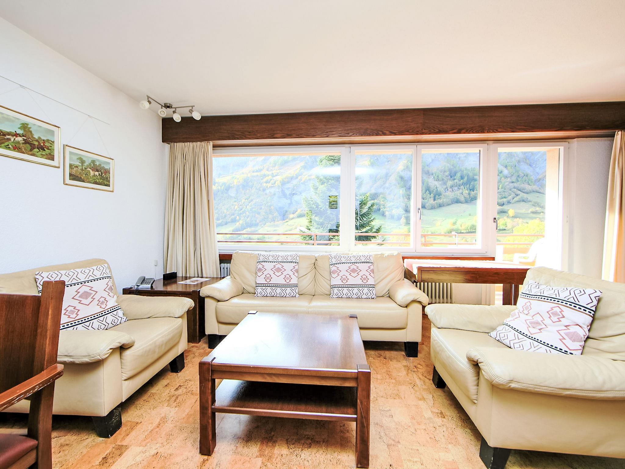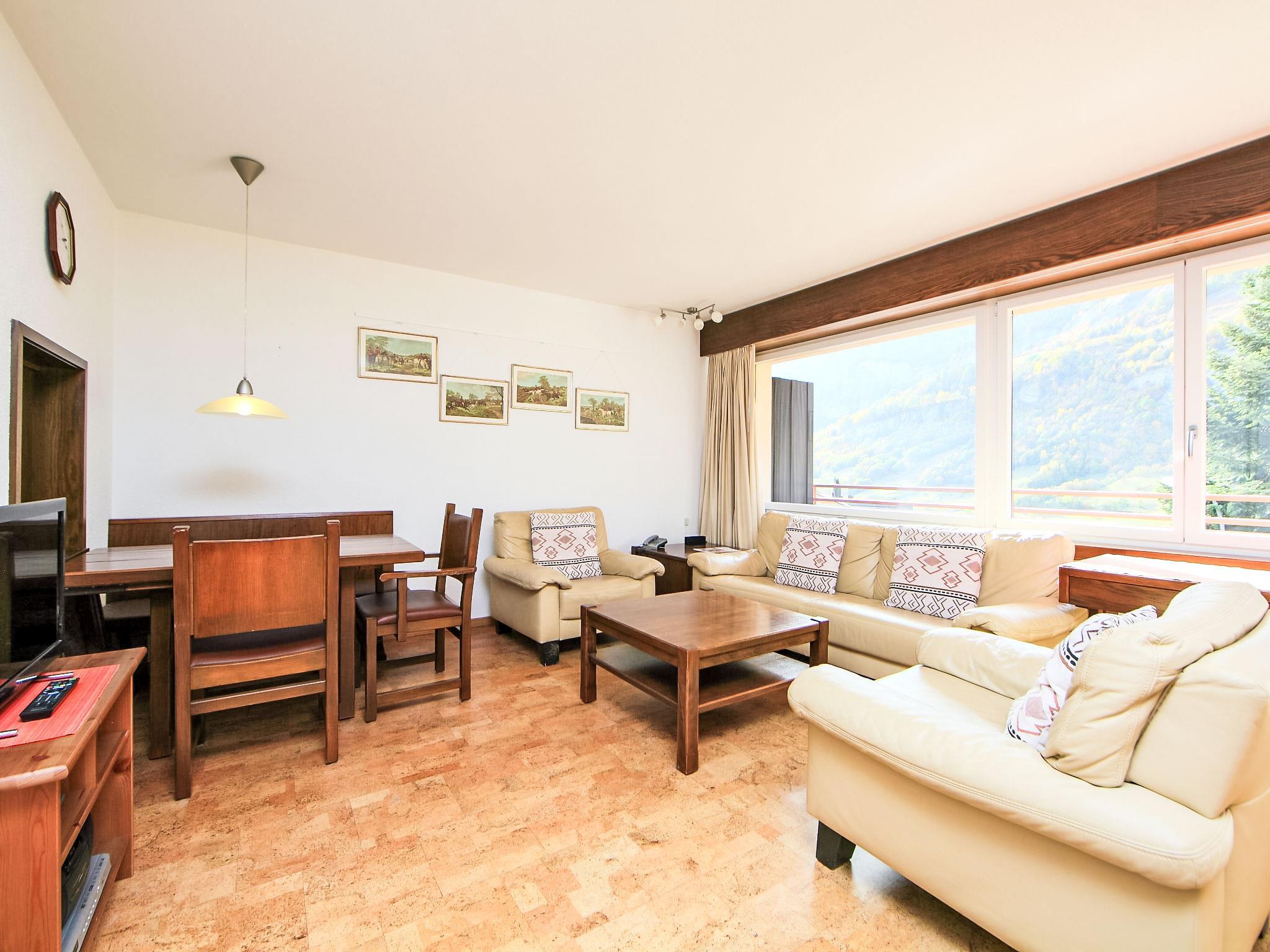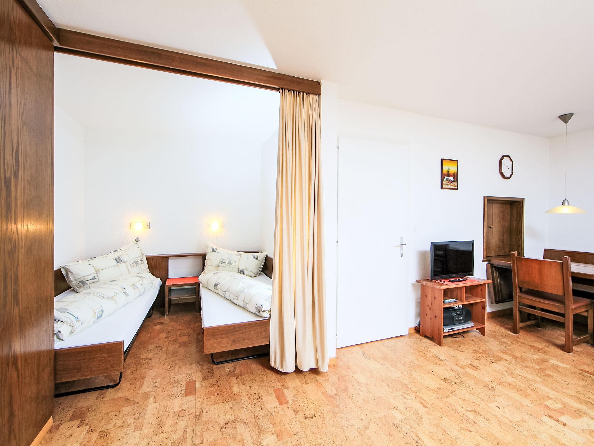 1-Zimmer-Wohnung 50 m2 im 2. Stock. Zweckmässig eingerichtet: Wohn-/Esszimmer mit 2 Wandschrankbetten und Kabel-TV (Flachbildschirm). Schlafnische mit Vorhang mit 2 Betten. Küche (Backofen, Geschirrspüler, 4 Glaskeramikplatten, Mikrowelle, elektrische Kaffeemaschine). Bad/WC. Balkon. Terrassenmöbel. Sicht auf die Berge und das Tal. Zur Verfügung: Internet (Wireless LAN, gratis). Bitte beachten: Nichtraucher-Unterkunft. Maximal 1 Haustier/Hund erlaubt. Anstelle eines abgeschlossenen Schlafzimmers befinden sich manche Schlafplätze in einem offenen Bereich (Galerie, Nische etc.).